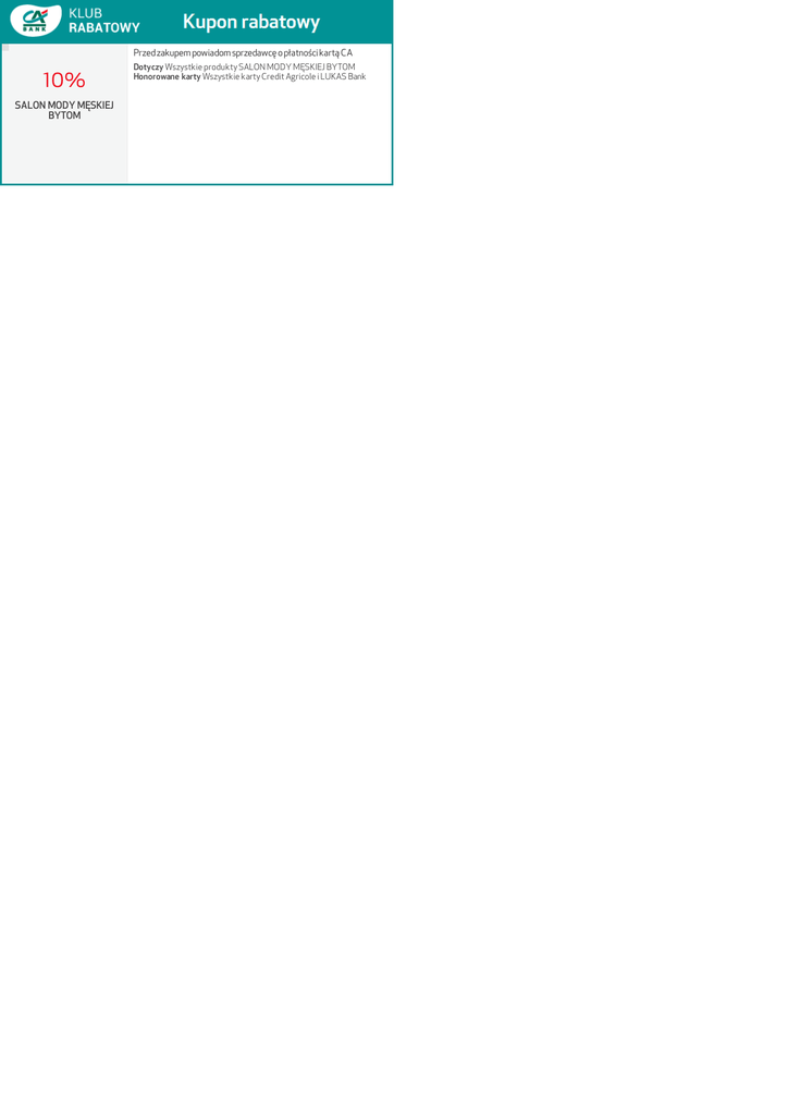 Przed zakupem powiadom sprzedawcę o płatności kartą CA 10% SALON MODY MĘSKIEJ BYTOM Dotyczy Wszystkie produkty SALON MODY MĘSKIEJ BYTOM Honorowane karty Wszystkie karty Credit Agricole i LUKAS Bank