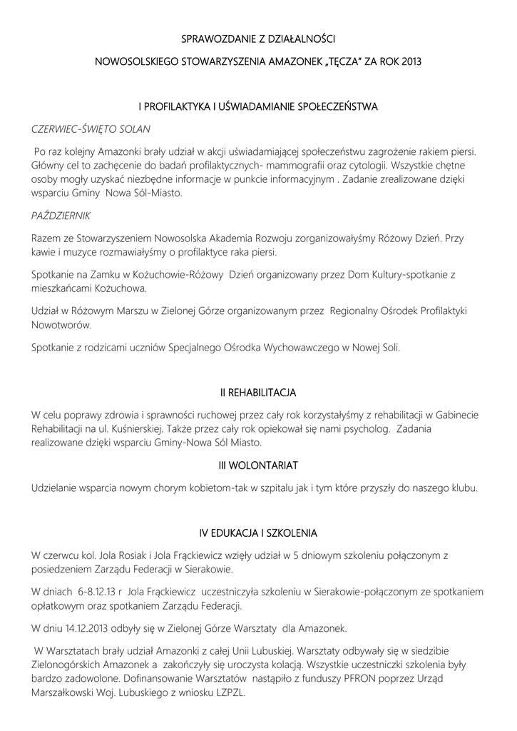 SPRAWOZDANIE Z DZIAŁALNOŚCI NOWOSOLSKIEGO STOWARZYSZENIA AMAZONEK „TĘCZA” ZA ROK 2013 I PROFILAKTYKA I UŚWIADAMIANIE SPOŁECZEŃSTWA CZERWIEC-ŚWIĘTO SOLAN Po raz kolejny Amazonki brały udział w akcji uświadamiającej społeczeństwu zagrożenie rakiem piersi. Główny cel to zachęcenie do badań profilaktycznych- mammografii oraz cytologii. Wszystkie chętne osoby mogły uzyskać niezbędne informacje w punkcie informacyjnym . Zadanie zrealizowane dzięki wsparciu Gminy Nowa Sól-Miasto. PAŹDZIERNIK Razem ze Stowarzyszeniem Nowosolska Akademia Rozwoju zorganizowałyśmy Różowy Dzień. Przy kawie i muzyce rozmawiałyśmy o profilaktyce raka piersi. Spotkanie na Zamku w Kożuchowie-Różowy Dzień organizowany przez Dom Kultury-spotkanie z mieszkańcami Kożuchowa. Udział w Różowym Marszu w Zielonej Górze organizowanym przez Regionalny Ośrodek Profilaktyki Nowotworów. Spotkanie z rodzicami uczniów Specjalnego Ośrodka Wychowawczego w Nowej Soli. II REHABILITACJA W celu poprawy zdrowia i sprawności ruchowej przez cały rok korzystałyśmy z rehabilitacji w Gabinecie Rehabilitacji na ul. Kuśnierskiej. Także przez cały rok opiekował się nami psycholog. Zadania realizowane dzięki wsparciu Gminy-Nowa Sól Miasto. III WOLONTARIAT Udzielanie wsparcia nowym chorym kobietom-tak w szpitalu jak i tym które przyszły do naszego klubu. IV EDUKACJA I SZKOLENIA W czerwcu kol. Jola Rosiak i Jola Frąckiewicz wzięły udział w 5 dniowym szkoleniu połączonym z posiedzeniem Zarządu Federacji w Sierakowie. W dniach 6-8.12.13 r Jola Frąckiewicz uczestniczyła szkoleniu w Sierakowie-połączonym ze spotkaniem opłatkowym oraz spotkaniem Zarządu Federacji. W dniu 14.12.2013 odbyły się w Zielonej Górze Warsztaty dla Amazonek. W Warsztatach brały udział Amazonki z całej Unii Lubuskiej. Warsztaty odbywały się w siedzibie Zielonogórskich Amazonek a zakończyły się uroczysta kolacją. Wszystkie uczestniczki szkolenia były bardzo zadowolone. Dofinansowanie Warsztatów nastąpiło z funduszy PFRON poprzez Urząd Marszałkowski Woj. Lubuskiego z wniosku LZPZL. V SPOTKANIA INTEGRACYJNE-PIELGRZYMKA W pierwszą sobotę października odbyła się Ogólnopolska Pielgrzymka Amazonek na Jasna Górę. Dzięki zaprzyjaźnionemu klubowi z Zielonej Góry chętne osoby mogły uczestniczyć w modlitwie i być razem z Maryją i jej synem tak blisko. VI JUBILEUSZE W bieżącym roku nie brałyśmy udziału w żadnych jubileuszach. VII INNE Maj Wyjazd nad morze-grupa Amazonek spędziła 8 dni nad morzem w Pustkowie-wyjazd finansowany przez uczestników. Wrzesień W Sławie po raz kolejny odbyły się Zawody Sportowe Amazonek z całego woj. Lubuskiego i nie tylko. Były także koleżanki z Głogowa i Legnicy, które należa do Lubuskiej Unii Amazonek. Wszyscy uczestnicy byli bardzo zadowoleni. Był czas na rywalizację, był czas na relaks oraz zabawę. Październik W dniu 24.10.13 r całą grupą poszłyśmy odwiedzić koleżanki które już od nas odeszły na zawsze – zapaliłyśmy im znicze na grobach. Grudzień 4 grudnia Pani Wanda Świdzińska z Nowosolskiej Akademii Rozwoju zaprosiła nas do udziału w Kiermaszu Mikołajkowym oraz nowosolskim Dniu Barbar w barze KAFLOWY. 13 grudnia w świetlicy na I piętrze naszego budynku odbyło się spotkanie opłatkowe. Przy suto zastawionym i pięknie nakrytym stole dzieląc się opłatkiem składałyśmy sobie życzenia zdrowia, pomyślności, wytrwałości i radości. Podziękowałyśmy kol. Joli-prezes Stowarzyszenia oraz kol. Heniowi upominkiem za całoroczną pracę na rzecz Stowarzyszenia. Wszyscy zostali obdarowani słodkościami. Gościliśmy na opłatku Janusza Wietrzyńskiego, Jadzię Binder, Martę Dąbrowską oraz Asię Zwarycz z rodziną. Wszystkie te działania mogłyśmy realizować dzięki wsparciu samorządów-przede wszystkim Gminie Nowa Sól- Miasto oraz Urzędowi Marszałkowskiemu, darczyńców a przede wszystkim ludziom dobrej woli, którzy przekazali nam jako OPP 1% podatku należnego. Skarbnik Maria Konieczka Prezes Jolanta Frąckiewicz