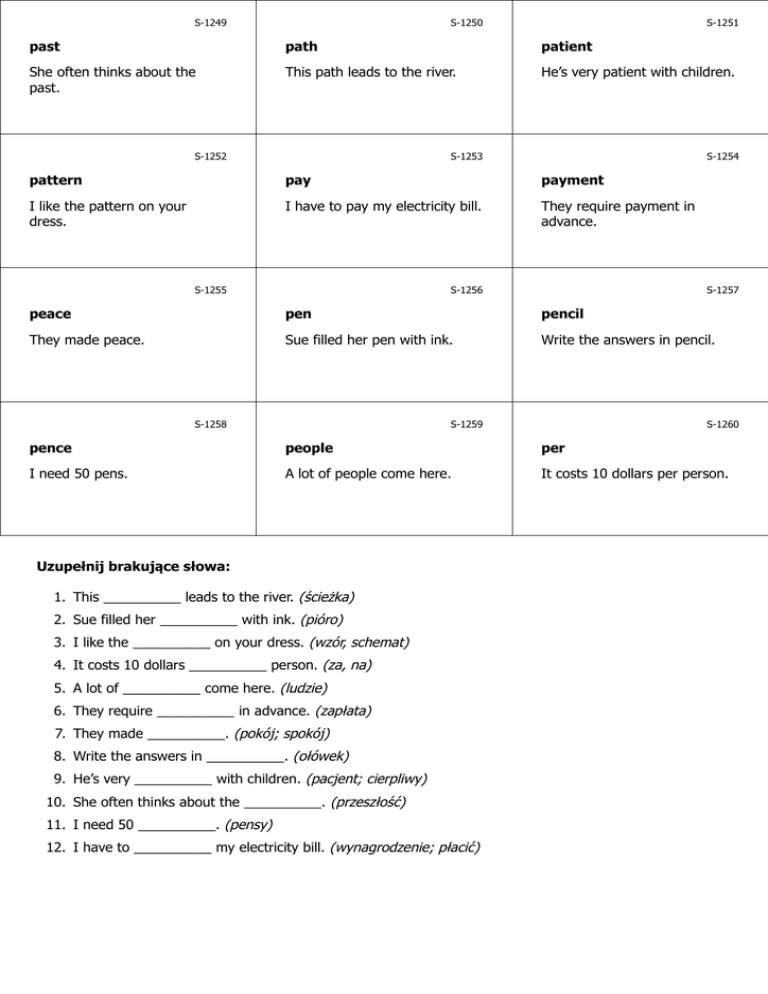 S-1249 S-1250 S-1251 past path patient She often thinks about the past. This path leads to the river. He’s very patient with children. S-1252 S-1253 S-1254 pattern pay payment I like the pattern on your dress. I have to pay my electricity bill. They require payment in advance. S-1255 S-1256 S-1257 peace pen pencil They made peace. Sue filled her pen with ink. Write the answers in pencil. S-1258 S-1259 S-1260 pence people per I need 50 pens. A lot of people come here. It costs 10 dollars per person. Uzupełnij brakujące słowa: 1. This __________ leads to the river. (ścieżka) 2. Sue filled her __________ with ink. (pióro) 3. I like the __________ on your dress. (wzór, schemat) 4. It costs 10 dollars __________ person. (za, na) 5. A lot of __________ come here. (ludzie) 6. They require __________ in advance. (zapłata) 7. They made __________. (pokój; spokój) 8. Write the answers in __________. (ołówek) 9. He’s very __________ with children. (pacjent; cierpliwy) 10. She often thinks about the __________. (przeszłość) 11. I need 50 __________. (pensy) 12. I have to __________ my electricity bill. (wynagrodzenie; płacić) S-1251 S-1250 S-1249 pacjent; cierpliwy ścieżka przeszłość Jest bardzo cierpliwy wobec dzieciach. Ta ścieżka prowadzi do rzeki. Ona często myśli o przeszłości. www.isel.edu.pl www.isel.edu.pl www.isel.edu.pl S-1254 S-1253 S-1252 zapłata wynagrodzenie; płacić wzór, schemat Wymagają zapłaty z góry. Muszę zapłacić rachunek za elektryczność/prąd. Podoba mi się wzór na twojej sukience. www.isel.edu.pl www.isel.edu.pl www.isel.edu.pl S-1257 S-1256 S-1255 ołówek pióro pokój; spokój Wpisz odpowiedzi ołówkiem. Sue napełniła pióro atramentem. Zawarli pokój. www.isel.edu.pl www.isel.edu.pl www.isel.edu.pl S-1260 S-1259 S-1258 za, na ludzie pensy To kosztuje 10 dolarów od osoby. Wiele ludzi tu przychodzi. Potrzebuję 50 pensów. www.isel.edu.pl Odpowiedzi: 1. path 2. pen 3. pattern 4. per 5. people 6. payment 7. peace 8. pencil 9. patient 10. past 11. pens 12. pay www.isel.edu.pl www.isel.edu.pl