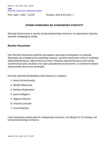 Prez. Adm. 1102 - 1/11/P Kraków, dnia 8.03.2011 r. WYNIKI