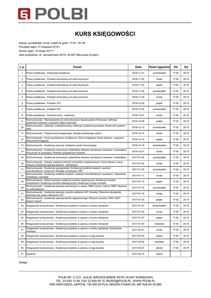 KURS KSIĘGOWOŚCI Edycja: poniedziałki, środy i piątki (w godz. 17:00 - 20:15) Początek zajęć: 21 listopada 2016 r. Koniec zajęć: 10 lutego 2017 r. Sala wykładowa: Al. Jerozolimskie 65/79, 00-697 Warszawa III piętro L.p. Temat Data Dzień tygodnia Od Do 1 Prawo podatkowe - Ordynacja podatkowa 2016-11-21 poniedziałek 17:00 20:15 2 Prawo podatkowe - Podatek dochodowy od osób fizycznych 2016-11-23 środa 17:00 20:15 3 Prawo podatkowe - Podatek dochodowy od osób fizycznych 2016-11-25 piątek 17:00 20:15 4 Prawo podatkowe - Podatek dochodowy od osób prawnych 2016-11-28 poniedziałek 17:00 20:15 5 Prawo podatkowe - Podatek dochodowy od osób prawnych 2016-11-30 środa 17:00 20:15 6 Prawo podatkowe - Podatek VAT 2016-12-02 piątek 17:00 20:15 7 Prawo podatkowe - Podatek VAT 2016-12-05 poniedziałek 17:00 20:15 8 Prawo podatkowe - Kontrola karno - skarbowa 2016-12-07 środa 17:00 20:15 2016-12-09 piątek 17:00 20:15 2016-12-12 poniedziałek 17:00 20:15 9 10 Rachunkowość - Wprowadzenie do rachunkowości; Sprawozdanie finansowe; Definicja składników aktywów i pasywów; Bilans jednostki Rachunkowość - Definicja i podział kosztów; Definicja i podział przychodów; Rachunek zysków i strat 11 Rachunkowość - Pojęcie konta księgowego; Zasada podwójnego zapisu 2016-12-14 środa 17:00 20:15 12 Rachunkowość - Konta syntetyczne i analityczne; Storno księgowe; Konta aktywno - pasywne; Dokumenty księgowe 2016-12-16 piątek 17:00 20:15 13 Rachunkowość - Ewidencja operacji; Ustalenie wyniku finansowego 2016-12-19 poniedziałek 17:00 20:15 14 Rachunkowość - Ewidencja rzeczowych składników aktywów obrotowych (towarów i materiałów); Przychody ze sprzedaży; Wartość sprzedanych towarów 2016-12-21 środa 17:00 20:15 15 Rachunkowość - Ewidencja rzeczowych składników aktywów obrotowych (towarów i materiałów) 2017-01-02 poniedziałek 17:00 20:15 2017-01-04 środa 17:00 20:15 2017-01-09 poniedziałek 17:00 20:15 2017-01-11 środa 17:00 20:15 2017-01-13 piątek 17:00 20:15 2017-01-16 poniedziałek 17:00 20:15 2017-01-18 środa 17:00 20:15 2017-01-20 piątek 17:00 20:15 16 17 18 19 20 21 22 Rachunkowość - Zasady ustalenia wartość rozchodów magazynowych; Cena zakupu a cena nabycia; Ewidencja operacji kasowo - bankowych Rachunkowość - Ewidencja wynagrodzeń; Ewidencja środków trwałych i wartości niematerialnych i prawnych; Rodzaje amortyzacji; KŚT Rachunkowość - Ewidencja środków trwałych i wartości niematerialnych i prawnych; Ulepszenia; Likwidacja i sprzedaż Rachunkowość - Różne sposoby ewidencji kosztów operacyjnych; Ewidencja kosztów rodzajowych; Ewidencja kosztów kalkulacyjnych; Ewidencja w kręgu kosztów Rachunkowość - Ewidencja operacji rozliczanych w czasie; RMK czynne i bierne; RMP; Rezerwy na zobowiązania Rachunkowość - Ewidencja operacji z punktu widzenia VAT; Korekty; Odwrotne obciążenie; Operacje bez prawa odliczenia VAT Rachunkowość - Ewidencja operacji handlu zagranicznego; Różnice kursowe; WNT; WDT; Export i import 23 Księgowość komputerowa - Ewidencja przykładu w oparciu o koszty rodzajowe 2017-01-23 poniedziałek 17:00 20:15 24 Księgowość komputerowa - Ewidencja przykładu w oparciu o koszty rodzajowe 2017-01-25 środa 17:00 20:15 25 Księgowość komputerowa - Ewidencja przykładu w oparciu o koszty rodzajowe 2017-01-27 piątek 17:00 20:15 26 Księgowość komputerowa - Ewidencja przykładu w oparciu o koszty rodzajowe 2017-01-29 niedziela 17:00 20:15 27 Księgowość komputerowa - Ewidencja przykładu w oparciu o koszty rodzajowe; Zamknięcie miesiąca 2017-02-01 środa 17:00 20:15 28 Księgowość komputerowa - Ewidencja przykładu w oparciu o krąg kosztów 2017-02-03 piątek 17:00 20:15 29 Księgowość komputerowa - Ewidencja przykładu w oparciu o krąg kosztów 2017-02-05 niedziela 17:00 20:15 30 Księgowość komputerowa - Ewidencja przykładu w oparciu o krąg kosztów 2017-02-07 wtorek 17:00 20:15 31 Egzamin 2017-02-10 piątek Uwagi: POLBI SP. Z O.O., ALEJE JEROZOLIMSKIE 65/79, 00-697 WARSZAWA TEL. 22 629 13 88, FAX 22 699 59 15, [email protected], WWW.POLBI.PL KRS 0000158253, KAPITAŁ 150 000,00 PLN, REGON 010494129, NIP 526-00-33-660