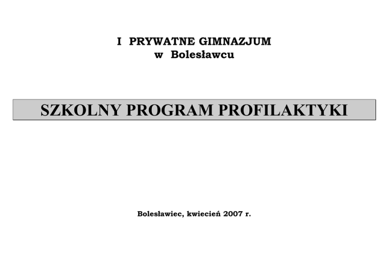 I PRYWATNE GIMNAZJUM w Bolesławcu SZKOLNY PROGRAM PROFILAKTYKI Bolesławiec, kwiecień 2007 r. WPROWADZENIE W związku ze zwiększającą się liczbą czynników destrukcyjnych oddziałujących na młodzież i stale wzrastającą liczbę osób poszukujących wsparcia w trudnych sytuacjach życiowych oraz w celu przeciwdziałania zjawiskom patologicznym konieczne jest podejmowanie działań profilaktycznych na terenie szkoły. Powstanie Szkolnego Programu Profilaktyki stało się zatem próbą walki z czyhającymi na młodzież współczesnymi zagrożeniami, a także dopełnieniem działań uwzględnionych w Programie Wychowawczym Szkoły. Rozporządzenie MENiS z dnia 31 stycznia 2002 r. zmieniające rozporządzenie w sprawie ramowych statutów przedszkoli oraz publicznych szkół (Dz.U. z 2002r.Nr 10, poz.96) wprowadza zapis o podejmowaniu przez rady pedagogiczne uchwał o wprowadzaniu programu profilaktycznego spójnego z programem wychowawczym szkoły. Podstawę prawną do wprowadzenia działań profilaktycznych stanowią także: Konstytucja Rzeczpospolitej Polskiej art. 72; Konwencja o Prawach Dziecka art. 3, art.19,art.33; Ustawa z dnia 7 września 1991 r. o systemie oświaty (Dz.U.z 1996r. nr 67,poz.329 z póź.zm.); Ustawa o ochronie zdrowia psychicznego z dnia 19 sierpnia 1994 r.; Ustawa z dnia 26 października 1982r. o wychowaniu w trzeźwości i przeciwdziałaniu alkoholizmowi; Ustawa z dnia 24 kwietnia 1997r. o przeciwdziałaniu narkomanii; Ustawa z dnia 9 listopada 1995r. o ochronie zdrowia przed następstwami używania tytoniu i wyrobów tytoniowych. Działania profilaktyczne w środowisku szkolnym pozostają w ścisłym związku z działaniami wychowawczymi jakie szkoła prowadzi. Wychowanie rozumiane jest jako proces wspomagania dziecka w rozwoju ukierunkowanym na osiągnięcie dojrzałości w czterech obszarach: fizycznym psychicznym społecznym duchowym Natomiast profilaktyka, która jest wtórna wobec wychowania, to proces wspomagania człowieka w radzeniu sobie z trudnościami zagrażającymi prawidłowemu rozwojowi i zdrowemu życiu, a także ograniczenie i likwidowanie czynników, które blokują prawidłowy rozwój i zaburzają zdrowe życie. Podmiotem oddziaływań ujętych w Szkolnym Programie Profilaktyki jest młodzież gimnazjalna. Nastolatek odczuwa naturalną potrzebę bycia akceptowanym przez rówieśników a obawy przed dezakceptacją i odrzuceniem skłaniają go do poddawania się wpływom grupy. Wyraźniejsze też staje się pragnienie bycia dorosłym. Zwiększa się łatwość do zachowań dysfunkcjonalnych. Nie zakończony jeszcze rozwój biologiczny, intelektualny, emocjonalny i społeczny powoduje, że negatywne konsekwencje zachowań ryzykownych u młodzieży są zazwyczaj poważniejsze i występują szybciej niż u dorosłych. Dlatego niezwykle istotne staje się, by poprzez różnorodne działania eliminować lub redukować czynniki ryzyka a jednocześnie wzmacniać czynniki chroniące młodzież przed podejmowaniem zachowań ryzykownych. Cele i zadania ujęte w Szkolnym Programie Profilaktyki zostały sformułowane w oparciu o diagnozę środowiska szkolnego. Została ona sporządzona na podstawie: 1.ankiet przeprowadzonych wśród: uczniów (dot. problemów współczesnej młodzieży, zjawiska przemocy, problemu uzależnień), rodziców (dot. zagrożeń występujących w środowisku szkolnym, oczekiwań kierowanych wobec szkoły, zjawiska przemocy), nauczycieli (dot. słabych i mocnych stron szkoły, problemu przemocy) 2.obserwacji i rozmów, 3.analizy dokumentacji szkolnej. CELE DZIAŁAŃ PROFILAKTYCZNYCH: 1.Tworzenie środowiska korzystnego dla wszechstronnego rozwoju uczniów: Uczeń: a. ma zapewnione poczucie przynależności i akceptacji, nie jest anonimowy w środowisku szkolnym, b. jest traktowany indywidualnie, stawiane wymagania są dostosowane do jego możliwości, c. ma możliwość zaspokojenia własnej aktywności i współpracy w grupie, d. rozwija swoje naturalne uzdolnienia i zainteresowania, e. ma zapewnione w szkole odpowiednie warunki do prawidłowego funkcjonowania. 2.Promocja zdrowego stylu życia Uczeń: a. wytycza sobie pozytywne i atrakcyjne cele w życiu, b. zna zasady zdrowego stylu życia, c. postrzega swoje zdrowie fizyczne i psychiczne jako wartość i dba o nie, d. aktywnie i twórczo spędza czas wolny. 3.Rozwój umiejętności psychologicznych i społecznych: Uczeń: a. zna swoje mocne strony, ma poczucie własnej wartości, darzy siebie szacunkiem, b. akceptuje siebie i jest tolerancyjny wobec innych, c. potrafi nawiązywać pozytywne więzi z otoczeniem, d. potrafi wyrażać swoje myśli, poglądy i opinie, e. jest wrażliwy, potrafi wczuć się w przeżycia innych osób, f. umiejętnie radzi sobie z presją rówieśników – jest asertywny, g. zna sposoby radzenia sobie ze stresem i sytuacjami trudnymi, h. jest odpowiedzialny za własne postępowanie i dokonywane wybory, i. potrafi współdziałać w zespole. 4.Dostarczenie podstawowej wiedzy dot. problemu uzależnień: Uczeń: a. posiada wiedzę o specyfice i chemicznej naturze poszczególnych środków odurzających, b. rozumie istotę wpływu alkoholu, nikotyny i innych środków odurzających na organizm człowieka, c. rozumie, w jaki sposób środki odurzające wpływają na sprawność koordynacji psychoruchowej, d. wie, co to jest uzależnienie i jaki ma ono wpływ na życie jednostki, rodziny, społeczeństwa, e. zna metody społeczne stosowane w zwalczaniu patologii, f. zna przepisy prawne dot. środków odurzających i ich używania. 5.Tworzenie szkolnego systemu udzielenia wsparcia osobom zagrożonym niedostosowaniem społecznym Uczeń: a. wie gdzie, u kogo i w jakim zakresie może uzyskać pomoc, b. potrafi udzielić wsparcia rówieśnikowi znajdującemu się w sytuacji problemowej, c. ma zapewnioną pomoc w przezwyciężaniu kryzysów rozwojowych, powstających na tle konfliktów rówieśniczych, rodzinnych, niepowodzeń szkolnych. Program obejmuje
