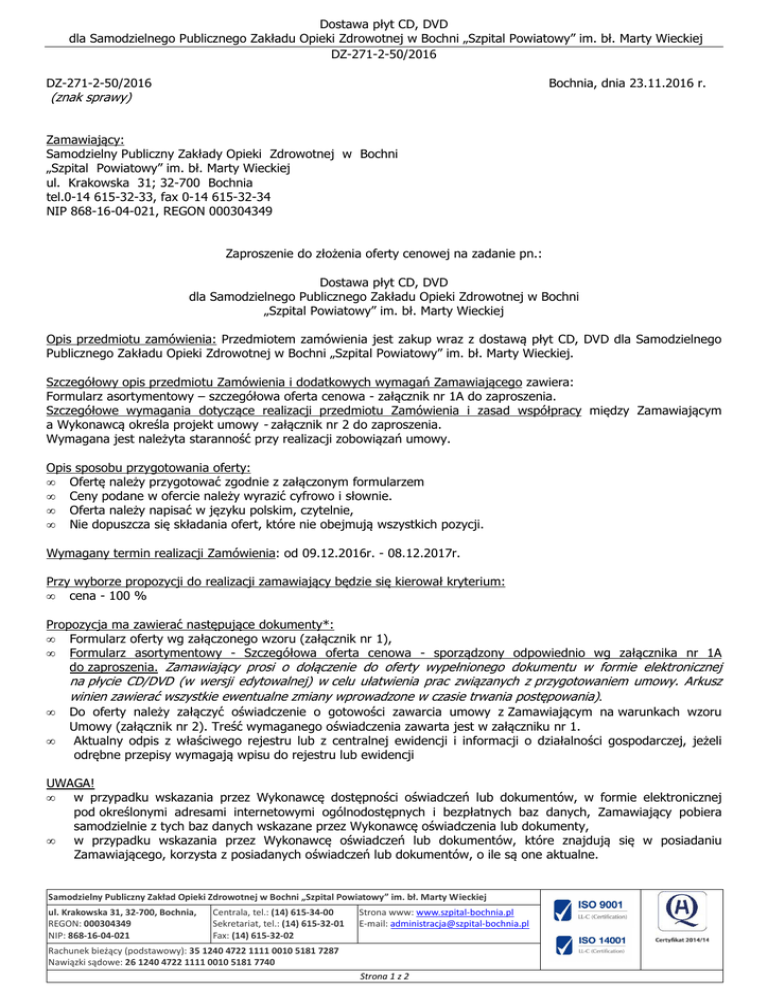 Dostawa płyt CD, DVD dla Samodzielnego Publicznego Zakładu Opieki Zdrowotnej w Bochni „Szpital Powiatowy” im. bł. Marty Wieckiej DZ-271-2-50/2016 DZ-271-2-50/2016 Bochnia, dnia 23.11.2016 r. (znak sprawy) Zamawiający: Samodzielny Publiczny Zakłady Opieki Zdrowotnej w Bochni „Szpital Powiatowy” im. bł. Marty Wieckiej ul. Krakowska 31; 32-700 Bochnia tel.0-14 615-32-33, fax 0-14 615-32-34 NIP 868-16-04-021, REGON 000304349 Zaproszenie do złożenia oferty cenowej na zadanie pn.: Dostawa płyt CD, DVD dla Samodzielnego Publicznego Zakładu Opieki Zdrowotnej w Bochni „Szpital Powiatowy” im. bł. Marty Wieckiej Opis przedmiotu zamówienia: Przedmiotem zamówienia jest zakup wraz z dostawą płyt CD, DVD dla Samodzielnego Publicznego Zakładu Opieki Zdrowotnej w Bochni „Szpital Powiatowy” im. bł. Marty Wieckiej. Szczegółowy opis przedmiotu Zamówienia i dodatkowych wymagań Zamawiającego zawiera: Formularz asortymentowy – szczegółowa oferta cenowa - załącznik nr 1A do zaproszenia. Szczegółowe wymagania dotyczące realizacji przedmiotu Zamówienia i zasad współpracy między Zamawiającym a Wykonawcą określa projekt umowy - załącznik nr 2 do zaproszenia. Wymagana jest należyta staranność przy realizacji zobowiązań umowy. Opis sposobu przygotowania oferty: • Ofertę należy przygotować zgodnie z załączonym formularzem • Ceny podane w ofercie należy wyrazić cyfrowo i słownie. • Oferta należy napisać w języku polskim, czytelnie, • Nie dopuszcza się składania ofert, które nie obejmują wszystkich pozycji. Wymagany termin realizacji Zamówienia: od 09.12.2016r. - 08.12.2017r. Przy wyborze propozycji do realizacji zamawiający będzie się kierował kryterium: • cena - 100 % Propozycja ma zawierać następujące dokumenty*: • Formularz oferty wg załączonego wzoru (załącznik nr 1), • Formularz asortymentowy - Szczegółowa oferta cenowa - sporządzony odpowiednio wg załącznika nr 1A do zaproszenia. Zamawiający prosi o dołączenie do oferty wypełnionego dokumentu w formie elektronicznej na płycie CD/DVD (w wersji edytowalnej) w celu ułatwienia prac związanych z przygotowaniem umowy. Arkusz winien zawierać wszystkie ewentualne zmiany wprowadzone w czasie trwania postępowania). • • Do oferty należy załączyć oświadczenie o gotowości zawarcia umowy z Zamawiającym na warunkach wzoru Umowy (załącznik nr 2). Treść wymaganego oświadczenia zawarta jest w załączniku nr 1. Aktualny odpis z właściwego rejestru lub z centralnej ewidencji i informacji o działalności gospodarczej, jeżeli odrębne przepisy wymagają wpisu do rejestru lub ewidencji UWAGA! • w przypadku wskazania przez Wykonawcę dostępności oświadczeń lub dokumentów, w formie elektronicznej pod określonymi adresami internetowymi ogólnodostępnych i bezpłatnych baz danych, Zamawiający pobiera samodzielnie z tych baz danych wskazane przez Wykonawcę oświadczenia lub dokumenty, • w przypadku wskazania przez Wykonawcę oświadczeń lub dokumentów, które znajdują się w posiadaniu Zamawiającego, korzysta z posiadanych oświadczeń lub dokumentów, o ile są one aktualne. Samodzielny Publiczny Zakład Opieki Zdrowotnej w Bochni „Szpital Powiatowy” im. bł. Marty Wieckiej ul. Krakowska 31, 32-700, Bochnia, REGON: 000304349 NIP: 868-16-04-021 Centrala, tel.: (14) 615-34-00 Sekretariat, tel.: (14) 615-32-01 Fax: (14) 615-32-02 Strona www: www.szpital-bochnia.pl E-mail: [email protected] Rachunek bieżący (podstawowy): 35 1240 4722 1111 0010 5181 7287 Nawiązki sądowe: 26 1240 4722 1111 0010 5181 7740 Strona 1 z 2 Dostawa płyt CD, DVD dla Samodzielnego Publicznego Zakładu Opieki Zdrowotnej w Bochni „Szpital Powiatowy” im. bł. Marty Wieckiej DZ-271-2-50/2016 Opis sposobu obliczania ceny w składanej propozycji cenowej: W cenę propozycji należy wliczyć: • Wartość dostawy określoną w oparciu o przedmiot zamówienia, • Obowiązujący podatek od towarów i usług. Cena podana przez zleceniobiorcę za świadczoną dostawę/usługę/robotę budowlaną jest obowiązująca przez okres ważności umowy i nie będzie podlegała waloryzacji w okresie jej trwania. Zamawiający wybierze ofertę odpowiadającą wszystkim postawionym przez niego wymogom i o najniższej cenie. Cena ofertowa jest ceną brutto i powinna obejmować wynagrodzenie za wszystkie obowiązki przyszłego Wykonawcy, niezbędne do zrealizowania przedmiotu zamówienia. Oznacza to, że cena ta musi zawierać wszystkie koszty związane z realizacją dostawy wynikające wprost, jak również nie ujęte a niezbędne do wykonania zadania tj. podatek VAT, koszty dostarczenia przedmiotu zamówienia do Zamawiającego. • Dla porównania ofert Zamawiający przyjmie cenę brutto obejmującą podatek od towarów i usług (VAT) za całość zamówienia. Określenie stawki podatku VAT jest obowiązkiem Wykonawcy. Cenę oferty należy podać w złotych polskich netto i brutto z uwzględnieniem stawki podatku VAT w „Ofercie cenowej (załącznik nr 1 do zaproszenia)” z zaokrągleniem do dwóch miejsc po przecinku. • Wszelkie rozliczenia związane z realizacją niniejszego zamówienia dokonywane będą w walucie polskiej Miejsce i termin złożenia oferty: Ofertę należy złożyć do dnia 29.11.2016 do godziny 14:00 w siedzibie Zamawiającego lub przesłać faksem na numer 14 615 32 34 lub drogą elektroniczną na adres [email protected] (liczy się data i godzina wpływu do Zamawiającego) Osobami uprawnionymi do kontaktów z wykonawcami z ramienia zamawiającego są: Zamawiający zaleca przesyłanie ewentualnych zapytań dotyczących treści zaproszenia drogą email w formacie WORD na adres [email protected], tel./fax (0-14) 615-32-33/34 Godziny pracy Zamawiającego - 7:30 - 15:05 Informacje dotyczące zawierania umowy: Po dokonanym wyborze najkorzystniejszej oferty wybrany Wykonawca podpisze umowę w terminie i miejscu określonym przez Zamawiającego wg. projektu sta