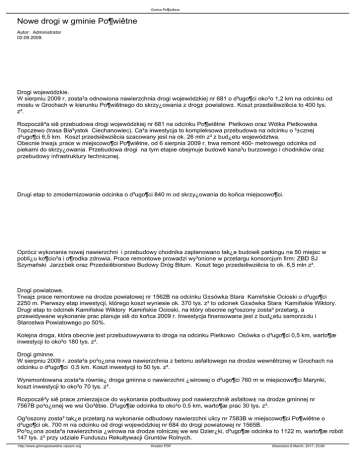 Gmina Po¶wiêtne Nowe drogi w gminie Po¶wiêtne Autor: Administrator 02.09.2009. Drogi wojewódzkie. W sierpniu 2009 r. zosta³a odnowiona nawierzchnia drogi wojewódzkiej nr 681 o d³ugo¶ci oko³o 1,2 km na odcinku od mostu w Grochach w kierunku Po¶wiêtnego do skrzy¿owania z drog± powiatow±. Koszt przedsiêwziêcia to 400 tys. z³. Rozpoczê³a siê przebudowa drogi wojewódzkiej nr 681 na odcinku Po¶wiêtne Pietkowo oraz Wólka Pietkowska Topczewo (trasa Bia³ystok Ciechanowiec). Ca³a inwestycja to kompleksowa przebudowa na odcinku o ³±cznej d³ugo¶ci 6,5 km. Koszt przedsiêwziêcia szacowany jest na ok. 26 mln z³ z bud¿etu województwa. Obecnie trwaj± prace w miejscowo¶ci Po¶wiêtne, od 6 sierpnia 2009 r. trwa remont 400- metrowego odcinka od piekarni do skrzy¿owania. Przebudowa drogi na tym etapie obejmuje budowê kana³u burzowego i chodników oraz przebudowy infrastruktury technicznej. Drugi etap to zmodernizowanie odcinka o d³ugo¶ci 840 m od skrzy¿owania do koñca miejscowo¶ci. Oprócz wykonania nowej nawierzchni i przebudowy chodnika zaplanowano tak¿e budowê parkingu na 50 miejsc w pobli¿u ko¶cio³a i o¶rodka zdrowia. Prace remontowe prowadzi wy³onione w przetargu konsorcjum firm: ZBD SJ Szymañski Jarz±bek oraz Przedsiêbiorstwo Budowy Dróg Bitum. Koszt tego przedsiêwziêcia to ok. 6,5 mln z³. Drogi powiatowe. Trwaj± prace remontowe na drodze powiatowej nr 1562B na odcinku G±sówka Stara Kamiñskie Ocioski o d³ugo¶ci 2250 m. Pierwszy etap inwestycji, którego koszt wyniesie ok. 370 tys. z³ to odcinek G±sówka Stara Kamiñskie Wiktory. Drugi etap to odcinek Kamiñskie Wiktory Kamiñskie Ocioski, na który obecnie og³oszony zosta³ przetarg, a przewidywane wykonanie prac planuje siê do koñca 2009 r. Inwestycja finansowana jest z bud¿etu samorz±du i Starostwa Powiatowego po 50%. Kolejna droga, która obecnie jest przebudowywana to droga na odcinku Pietkowo Osówka o d³ugo¶ci 0,5 km, warto¶æ inwestycji to oko³o 180 tys. z³. Drogi gminne. W sierpniu 2009 r. zosta³a po³o¿ona nowa nawierzchnia z betonu asfaltowego na drodze wewnêtrznej w Grochach na odcinku o d³ugo¶ci 0,5 km. Koszt inwestycji to 50 tys. z³. Wyremontowana zosta³a równie¿ droga gminna o nawierzchni ¿wirowej o d³ugo¶ci 760 m w miejscowo¶ci Marynki, koszt inwestycji to oko³o 70 tys. z³. Rozpoczê³y siê prace zmierzaj±ce do wykonania podbudowy pod nawierzchniê asfaltow± na drodze gminnej nr 7567B po³o¿onej we wsi Go³êbie. D³ugo¶æ odcinka to oko³o 0,5 km, warto¶æ prac 30 tys. z³. Og³oszony zosta³ tak¿e przetarg na wykonanie odbudowy nawierzchni ulicy nr 7583B w miejscowo¶ci Po¶wiêtne o d³ugo¶ci ok. 700 m na odcinku od drogi wojewódzkiej nr 684 do drogi powiatowej nr 1565B. Po³o¿ona zosta³a nawierzchnia ¿wirowa na drodze rolniczej we wsi Dzier¿ki, d³ugo¶æ odcinka to 1122 m, warto¶æ robót 147 tys. z³ przy udziale Funduszu Rekultywacji Gruntów Rolnych. http://www.gminaposwietne.vipserv.org Kreator PDF Utworzono 8 March, 2017, 23:00 Gmina Po¶wiêtne http://www.gminaposwietne.vipserv.org Kreator PDF Utworzono 8 March, 2017, 23:00