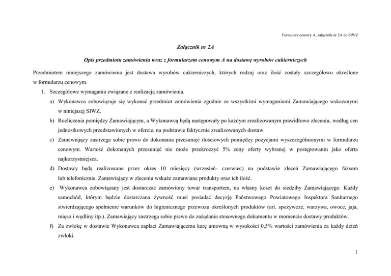 Formularz cenowy A, załącznik nr 2A do SIWZ Załącznik nr 2A Opis przedmiotu zamówienia wraz z formularzem cenowym A na dostawę wyrobów cukierniczych Przedmiotem niniejszego zamówienia jest dostawa wyrobów cukierniczych, których rodzaj oraz ilość zostały szczegółowo określone w formularzu cenowym. 1. Szczegółowe wymagania związane z realizacją zamówienia. a) Wykonawca zobowiązuje się wykonać przedmiot zamówienia zgodnie ze wszystkimi wymaganiami Zamawiającego wskazanymi w niniejszej SIWZ. b) Rozliczenia pomiędzy Zamawiającym, a Wykonawcą będą następowały po każdym zrealizowanym prawidłowo zleceniu, według cen jednostkowych przedstawionych w ofercie, na podstawie faktycznie zrealizowanych dostaw. c) Zamawiający zastrzega sobie prawo do dokonania przesunięć ilościowych pomiędzy pozycjami wyszczególnionymi w formularzu cenowym. Wartość dokonanych przesunięć nie może przekroczyć 5% ceny oferty wybranej w postępowaniu jako oferta najkorzystniejsza. d) Dostawy będą realizowane przez okres 10 miesięcy (wrzesień- czerwiec) na podstawie zleceń Zamawiającego faksem lub telefonicznie. Zamawiający w zleceniu wskaże zamawiane produkty oraz ich ilość. e) Wykonawca zobowiązany jest dostarczać zamówiony towar transportem, na własny koszt do siedziby Zamawiającego. Każdy samochód, którym będzie dostarczana żywność musi posiadać decyzję Państwowego Powiatowego Inspektora Sanitarnego stwierdzającego spełnienie warunków do higienicznego przewozu określonych produktów (art. spożywcze, warzywa, owoce, jaja, mięso i wędliny itp.). Zamawiający zastrzega sobie prawo do zażądania stosownego dokumentu w momencie dostawy produktów. f) Za zwłokę w dostawie Wykonawca zapłaci Zamawiającemu karę umowną w wysokości 0,5% wartości zamówienia za każdy dzień zwłoki. 1 Formularz cenowy A, załącznik nr 2A do SIWZ g) Termin ważności towarów nie może być końcowym terminem przydatności do spożycia określonym przez producenta. Wykonawca zobowiązuje się do zaopatrywania Zamawiającego w artykuły spożywcze w pierwszym gatunku, których termin ważności upływa nie wcześniej niż 5 dni po dacie dostawy. h) Jakość przyjmowanego surowca musi odpowiadać wymaganiom jakościowym określonym w umowie, w przeciwnym wypadku będzie zwrócony dostawcy i fakt ten odnotowany będzie w formularzu reklamacyjnym. i) W przypadku stwierdzenia przez Zamawiającego wadliwej partii dostarczonego towaru, reklamacja zostanie zgłoszona telefonicznie. Wykonawca zobowiązuje się do jego wymiany na towar wolny od wad w ciągu 3 godzin, w ilościach zakwestionowanych przez Zamawiającego. 2 Formularz cenowy A, załącznik nr 2A do SIWZ FORMULARZ CENOWY A – wyroby cukiernicze VAT Lp. Artykuł Jednostka Miary Roczne zapotrzebowanie (ilość) 1. Baton typu MILKY WAY* 21,5 g Baton typu KIT-KAT* 40 g szt. 1800 szt. 1800 szt. 3000 5. Baton typu KINDER MAXI* 21g Baton typu Snikers* 51g szt. 2400 6. Wafel typu Knoppers* 25g szt. 1200 7. Czekolada typu Wedel*100 g szt. 600 8. szt. 1200 szt. 600 10 Herbatniki Petit-Beurre* 100 g Wafel typu Princessa MAXI* 49 g Wafel typu Grzesiek* 39 g szt. 3000 11. Wafle typu SKAWA* 80 g szt. 2100 12. Baton typu KINDER BUENO* 2 X 21,5 g = 43 g Ciastko typu Pepitki Lubisie* szt. 1500 szt. 600 2. 3. 9. 13. Cena jednostkowa netto Wartość netto Stawka podatku Kwota podatku Wartość Brutto RAZEM: 3 Uwaga: *-lub równoważny. Użyte nazwy mają na celu tylko i wyłącznie przedstawienie oczekiwań jakościowych Zamawiającego. Zamawiający poprzez ich użycie opisuje przedmiot zamówienia, mając na względzie jakość produktów, których nie sposób określić w inny i wyczerpujący sposób. Użycie nazw własnych stanowi, więc podanie maksymalnie wyczerpującej charakterystyki, celem przekazania Wykonawcom oczekiwań jakościowych, walorów smakowych, estetycznych, zachowania się podczas obróbki gastronomicznej dla zaoferowanych produktów. Zamawiający informuje równocześnie, że dopuszcza zastosowanie produktów równoważnych w stosunku do produktów w/w, jednakże o tej samej gramaturze i składzie. Wykonawca zobowiązany jest zgodnie z dyspozycją art. 30 ust. 5 Ustawy poinformować Zamawiającego o fakcie złożenia oferty równoważnej poprzez załączenie wykazu innych niż w siwz produktów oraz kart katalogowych lub temu podobnych dokumentów, które pozwolą porównać zaoferowane produkty z wymaganymi (wymaganymi ze względu na jakość, walory smakowe, estetyczne, zachowanie podczas obróbki gastronomicznej). Produkty równoważne, to produkty o parametrach porównywalnych lub lepszych, aniżeli uwzględnione w dokumentacji przetargowej. UDOWODNIENIE RÓWNOWAŻNOŚCI LEŻY PO STRONIE WYKONAWCY. Wykonawca, który zaoferuje produkty równoważne, musi złożyć do oferty wykaz produktów równoważnych. Wykaz produktów równoważnych musi zawierać określone numery pozycji, odpowiadające pozycjom z formularza cenowego. 4 Formularz cenowy B, załącznik nr 2B do SIWZ Załącznik nr 2B Opis przedmiotu zamówienia wraz z formularzem cenowym B na dostawę warzyw i owoców. Przedmiotem niniejszego zamówienia jest dostawa warzyw i owoców, których rodzaj oraz ilość zostały szczegółowo określone w formularzu cenowym. 1. Szczegółowe wymagania związane z realizacją zamówienia. a) Wykonawca zobowiązuje się wykonać przedmiot zamówienia zgodnie ze wszystkimi wymaganiami Zamawiającego wskazanymi w niniejszej SIWZ. b) Rozliczenia pomiędzy Zamawiającym, a Wykonawcą będą następowały po każdym zrealizowanym prawidłowo zleceniu, według cen jednostkowych przedstawionych w ofercie, na podstawie faktycznie zrealizowanych dostaw. c) Zamawiający zastrzega sobie prawo do dokonania przesunięć ilościowych pomiędzy pozycjami wyszczególnionymi w formularzu cenowym. Wartość dokonanych przesunięć nie może przekroczyć 5% ceny oferty wybranej w postępowaniu jako oferta najkorzystniejsza.