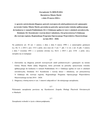 Zarządzenie Nr 0050.59.2016 Burmistrza Miasta Marki z dnia 29 marca 2016 r. w sprawie zatwierdzenia Diagnozy potrzeb rozwojowych szkół podstawowych i gimnazjów na terenie Gminy Miasta Marki, powstałej na potrzeby opracowania wniosku aplikacyjnego do konkursu w ramach Poddziałania 10.1.1 Edukacja ogólna (w tym w szkołach zawodowych), Działania 10.1 Kształcenie i rozwój dzieci i młodzieży, Osi priorytetowej X Edukacja dla rozwoju regionu, Regionalnego Programu Operacyjnego Województwa Mazowieckiego na lata 2014 – 2020. Na podstawie art. 30 ust. 1 ustawy z dnia z dnia 8 marca 1990 r. o samorządzie gminnym (t.j. Dz. U. z 2015 r. poz. 1515 z późn. zm.) oraz art. 5 ust. 7 pkt. 1 w zw. z art. 5c pkt. 3 ustawy z dnia 7 września 1991 r. o systemie oświaty (t.j. Dz.U. z 2015 r. poz. 2156 z późn. zm.), zarządza się co następuje: §1 1. Zatwierdza się diagnozę potrzeb rozwojowych szkół podstawowych i gimnazjów na terenie Gminy Miasta Marki (dalej Diagnoza), która powstała na potrzeby opracowania wniosku aplikacyjnego do konkursu w ramach Poddziałania 10.1.1 Edukacja ogólna (w tym w szkołach zawodowych), Działania 10.1 Kształcenie i rozwój dzieci i młodzieży, osi priorytetowej X Edukacja dla rozwoju regionu, Regionalnego Programu Operacyjnego Województwa Mazowieckiego na lata 2014 – 2020. 2. Diagnoza, o której mowa w ust. 1 stanowi załącznik nr 1 do niniejszego zarządzenia. §2 Wykonanie zarządzenia powierza się Dyrektorowi Zespołu Obsługi Placówek Oświatowych w Markach. §3 Zarządzenie wchodzi w życie z dniem podpisania. ZESPÓŁ OBSŁUGI PLACÓWEK OŚWIATOWYCH W MARKACH Diagnoza potrzeb rozwojowych szkół podstawowych i gimnazjów na terenie Gminy Miasta Marki Gmina Miasto Marki 2016-03-29 Strona 1 z 17 Spis treści 1. Wstęp ............................................................................................................................................... 3 2. Uwarunkowania rozwoju systemu edukacji na terenie Gminy Miasta Marki. ................................ 3 2.1. Analiza uwarunkowań demograficznych gminy. ........................................................................ 3 2.2. Opis struktury gminnego systemu edukacji na poziomie podstawowym i gimnazjalnym. ......... 5 3. Kierunki działań prorozwojowych systemu edukacji ...................................................................... 7 3.1. Struktura organizacyjna............................................................................................................... 7 3.2. Struktura kadrowa ....................................................................................................................... 8 3.3. Zasoby sprzętowe placówek edukacyjnych................................................................................. 9 3.4. Oferta edukacyjna placówek ..................................................................................................... 10 3.5. Charakterystyka uczniów w poszczególnych szkołach. ............................................................. 10 3.6. Analiza SWOT ............................................................................................................................ 11 3.7. Wnioski i postulaty wynikające z przeprowadzonej diagnozy potrzeb rozwojowych szkół. ..... 12 3.8. Spis tabel ................................................................................................................................... 17 Strona 2 z 17 1. Wstęp Diagnoza potrzeb rozwojowych szkół podstawowych i gimnazjów na terenie Gminy Miasta Marki powstała na potrzeby opracowania wniosku aplikacyjnego do konkursu w ramach Poddziałanie 10.1.1 Edukacja ogólna (w tym w szkołach zawodowych), Działania 10.1 Kształcenie i rozwój dzieci i młodzieży, Osi priorytetowej X Edukacja dla rozwoju regionu, Regionalnego Programu Operacyjnego Województwa Mazowieckiego na lata 2014 – 2020. Opracowanie danych do diagnozy miało miejsce w pierwszym kwartale 2016 roku przez Zespół Obsługi Placówek Oświatowych w Markach. 2. Uwarunkowania rozwoju systemu edukacji na terenie Gminy Miasta Marki. 2.1. Analiza uwarunkowań demograficznych gminy. Marki są gminą miejską położoną na terenie powiatu wołomińskiego w województwie mazowieckim. Miasto od południowego zachodu graniczy z Miastem stołecznym Warszawa, od południa z Ząbkami od wschodu z Kobyłką, od północy z Radzyminem i Gminą Nieporęt. Jest jedną z najmniejszych gmin powiatu wołomińskiego. Marki, których powierzchnia wynosi ok. 26 km2, wraz z Kobyłką (ok. 20 km2) i Ząbkami są jednymi z najmniejszych jednostek powiatu wołomińskiego. Miasto Marki usytuowane jest wzdłuż drogi krajowej nr 8 Warszawa – Białystok. Odległość miasta od centrum Warszawy wynosi ok. 10 km, natomiast od Wołomina, będącego miastem powiatowymi ok. 12 km. Na koniec 2014 roku gmina Marki liczyła 29 7221 zameldowanych mieszkańców (w tym 15 542 kobiet i 14 180 mężczyzn), co stanowiło 12,82% ludności całego powiatu (12,96% dla kobiet i 12,67% dla mężczyzn). Miasto charakteryzuje się jednym z wyższych, w skali powiatu wołomińskiego, wskaźników w zakresie przyrostu liczby ludności. W okresie 2010-2014 liczba ludności w Markach wzrosła o 10,63%. Wyższą wartość powyższego wskaźnika, na terenie powiatu wołomińskiego, odnotowano jedynie w Ząbkach (14,93%) i Radzyminie (11,85%). Tabela 1 Stan ludności w Gminie Miasto Marki w latach 2010 – 2014 (dane BDL) 2014 wskaźnik przyrostu ludności % % ludności w skali powiatu 15 164 15 542 10,64 12,96 13 521 13 868 14 180 10,62 12,67 28 288 29 032 29 722 10,63 12,82 Ludność wg miejsca zamieszkania/zameldowania 2010 2011 2012 2013 Kobiety 14 047 14 457 14 767 Mężczyźni 12 819 13 218 Ogółem 26 866 27 675 W latach 2010-2014 systematycznie wzrastała liczba mieszkańców we wszystkich kategoriach demograficznych, w tym także w wieku przedprodukcyjnym (dzieci i młodzież). W latach 2