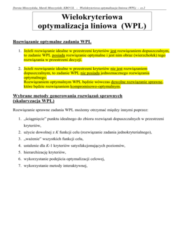 Dorota Miszczyńska, Marek Miszczyński, KBO UŁ - Wielokryteriowa optymalizacja liniowa (WPL) - cz.2 Wielokryteriowa optymalizacja liniowa (WPL) Rozwiązanie optymalne zadania WPL 1. Jeżeli rozwiązanie idealne w przestrzeni kryteriów jest rozwiązaniem dopuszczalnym, to zadanie WPL posiada rozwiązanie optymalne i jest nim obraz (wierzchołek) tego rozwiązania w przestrzeni decyzji. 2. Jeżeli rozwiązanie idealne w przestrzeni kryteriów nie jest rozwiązaniem dopuszczalnym, to zadanie WPL nie posiada jednoznacznego rozwiązania optymalnego. Rozwiązaniem optymalnym WPL będzie wówczas dowolne rozwiązanie sprawne, które będzie rozwiązaniem kompromisowo-optymalnym. Wybrane metody generowania rozwiązań sprawnych (skalaryzacja WPL) Rozwiązanie sprawne zadania WPL możemy otrzymać między innymi poprzez: 1. „ściągnięcie” punktu idealnego do zbioru rozwiązań dopuszczalnych w przestrzeni kryteriów, 2. użycie dowolnej z K funkcji celu (rozwiązanie zadania jednokryterialnego), 3. „ważenie” wszystkich funkcji celu, 4. ustalenie dla K-1 kryteriów satysfakcjonujących poziomów, 5. hierarchizację kryteriów, 6. wykorzystanie podejścia optymalizacji celowej, 7. wykorzystanie metody interaktywnej, Dorota Miszczyńska, Marek Miszczyński, KBO UŁ- Wielokryteriowa optymalizacja liniowa (WPL) - cz.2 [2] 1. Wykorzystanie rozwiązania idealnego Metoda polega na znalezieniu w zbiorze rozwiązań niezdominowanych (przestrzeń kryteriów) takiego rozwiązania niezdominowanego, które będzie najbliższe rozwiązaniu idealnemu (metryka euklidesowa). Ponieważ zbiór rozwiązań niezdominowanych jest podzbiorem rozwiązań dopuszczalnych w przestrzeni decyzji (zbiór wypukły), to zagadnienie poszukiwania odpowiedniego rozwiązania w przestrzeni kryteriów można przedstawić jako następujące zadanie optymalizacji nieliniowej: „znajdź punkt najbliższy idealnemu należący do zbioru rozwiązań dopuszczalnych w przestrzeni kryteriów” (por. rysunek 8). PRZYKŁAD 4 Dla sytuacji decyzyjnej z przykładu 3 znajdź rozwiązanie stosując podejście „ściągania” punktu idealnego. Rys. 8. Ilustracja „ściągania” rozwiązania idealnego do zbioru rozwiązań dopuszczalnych w przestrzeni kryteriów zadania WPL w przykładzie 2 W celu zbudowania stosownego zadania optymalizacji nieliniowej oznaczmy: j - współczynniki wypukłej kombinacji liniowej wektorów współrzędnych punktów wierzchołkowych zbioru rozwiązań dopuszczalnych w przestrzeni kryteriów j A' , B' , C' , D' Dorota Miszczyńska, Marek Miszczyński, KBO UŁ- Wielokryteriowa optymalizacja liniowa (WPL) - cz.2 [3] y1 j y - wektory współrzędnych współrzędnych punktów wierzchołkowych zbioru 2j rozwiązań dopuszczalnych w przestrzeni kryteriów j A' , B' , C' , D' y1I y - wktor współrzędnych punktu idealnego (I), 2I y1NN y - wektor współrzędnych punktu „najbliższego” niezdominowanego (NN) 2 NN Zadanie optymalizacji nieliniowej minimalizujące odległość rozwiązania idealnego od zbioru rozwiązań niezdominowanych w przestrzeni kryteriów jest następujące: 1 2 2 w y1NN 42400 y2 NN 64000 2 min 27200 40000 42400 16000 y1NN B' C' D' y 70400 96000 112000 64000 2 NN A' A ' B ' C' D' 1 A' 0, B' 0, C' 0, D' 0 Rozwiązanie powyższego problemu1 prowadzi do rozwiązania niezdominowanego 27680 . Powstaje ono jako „najbliższego” rozwiązaniu idealnemu. Ma ono postać: 71360 liniowa kombinacja wypukła wierzchołków A’ oraz B’. Optymalne wartości współczynników kombinacji liniowej wynoszą: A ' 77 3 , B ' , C' 0, D' 0 . 80 80 W celu wyznaczenia „odpowiednika” w przestrzeni decyzji wykorzystamy te współczynniki i wygenerujemy kompromisowo-optymalną decyzję WPL z przykładu 2. 16 0 32 80 15,4 A ' B ' C' D' 48 80 72 0 49,2 Jest to rozwiązanie sprawne (Pareto-optymalne) leżące na krawędzi rozwiązań dopuszczalnych w przestrzeni decyzji. Kompromisowo-optymalne rozwiązanie WPL jest następujące: Proces P1 - 15,4 godziny, Proces P2 - 49,2 godziny. Optymalne wartości funkcji celu są następujące: Zysk - 27680 $, Koszty - 71360 $. 1 Użyto narzędzia Solver w Excel z MS Office. AB zbioru Dorota Miszczyńska, Marek Miszczyński, KBO UŁ- Wielokryteriowa optymalizacja liniowa (WPL) - cz.2 [4] 2. Wykorzystanie indywidualnych funkcji kryterialnych Użycie jednokryterialnych zadań PL prowadzi również do wskazania rozwiązań sprawnych (Pareto-optymalnych). Omówimy to na podstawie modelu WPL z przykładu 2. z1 200 x1 z '2 800 x1 500 x2 max ( zysk ) 1200 x2 max (koszty) 100 x1 50 x2 4000 ( paliwo X ) 30 x1 40 x2 2400 ( paliwo Y ) x1 4 x2 320 (ropa A) 3x1 2 x2 240 (ropa B) x1 0 , x2 0 Jeżeli użyjemy tylko funkcji ”zysk”, to jako optymalne wskazane zostanie rozwiązanie niezdominowane C’. W przestrzeni decyzji odpowiednikiem będzie rozwiązanie sprawne C. Jeżeli natomiast użyjemy tylko funkcji „- koszty”, to jako optymalne wskazane zostanie rozwiązanie niezdominowane D’. W przestrzeni decyzji odpowiednikiem będzie rozwiązanie sprawne D. Rys. 9. Ilustracja zbioru rozwiązań sprawnych (przestrzeń decyzji) i zbioru rozwiązań niezdominowanych (przestrzeń kryteriów) zadania WPL w przykładzie 2. Dorota Miszczyńska, Marek Miszczyński, KBO UŁ- Wielokryteriowa optymalizacja liniowa (WPL) - cz.2 [5] 3. Wykorzystanie współczynników wagowych Kolejnym wariantem użycia jednokryterialnego zadania PL prowadzącego do wskazania rozwiązania sprawnego (Pareto-optymalnego) jest skonstruowanie jednej funkcji kryterialnej w miejsce K funkcji celu zadaniaWPL. Jeżeli decydent jest w stanie podać proporcje w jakiej pozostają względem siebie kryteria, to można sformułować jedną funkcję celu za pomocą tzw. współczynników wagowych (wag). Załóżmy, że w przykładzie 2 decydent określił proporcje ważności pomiędzy zyskiem a kosztami na 7:3. Prowadzi to do następującej pojedynczej funkcji celu: W x1 , x2 7 z1 3 z '2 max Funkcja W powstaje następują