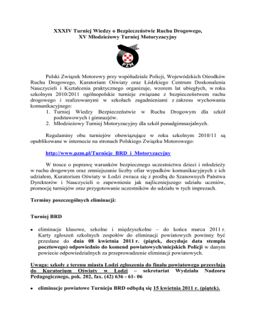 XXXIV Turniej Wiedzy o Bezpieczeństwie Ruchu Drogowego, XV Młodzieżowy Turniej Motoryzacyjny Polski Związek Motorowy przy współudziale Policji, Wojewódzkich Ośrodków Ruchu Drogowego, Kuratorium Oświaty oraz Łódzkiego Centrum Doskonalenia Nauczycieli i Kształcenia praktycznego organizuje, wzorem lat ubiegłych, w roku szkolnym 2010/2011 ogólnopolskie turnieje związane z bezpieczeństwem ruchu drogowego i realizowanymi w szkołach zagadnieniami z zakresu wychowania komunikacyjnego: 1. Turniej Wiedzy Bezpieczeństwie w Ruchu Drogowym dla szkół podstawowych i gimnazjów. 2. Młodzieżowy Turniej Motoryzacyjny dla szkół ponadgimnazjalnych. Regulaminy obu turniejów obowiązujące w roku szkolnym 2010/11 są opublikowane w internecie na stronach Polskiego Związku Motorowego: http://www.pzm.pl/Turnieje_BRD_i_Motoryzacyjny W trosce o poprawę warunków bezpiecznego uczestnictwa dzieci i młodzieży w ruchu drogowym oraz zmniejszanie liczby ofiar wypadków komunikacyjnych z ich udziałem, Kuratorium Oświaty w Łodzi zwraca się z prośbą do Szanownych Państwa Dyrektorów i Nauczycieli o zapewnienie jak najliczniejszego udziału uczniów, promocję turniejów oraz przygotowanie uczestników do udziału w tych imprezach. Terminy poszczególnych eliminacji: Turniej BRD eliminacje klasowe, szkolne i międzyszkolne – do końca marca 2011 r. Karty zgłoszeń szkolnych zespołów do eliminacji powiatowych powinny być przesłane do dnia 08 kwietnia 2011 r. (piątek, decyduje data stempla pocztowego) odpowiednio do komend powiatowych/miejskich Policji w danym powiecie odpowiedzialnych za przeprowadzenie eliminacji powiatowych. Uwaga: szkoły z terenu miasta Łodzi zgłoszenia do finału powiatowego przesyłają do Kuratorium Oświaty w Łodzi – sekretariat Wydziału Nadzoru Pedagogicznego, pok. 202, fax. (42) 636 - 61- 06 eliminacje powiatowe Turnieju BRD odbędą się 15 kwietnia 2011 r. (piątek). Poszczególne komendy powiatowe/miejskie określą miejsce eliminacji powiatowych Turnieju BRD oraz poinformują zainteresowane szkoły. Eliminacje wojewódzkie dla szkół podstawowych i gimnazjów Turnieju Wiedzy o BRD odbędą się 13 maja 2011 r. (piątek). Finał ogólnopolski czerwiec 2011 Iława Młodzieżowy Turniej Motoryzacyjny eliminacje szkolne i międzyszkolne – do końca marca 2011 r. Szkoły przesyłają zgłoszenia do eliminacji regionalnych do dnia 12 kwietnia 2011 r. (wtorek) do Kuratorium Oświaty w Łodzi, sekretariat Wydziału Nadzoru Pedagogicznego, pok. 202 fax. (42) 636 - 61- 06 lub odpowiedniej dla wskazanego poniżej terenu danego powiatu Delegatury Kuratorium Oświaty. Wymienione powiaty odpowiadają zakresom działania Wojewódzkich Ośrodków Ruchu Drogowego. Szkoły: - z Łodzi oraz powiatów: zgierskiego, łódzkiego wschodniego, pabianickiego, (WORD w Łodzi); - zgłoszenia do WNP Kuratorium Oświaty w Łodzi, - z Piotrkowa Trybunalskiego oraz powiatów: piotrkowskiego, bełchatowskiego, radomszczańskiego, opoczyńskiego, tomaszowskiego, (WORD w Piotrkowie Trybunalskim); - zgłoszenia do Delegatury Kuratorium Oświaty w Piotrkowie Trybunalskim, - ze Skierniewic oraz powiatów: skierniewickiego, rawskiego, łowickiego, kutnowskiego, łęczyckiego i brzezińskiego, (WORD w Skierniewicach); - zgłoszenia do Delegatury Kuratorium Oświaty w Skierniewicach, - z powiatów: sieradzkiego, wieruszowskiego, wieluńskiego, pajęczańskiego, zduńskowolskiego, poddębickiego i łaskiego (WORD w Sieradzu); - zgłoszenia do Delegatury Kuratorium Oświaty w Sieradzu. Eliminacje regionalne TURNIEJU MOTORYZACYJNEGO przeprowadzone w dniu 20 kwietnia /środa/ 2011 r. będą Finał wojewódzki Młodzieżowego Turnieju Motoryzacyjnego odbędzie się 27 maja 2011 r. (piątek). Finał Ogólnopolski 10-12 czerwca 2011 Myślenice