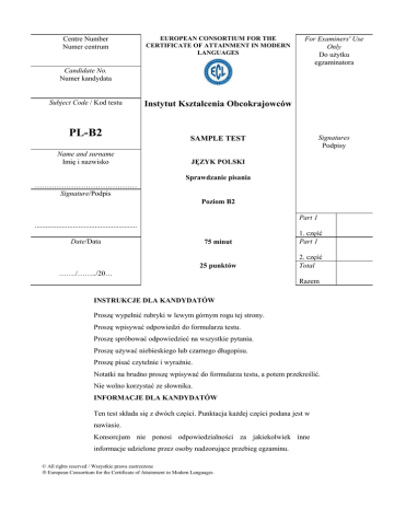 Centre Number Numer centrum EUROPEAN CONSORTIUM FOR THE CERTIFICATE OF ATTAINMENT IN MODERN LANGUAGES For Examiners' Use Only Do użytku egzaminatora Candidate No. Numer kandydata Subject Code / Kod testu PL-B2 Name and surname Imię i nazwisko Instytut Kształcenia Obcokrajowców Signatures Podpisy SAMPLE TEST JĘZYK POLSKI Sprawdzanie pisania …………………………………… Signature/Podpis Poziom B2 Part 1 ........................................................ Date/Data 75 minut 1. część Part 1 25 punktów 2. część Total ……./……../20… Razem INSTRUKCJE DLA KANDYDATÓW Proszę wypełnić rubryki w lewym górnym rogu tej strony. Proszę wpisywać odpowiedzi do formularza testu. Proszę spróbować odpowiedzieć na wszystkie pytania. Proszę używać niebieskiego lub czarnego długopisu. Proszę pisać czytelnie i wyraźnie. Notatki na brudno proszę wpisywać do formularza testu, a potem przekreślić. Nie wolno korzystać ze słownika. INFORMACJE DLA KANDYDATÓW Ten test składa się z dwóch części. Punktacja każdej części podana jest w nawiasie. Konsorcjum nie ponosi odpowiedzialności za jakiekolwiek inne informacje udzielone przez osoby nadzorujące przebieg egzaminu. © All rights reserved / Wszystkie prawa zastrzeżone European Consortium for the Certificate of Attainment in Modern Languages 2 European Consortium for the Certificate of Attainment in Modern Languages (WRITING) –B2 Sprawdzanie pisania Część pierwsza ZADANIE Znalazłeś / Znalazłaś w internecie ogłoszenie organizacji charytatywnej o nazwie „LifeHelp” o możliwości pracy jako wolontariusz przy akcjach humanitarnych prowadzonych w krajach słabo rozwiniętych. Napisz e-mail z aplikacją. Podaj następujące informacje: opowiedz krótko o sobie wyjaśnij, dlaczego interesuje cię ta praca zapytaj o zadania wolontariuszy zapytaj o szczegóły zamieszkania i warunki finansowe Twój list powinien zawierać około 200 słów. Pierwsze zdanie może być na przykład takie: Przeczytałem (łam) wasze ogłoszenie o możliwości pracy w charakterze wolontariusza. ....................... ………………………………………………………………………………………………….………… ………………………………………………………………………………………………….………… ………………………………………………………………………………………………….………… 5……………………………………………………………………………………………….………… ………………………………………………………………………………………………….………… ………………………………………………………………………………………………….………… ………………………………………………………………………………………………….………… ………………………………………………………………………………………………….………… 10……………………………………………………………………………………………….………… ………………………………………………………………………………………………….………… ………………………………………………………………………………………………….………… ………………………………………………………………………………………………….………… ………………………………………………………………………………………………….………… 15……………………………………………………………………………………………….………… ………………………………………………………………………………………………….………… ………………………………………………………………………………………………….………… European Consortium for the Certificate of Attainment in Modern Languages (WRITING) – B2 3 ………………………………………………………………………………………………….………… ………………………………………………………………………………………………….………… 20……………………………………………………………………………………………….………… ………………………………………………………………………………………………….………… ………………………………………………………………………………………………….………… ………………………………………………………………………………………………….………… ………………………………………………………………………………………………….………… 25……………………………………………………………………………………………….………… ………………………………………………………………………………………………….………… ………………………………………………………………………………………………….………… ………………………………………………………………………………………………….………… ………………………………………………………………………………………………….………… 30……………………………………………………………………………………………….………… ………………………………………………………………………………………………….………… ……………………………