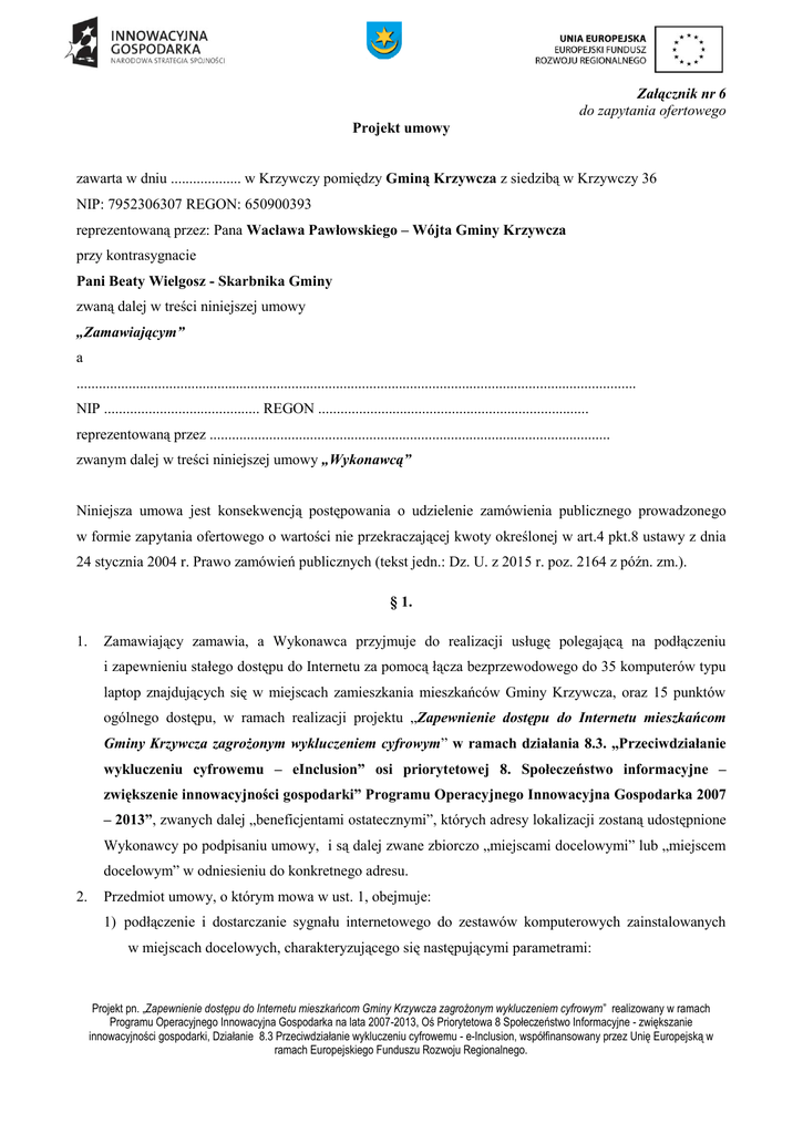 Załącznik nr 6 do zapytania ofertowego Projekt umowy zawarta w dniu ................... w Krzywczy pomiędzy Gminą Krzywcza z siedzibą w Krzywczy 36 NIP: 7952306307 REGON: 650900393 reprezentowaną przez: Pana Wacława Pawłowskiego – Wójta Gminy Krzywcza przy kontrasygnacie Pani Beaty Wielgosz - Skarbnika Gminy zwaną dalej w treści niniejszej umowy „Zamawiającym” a ....................................................................................................................................................... NIP .......................................... REGON ......................................................................... reprezentowaną przez ............................................................................................................ zwanym dalej w treści niniejszej umowy „Wykonawcą” Niniejsza umowa jest konsekwencją postępowania o udzielenie zamówienia publicznego prowadzonego w formie zapytania ofertowego o wartości nie przekraczającej kwoty określonej w art.4 pkt.8 ustawy z dnia 24 stycznia 2004 r. Prawo zamówień publicznych (tekst jedn.: Dz. U. z 2015 r. poz. 2164 z późn. zm.). § 1. 1. Zamawiający zamawia, a Wykonawca przyjmuje do realizacji usługę polegającą na podłączeniu i zapewnieniu stałego dostępu do Internetu za pomocą łącza bezprzewodowego do 35 komputerów typu laptop znajdujących się w miejscach zamieszkania mieszkańców Gminy Krzywcza, oraz 15 punktów ogólnego dostępu, w ramach realizacji projektu „Zapewnienie dostępu do Internetu mieszkańcom Gminy Krzywcza zagrożonym wykluczeniem cyfrowym” w ramach działania 8.3. „Przeciwdziałanie wykluczeniu cyfrowemu – eInclusion” osi priorytetowej 8. Społeczeństwo informacyjne – zwiększenie innowacyjności gospodarki” Programu Operacyjnego Innowacyjna Gospodarka 2007 – 2013”, zwanych dalej „beneficjentami ostatecznymi”, których adresy lokalizacji zostaną udostępnione Wykonawcy po podpisaniu umowy, i są dalej zwane zbiorczo „miejscami docelowymi” lub „miejscem docelowym” w odniesieniu do konkretnego adresu. 2. Przedmiot umowy, o którym mowa w ust. 1, obejmuje: 1) podłączenie i dostarczanie sygnału internetowego do zestawów komputerowych zainstalowanych w miejscach docelowych, charakteryzującego się następującymi parametrami: Projekt pn. „Zapewnienie dostępu do Internetu mieszkańcom Gminy Krzywcza zagrożonym wykluczeniem cyfrowym” realizowany w ramach Programu Operacyjnego Innowacyjna Gospodarka na lata 2007-2013, Oś Priorytetowa 8 Społeczeństwo Informacyjne - zwiększanie innowacyjności gospodarki, Działanie 8.3 Przeciwdziałanie wykluczeniu cyfrowemu - e-Inclusion, współfinansowany przez Unię Europejską w ramach Europejskiego Funduszu Rozwoju Regionalnego. Beneficjent końcowy Ilość punktów Ilość zestawów na punkt Pobieranie (download) – minimum/punkt Wysyłanie (upload) – minimum/punkt Gospodarstwa domowe 35 1 4 Mb/s 256 kb/s mieszkańców Gminy Krzywcza Punkty ogólnego dostępu zlokalizowane na terenie 15 1 4 Mb/s 256 kb/s Gminy Krzywcza 2) zablokowanie w dostępie do Internetu wszelkich płatnych usług typu SMS, połączeń głosowych na aktywnych kartach, które powodują lub mogą powodować w przyszłości obowiązek zapłaty jakichkolwiek opłat ponad kwotę wynagrodzenia określonego w § 3. 3. W ramach przedmiotowego zamówienia Wykonawca musi zapewnić: 1) podłączenie i dostarczanie sygnału internetowego do 35 gospodarstw domowych oraz 15 punktów ogólnego dostępu – do miejsca wskazanego przez Zamawiającego, zakończone wtyczką RJ45 (Internet będzie wykorzystywany w komputerach typu laptop); 1) bezpłatny serwis w okresie obowiązywania umowy. Koszty serwisu są wliczone w opłatę abonamentową i nie podlegają dodatkowym opłatom. Wykonawca realizuje serwis od 01.12.2016r. do 30.11.2017r. 2) w razie awarii Wykonawca przyjmie każde zgłoszenie w godzinach 9.00 - 20.00 w dni robocze. Czas usunięcia awarii - do końca następnego dnia roboczego (telefonicznie, maiłem). W przypadku braku możliwości usunięcia wady lub usterki w sposób zdalny ich usunięcie musi nastąpić wciągu 3 dni roboczych od dnia zgłoszenia (z możliwością przedłużenia tego okresu o czas naprawy urządzeń na które udzielona jest gwarancja producenta), 3) wymianę uszkodzonych lub wadliwych części odpowiadających za łącze internetowe z wyłączeniem karty sieciowej, Wykonawca dokona na koszt własny. Czas realizacji 5 dni roboczych od chwili stwierdzenia uszkodzenia wymagającego naprawy (z możliwością przedłużenia tego okresu o czas naprawy urządzeń na które udzielona jest gwarancja producenta), 4) z każdej czynności serwisowania konieczny jest protokół potwierdzający wykonanie usługi podpisany przez beneficjenta ostatecznego i Wykonawcę. W przypadku gdy naprawa wykonywana jest zdalnie potwierdzenie jej wykonania nie wymaga podpisu beneficjenta ostatecznego. 1. Wykonawca będzie dostarczał sygnał internetowy w terminie od 01.12.2016 r. do 30.11.2017 r. Wykonawca potwierdzi dostarczenie sygnału internetowego każdorazowo składając fakturę za miesiąc świadczenia usługi. 2. Wykonawca w trakcie realizacji przedmiotu zamówienia oraz w trakcie realizacji umowy będzie zobowiązany do przestrzegania zapisów ustawy o ochronie danych osobowych. 3. Wykonawca będzie świadczył usługę w ramach jednej umowy podpisanej z Zamawiającym. Projekt pn. „Zapewnienie dostępu do Internetu mieszkańcom Gminy Krzywcza zagrożonym wykluczeniem cyfrowym” realizowany w ramach Programu Operacyjnego Innowacyjna Gospodarka na lata 2007-2013, Oś Priorytetowa 8 Społeczeństwo Informacyjne - zwiększanie innowacyjności gospodarki, Działanie 8.3 Przeciwdziałanie wykluczeniu cyfrowemu - e-Inclusion, współfinansowany przez Unię Europejską w ramach Europejskiego Funduszu Rozwoju Regionalnego. Wykaz lokalizacji instalacji Beneficjentów Końcowych, w których W