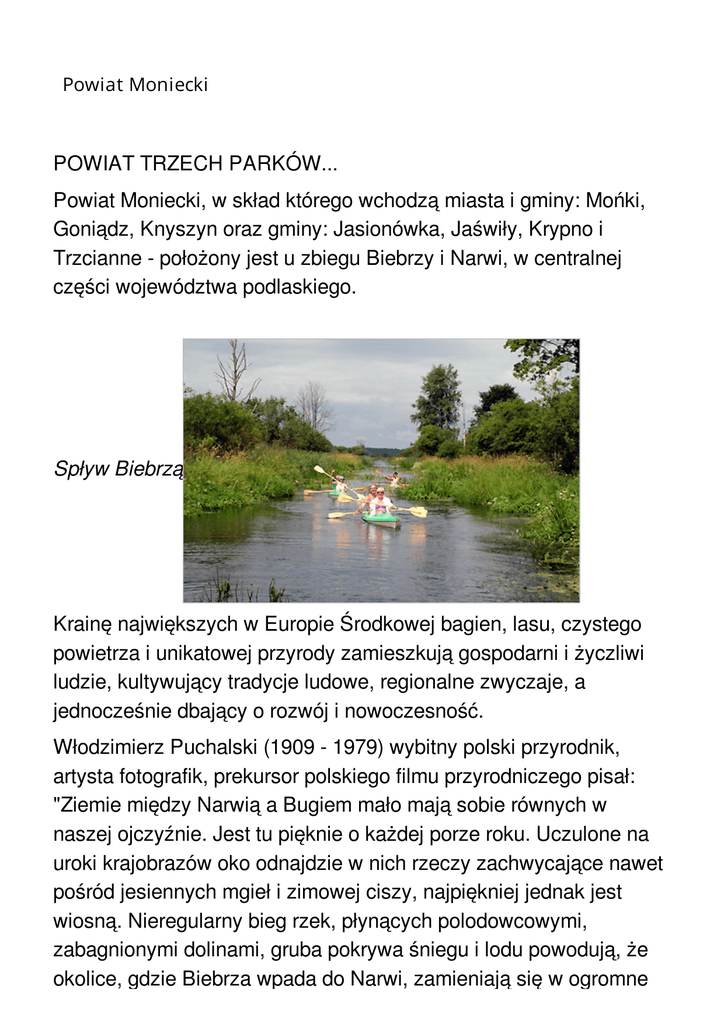 Powiat Moniecki POWIAT TRZECH PARKÓW... Powiat Moniecki, w skład którego wchodzą miasta i gminy: Mońki, Goniądz, Knyszyn oraz gminy: Jasionówka, Jaświły, Krypno i Trzcianne - położony jest u zbiegu Biebrzy i Narwi, w centralnej części województwa podlaskiego. Spływ Biebrzą Krainę największych w Europie Środkowej bagien, lasu, czystego powietrza i unikatowej przyrody zamieszkują gospodarni i życzliwi ludzie, kultywujący tradycje ludowe, regionalne zwyczaje, a jednocześnie dbający o rozwój i nowoczesność. Włodzimierz Puchalski (1909 - 1979) wybitny polski przyrodnik, artysta fotografik, prekursor polskiego filmu przyrodniczego pisał: "Ziemie między Narwią a Bugiem mało mają sobie równych w naszej ojczyźnie. Jest tu pięknie o każdej porze roku. Uczulone na uroki krajobrazów oko odnajdzie w nich rzeczy zachwycające nawet pośród jesiennych mgieł i zimowej ciszy, najpiękniej jednak jest wiosną. Nieregularny bieg rzek, płynących polodowcowymi, zabagnionymi dolinami, gruba pokrywa śniegu i lodu powodują, że okolice, gdzie Biebrza wpada do Narwi, zamieniają się w ogromne okolice, gdzie Biebrza wpada do Narwi, zamieniają się w ogromne rozlewiska.(...)" Mońki - widok z wieży kościoła Powiat Moniecki stanowi obszar o wyjątkowych walorach ekologicznych i krajobrazowych. Ze wszech stron otaczają go cenne obiekty przyrodnicze: od zachodu pokaźne połacie powiatu obejmuje Biebrzański Park Narodowy, ze strony wschodniej w granicach powiatu leżą obrzeża Parku Krajobrazowego Puszczy Knyszyńskiej, krańce południowe stanowią natomiast fragment Obszaru Chronionego Krajobrazu "Doliny Narwi" i stykają się z otuliną Narwiańskiego Parku Narodowego. Biebrzański Park Narodowy - unikatowy na skalę europejską, jedyny w tej części kontynentu naturalny obszar bagienny jest najcenniejszym obiektem przyrodniczym powiatu Naturalny kompleks torfowisk - położony nad malowniczo meandrującą rzeką, posiada nadzwyczajne walory krajobrazowe, inspirujące nie tylko artystów, fotografików, malarzy, ale również spragnionych wrażeń turystów. Jest ostoją wielu rzadkich gatunków fauny i flory. Panorama Goniądza Na bagnach - w zwężeniu doliny Biebrzy – mieści się Twierdza Osowiec (zwana polskim Verdun). Tworzą ją cztery forty zbudowane w latach 1882 - 1915. Carskie umocnienia jako jedne z nielicznych oparły się natarciom wroga w czasie pierwszej wojny światowej i nie zostały nigdy zdobyte. Turystom udostępniono do zwiedzania fort centralny - mieści się w nim również Muzeum Twierdzy. Biebrza w Goniądzu Od wieków życie ludzi na ziemi monieckiej wpisane było w rytm przyrody, a bogata przeszłość historyczna, wpływy kultury polskiej, litewskiej, ruskiej, pruskiej, jaćwingowskiej oraz żydowskiej i żarliwa religijność - ukształtowały niezwykle barwne dziedzictwo kulturowe... Dlatego jeszcze dzisiaj można spotkać rolników pozyskujących torf opałowy z biebrzańskich bagien, rybaków płynących tradycyjnymi łodziami czy posługujących się tradycyjnymi metodami kosiarzy łodziami czy posługujących się tradycyjnymi metodami kosiarzy traw. Pomnik Króla Zygmunta w Knyszynie Oferując tradycyjną gościnność tutejszych mieszkańców zapraszamy wszystkich, którzy chcą odpocząć w ciszy i spokoju, powędrować ciekawymi szlakami przez bagienne bezdroża, zaobserwować niezwykłe zjawiska przyrodnicze. Starostwo Powiatowe w Mońkach www.monki.pl Biebrzański Park Narodowy www.biebrza.org.pl Twierdza Osowiec www.twierdza.inter.org.pl Goniądz www.goniadz.org.pl Jasionówka www.jasionowka.pl Jaświły www.jaswily.pl Knyszyn www.knyszyn.pl Mońki www.monki.um.pl Trzcianne www.trzcianne.ug.pl