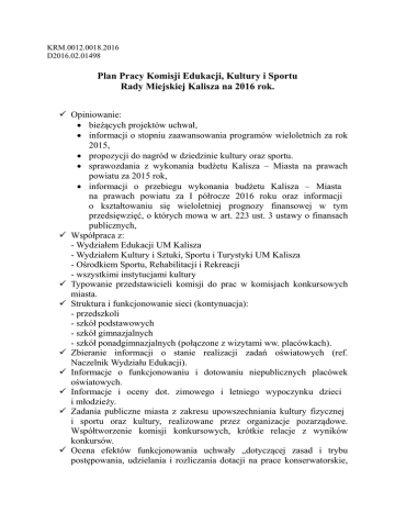 KRM.0012.0018.2016 D2016.02.01498 Plan Pracy Komisji Edukacji, Kultury i Sportu Rady Miejskiej Kalisza na 2016 rok. Opiniowanie: bieżących projektów uchwał, informacji o stopniu zaawansowania programów wieloletnich za rok 2015, propozycji do nagród w dziedzinie kultury oraz sportu. sprawozdania z wykonania budżetu Kalisza – Miasta na prawach powiatu za 2015 rok, informacji o przebiegu wykonania budżetu Kalisza – Miasta na prawach powiatu za I półrocze 2016 roku oraz informacji o kształtowaniu się wieloletniej prognozy finansowej w tym przedsięwzięć, o których mowa w art. 223 ust. 3 ustawy o finansach publicznych, Współpraca z: - Wydziałem Edukacji UM Kalisza - Wydziałem Kultury i Sztuki, Sportu i Turystyki UM Kalisza - Ośrodkiem Sportu, Rehabilitacji i Rekreacji - wszystkimi instytucjami kultury Typowanie przedstawicieli komisji do prac w komisjach konkursowych miasta. Struktura i funkcjonowanie sieci (kontynuacja): - przedszkoli - szkół podstawowych - szkół gimnazjalnych - szkół ponadgimnazjalnych (połączone z wizytami ww. placówkach). Zbieranie informacji o stanie realizacji zadań oświatowych (ref. Naczelnik Wydziału Edukacji). Informacje o funkcjonowaniu i dotowaniu niepublicznych placówek oświatowych. Informacje i oceny dot. zimowego i letniego wypoczynku dzieci i młodzieży. Zadania publiczne miasta z zakresu upowszechniania kultury fizycznej i sportu oraz kultury, realizowane przez organizacje pozarządowe. Współtworzenie komisji konkursowych, krótkie relacje z wyników konkursów. Ocena efektów funkcjonowania uchwały „dotyczącej zasad i trybu postępowania, udzielania i rozliczania dotacji na prace konserwatorskie, restauratorskie i roboty budowlane dla obiektów zabytkowych wpisanych do rejestru zabytków nie stanowiących własność Miasta Kalisza oraz realizacji prac konserwatorskich, dotowanych przez Miasto. Informacja o pozyskiwaniu środków pozabudżetowych na realizację projektów edukacyjnych, kulturalnych i sportowych (Wydział Edukacji oraz Wydział Kultury i Sztuki, sportu i Turystyki ). Inwestycje oświatowe i sportowe – potrzeby i stopień zaawansowania prac (ref. Pracownicy Wydziału Rozbudowy Miasta i inwestycji ). Wizyty na placach budowy i miejscach remontów. Sprawozdanie Koordynatora oddziału matury międzynarodowej . Funkcjonowanie Miejskiej Biblioteki Publicznej – wizyta w jednostce. Zapoznanie się z działalnością Młodzieżowego Domu Kultury – wizyta w placówce. Szkolnictwo wyższe w Kaliszu – kierunki i specjalności oferowane przez uczelnie. Rozpowszechnianie lekkiej atletyki w kaliskich szkołach i klubach sportowych w kontekście wybudowania nowego stadionu. Kaliskie Towarzystwo Kolarskie – zapoznanie się z działalnością, bazą lokalową i osiągnięciami klubu. Przewodniczący Komisji Edukacji, Kultury i Sportu Rady Miejskiej Kalisza /.../ Adam Koszada