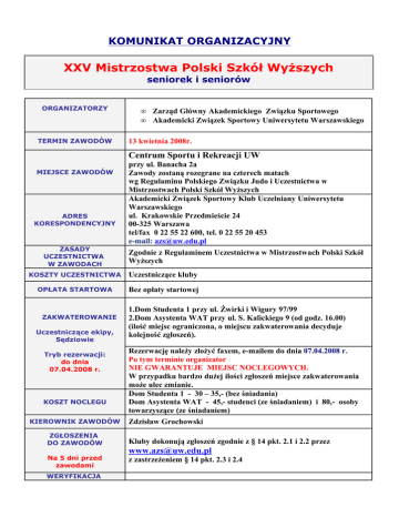 KOMUNIKAT ORGANIZACYJNY XXV Mistrzostwa Polski Szkół Wyższych seniorek i seniorów ORGANIZATORZY TERMIN ZAWODÓW • • Zarząd Główny Akademickiego Związku Sportowego Akademicki Związek Sportowy Uniwersytetu Warszawskiego 13 kwietnia 2008r. Centrum Sportu i Rekreacji UW MIEJSCE ZAWODÓW ADRES KORESPONDENCYJNY ZASADY UCZESTNICTWA W ZAWODACH przy ul. Banacha 2a Zawody zostaną rozegrane na czterech matach wg Regulaminu Polskiego Związku Judo i Uczestnictwa w Mistrzostwach Polski Szkół Wyższych Akademicki Związek Sportowy Klub Uczelniany Uniwersytetu Warszawskiego ul. Krakowskie Przedmieście 24 00-325 Warszawa tel/fax 0 22 55 22 600, tel. 0 22 55 20 453 e-mail: [email protected] Zgodnie z Regulaminem Uczestnictwa w Mistrzostwach Polski Szkół Wyższych KOSZTY UCZESTNICTWA Uczestniczące kluby OPŁATA STARTOWA Bez opłaty startowej ZAKWATEROWANIE Uczestniczące ekipy, Sędziowie Tryb rezerwacji: do dnia 07.04.2008 r. KOSZT NOCLEGU KIEROWNIK ZAWODÓW 1.Dom Studenta 1 przy ul. Żwirki i Wigury 97/99 2.Dom Asystenta WAT przy ul. S. Kalickiego 9 (od godz. 16.00) (ilość miejsc ograniczona, o miejscu zakwaterowania decyduje kolejność zgłoszeń). Rezerwację należy złożyć faxem, e-mailem do dnia 07.04.2008 r. Po tym terminie organizator NIE GWARANTUJE MIEJSC NOCLEGOWYCH. W przypadku bardzo dużej ilości zgłoszeń miejsce zakwaterowania może ulec zmianie. Dom Studenta 1 - 30 – 35,- (bez śniadania) Dom Asystenta WAT - 45,- studenci (ze śniadaniem) i 80,- osoby towarzyszące (ze śniadaniem) Zdzisław Grochowski ZGŁOSZENIA DO ZAWODÓW Kluby dokonują zgłoszeń zgodnie z § 14 pkt. 2.1 i 2.2 przez Na 5 dni przed zawodami z zastrzeżeniem § 14 pkt. 2.3 i 2.4 WERYFIKACJA [email protected] DO LOSOWANIA Weryfikację do losowania dokonuje przedstawiciel ZG AZS w terminie: od godz. 18.00 do godz. 20.30 w dniu 12.04.2008r. – sobota godz. 10.00 – 11.00 w dniu 13.04.2008r. – niedziela LOSOWANIE Waga nieoficjalna: 13.04.2008r. – niedziela w godz. 07,30 – 08,00 WAŻENIE Waga oficjalna: 13.04.2008r. – niedziela w godz. 08,00 – 10,00 PRZEGLĄD LEKARSKI PROGRAM ZAWODÓW INNE INFORMACJE Przegląd lekarski: 13.04.2008r. – sobota w godz. 8,00 –10,00 godz. 7.30 – 8.00 - waga próbna godz. 8.00 – 10.00 - waga oficjalna godz. 10,00 - 11,00 - losowanie godz. 11,15 - uroczyste otwarcie godz. 11,30 - rozpoczęcie zawodów Po zakończeniu walk eliminacyjnych - dekoracja i zakończenie zawodów Zawodnicy powinni posiadać ważne badania lekarskie oraz ubezpieczenie od następstw nieszczęśliwych wypadków. Organizator nie ponosi odpowiedzialności za zaistniałe wydarzenia. Życzymy miłego pobytu w Warszawie