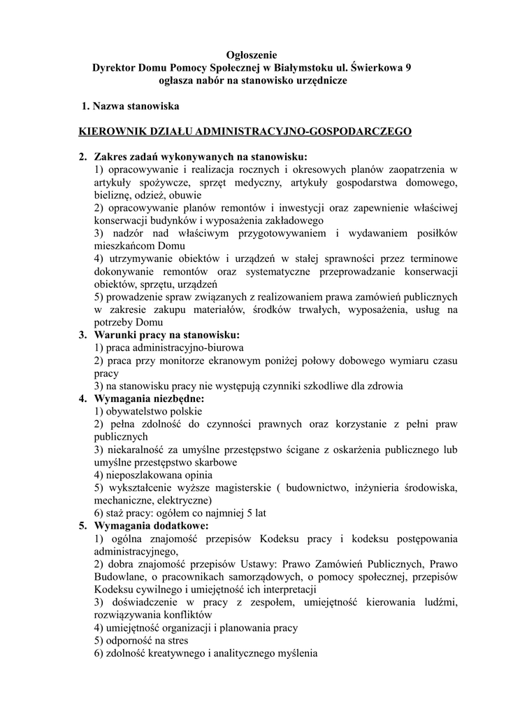 Ogłoszenie Dyrektor Domu Pomocy Społecznej w Białymstoku ul. Świerkowa 9 ogłasza nabór na stanowisko urzędnicze 1. Nazwa stanowiska KIEROWNIK DZIAŁU ADMINISTRACYJNO-GOSPODARCZEGO 2. Zakres zadań wykonywanych na stanowisku: 1) opracowywanie i realizacja rocznych i okresowych planów zaopatrzenia w artykuły spożywcze, sprzęt medyczny, artykuły gospodarstwa domowego, bieliznę, odzież, obuwie 2) opracowywanie planów remontów i inwestycji oraz zapewnienie właściwej konserwacji budynków i wyposażenia zakładowego 3) nadzór nad właściwym przygotowywaniem i wydawaniem posiłków mieszkańcom Domu 4) utrzymywanie obiektów i urządzeń w stałej sprawności przez terminowe dokonywanie remontów oraz systematyczne przeprowadzanie konserwacji obiektów, sprzętu, urządzeń 5) prowadzenie spraw związanych z realizowaniem prawa zamówień publicznych w zakresie zakupu materiałów, środków trwałych, wyposażenia, usług na potrzeby Domu 3. Warunki pracy na stanowisku: 1) praca administracyjno-biurowa 2) praca przy monitorze ekranowym poniżej połowy dobowego wymiaru czasu pracy 3) na stanowisku pracy nie występują czynniki szkodliwe dla zdrowia 4. Wymagania niezbędne: 1) obywatelstwo polskie 2) pełna zdolność do czynności prawnych oraz korzystanie z pełni praw publicznych 3) niekaralność za umyślne przestępstwo ścigane z oskarżenia publicznego lub umyślne przestępstwo skarbowe 4) nieposzlakowana opinia 5) wykształcenie wyższe magisterskie ( budownictwo, inżynieria środowiska, mechaniczne, elektryczne) 6) staż pracy: ogółem co najmniej 5 lat 5. Wymagania dodatkowe: 1) ogólna znajomość przepisów Kodeksu pracy i kodeksu postępowania administracyjnego, 2) dobra znajomość przepisów Ustawy: Prawo Zamówień Publicznych, Prawo Budowlane, o pracownikach samorządowych, o pomocy społecznej, przepisów Kodeksu cywilnego i umiejętność ich interpretacji 3) doświadczenie w pracy z zespołem, umiejętność kierowania ludźmi, rozwiązywania konfliktów 4) umiejętność organizacji i planowania pracy 5) odporność na stres 6) zdolność kreatywnego i analitycznego myślenia