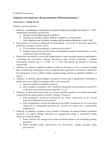 Dr Michał Gradzewicz Zadania ćwiczeniowe do przedmiotu Makroekonomia I Ćwiczenia 8 – Model IS-LM Zadania i pytania opisowe: 1. Załóżmy, że gospodarce zamkniętej bez państwa funkcja konsumpcji ma postać C = 0,8Y, a planowane inwestycje są równe 40. a. Narysuj wykres planowanych wydatków b. Wyznacz na rysunku i oblicz wielkość wydatków w równowadze c. Jakie nieplanowane działania wystąpią, jeśli produkcja faktyczna wynosi 100? 2. Przypuśćmy, że krańcowa skłonność do konsumpcji wynosi 0,6. W pewnym momencie popyt inwestycyjny wzrasta o 30 zł. a. O ile zwiększy się produkcja, w nowej równowadze? b. W jakiej części na ten przyrost złoży się dodatkowy popyt konsumpcyjny, a na ile wyjściowy popyt inwestycyjny? 3. Planowane inwestycje wynoszą 200. Społeczeństwo staje się jednak bardziej zapobiegliwe i decyduje się oszczędzać większą dotychczas część swoich dochodów, a funkcja konsumpcji zmienia się z 𝐶 = 0.75𝑌 na 𝐶 = 0.5𝑌 Jak zmieni się dochód w punkcie równowagi? 4. Załóżmy, że państwo nakłada podatki ryczałtowe (kwotowo, a nie w procencie jakiejś bazy podatkowej). Zakładając, że nie występuje efekt wypierania i że krańcowa skłonność do konsumpcji wynosi 3 4 oblicz reakcję zagregowanego popytu na spadek podatków o 2 mld zł. 5. Załóżmy, że dochód odpowiadający warunkom równowagi w gospodarce zamkniętej z państwem wynosi 2000, konsumpcja 1200, a inwestycje 400 a. Jaka jest wielkość wydatków państwa? b. Jeśli wydatki te wzrosną o 100, a krańcowa skłonność do konsumpcji wynosi 0,75, to jaki jest nowy poziom równowagi dla 𝐶, 𝐼, 𝐺, 𝑌? 6. Załóżmy, że ekonomiści zauważyli, że wzrost wydatków państwa o 10 mld zł powoduje zwiększenie się całego popytu na dobra i usługi o 30 mld zł. a. Jeśli pominiemy możliwość pojawienia się efektu wypierania, to ile wynosi krańcowa skłonność do konsumpcji? b. Jeśli uwzględnimy możliwość pojawienia się efektu wypierania to czy szacowana skłonność do konsumpcji powinna być wyższa czy niższa niż w poprzednim podpunkcie? 7. Załóżmy, że państwo zwiększa swoje wydatki. Posługując się odpowiednimi rysunkami sprawdź, czy wpływ takiego zdarzenia na zagregowany popyt w gospodarce byłby większy w sytuacji, gdyby: a. Bank centralny nie zareagował na takie działanie państwa, nie zmieniając podaży pieniądza b. Bank centralny byłby zobowiązany do utrzymania stałego poziomu stopy procentowej 1 8. Jakie są dostosowania na rynku pieniądza w sytuacji zbyt wysokich (nie równoważących rynku) stóp procentowych? Co się dzieje z popytem na obligacje? 9. Jednym ze skutków polityki fiskalnej w gospodarce zamkniętej przy stałych cenach jest efekt wypierania. Załóżmy, że impulsem wywołującym reakcje dostosowawcze jest zwiększenie wydatków rządu na dobra i usługi. Zilustruj dostosowania a. Jaki będzie wpływ tego posunięcia na krzywą IS? b. Jakie zmiany dokonają się na rynku pieniądza? c. Oznacz nową równowagę w modelu IS-LM? d. Wskaż dostosowanie obrazujące efekt wypierania. 10. Rozważ wpływ ekspansji pieniężnej w modelu IS-LM przy różnych nachyleniach krzywej IS. Jakie są wnioski z tej analizy? Co wpływa na nachylenie krzywej IS? 11. Rozważmy gospodarkę opisaną następującymi równaniami: 𝑌 = 𝐶 + 𝐼 + 𝐺 (tożsamość dochodu) 𝐶 = 0.8𝑌𝑑 (konsumpcja) 𝐼 = 200 − 200𝑅 (inwestycje) 𝑀 = (𝑌 − 500𝑅)𝑃 (popyt na pieniądz) gdzie spożycie zbiorowe wynosi 200 mld. zł, stawka podatkowa 𝑡 = 0.25, podaż pieniądza wynosi 500 mld zł, a poziom cen jest z góry ustalony i wynosi 𝑃 = 1. a) Wyprowadź równanie krzywej IS i krzywej LM b) Znajdź równowagę w modelu IS-LM (dochód i stopę procentową) c) Jakie są wielkości poszczególnych elementów popytu? d) Jaki jest wynik sektora finansów publicznych? Ile wynoszą oszczędności w gospodarce? e) Ile wynosi szybkość obiegu pieniądza w gospodarce? 12. W gospodarce zamkniętej funkcja konsumpcji ma postać 𝐶(𝑌) = 100 + 0.75𝑌, wydatki państwa 𝐺 = 200, a inwestycje są funkcją stopy procentowej 𝐼(𝑟) = 200 − 10𝑟. Popyt na pieniądz 𝑀 𝐷 = 𝑌 − 10𝑟 a podaż jest stała i wynosi 1900. [𝑟 liczone jest w %] a. Wyprowadź równania linii IS i LM b. Ile wynosi stopa procentowa i produkcja w równowadze. 13. Jaką powinna być polityka monetarna w przypadku, kiedy bank centralny chce wspomóc działania rządowe polegającą na stymulowaniu dochodów i produkcji poprzez zwiększenie wydatków rządowych? Czy polityka pieniężna i fiskalna zawsze jest spójna? Co to jest policy mix? 2