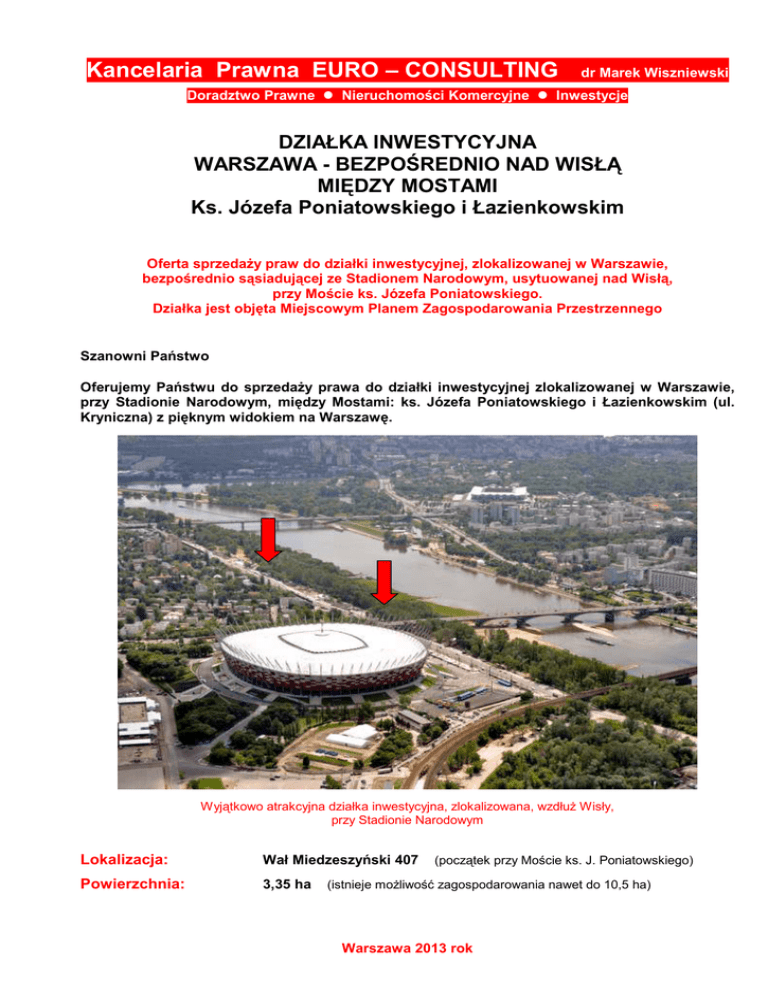 Kancelaria Prawna EURO – CONSULTING dr Marek Wiszniewski Doradztwo Prawne Nieruchomości Komercyjne Inwestycje 48) DZIAŁKA INWESTYCYJNA WARSZAWA - BEZPOŚREDNIO NAD WISŁĄ MIĘDZY MOSTAMI Ks. Józefa Poniatowskiego i Łazienkowskim Oferta sprzedaŜy praw do działki inwestycyjnej, zlokalizowanej w Warszawie, bezpośrednio sąsiadującej ze Stadionem Narodowym, usytuowanej nad Wisłą, przy Moście ks. Józefa Poniatowskiego. Działka jest objęta Miejscowym Planem Zagospodarowania Przestrzennego Szanowni Państwo Oferujemy Państwu do sprzedaŜy prawa do działki inwestycyjnej zlokalizowanej w Warszawie, przy Stadionie Narodowym, między Mostami: ks. Józefa Poniatowskiego i Łazienkowskim (ul. Kryniczna) z pięknym widokiem na Warszawę. Wyjątkowo atrakcyjna działka inwestycyjna, zlokalizowana, wzdłuŜ Wisły, przy Stadionie Narodowym Lokalizacja: Wał Miedzeszyński 407 Powierzchnia: 3,35 ha (początek przy Moście ks. J. Poniatowskiego) (istnieje moŜliwość zagospodarowania nawet do 10,5 ha) Warszawa 2013 rok KANCELARIA EURO - CONSULTING DORADZTWO PRAWNE NIERUCHOMOŚCI INWESTYCJE PL 04 - 743 WARSZAWA, ul. Czeladnicza 1 ________________________________________________________________________________________________________________2 Działka inwestycyjna zaznaczona na Ŝółto Media: wszystkie Charakter własności: własność m. st. Warszawy, spółka prawa handlowego dzierŜawi nieruchomość do 2025 r. i ma zapewnione prawo pierwokupu. Notarialna Umowa DzierŜawy, zawarta została za zgodą upowaŜnieniem Wojewody Mazowieckiego. Rodzaj inwestycji: M.P.Z.P. przewiduje pod inwestycje całą powierzchnię tj. 3,35 ha. NaleŜy zauwaŜyć iŜ 60 % tej powierzchni powinny stanowić funkcje wiodące, czyli: usługi, sport, rekreacja i turystyka, takŜe hotele sportowe, zaś do 40 % stanowić moŜe przeznaczenie towarzyszące np. biura, apartamenty, gastronomia, szkoła, hotele. Wskaźnik intensywności zabudowy 0,5. Cena: do sprzedania 100 % udziałów spółki. Sprzedający oczekuje za spółkę kwoty 9 mln PLN. KANCELARIA EURO - CONSULTING DORADZTWO PRAWNE NIERUCHOMOŚCI INWESTYCJE PL 04 - 743 WARSZAWA, ul. Czeladnicza 1 ________________________________________________________________________________________________________________3 Widok od strony Wisły Następnym krokiem jest odkupienie nieruchomości od m. st. Warszawy. Miasto jest zainteresowane sprzedaŜą prawa uŜytkowania wieczystego na 99 lat. Zatem opłata początkowa wyniesie około 10 - 15 % wartości działki, natomiast reszta kwoty zostanie rozłoŜona na 99 lat. Wał Miedzeszyński Fragment plaŜy w pobliŜu Portu Praskiego Zapisy Notarialnej Umowy DzierŜawy stanowią iŜ: - Umowa dzierŜawy zostaje zawarta do dnia 30 czerwca 2025 roku. DzierŜawcy przysługuje prawo pierwokupu przedmiotu dzierŜawy. W przypadku wcześniejszego nabycia przedmiotowej działki, poniesione nakłady zostaną zaliczone na poczet ceny zakupu KANCELARIA EURO - CONSULTING DORADZTWO PRAWNE NIERUCHOMOŚCI INWESTYCJE PL 04 - 743 WARSZAWA, ul. Czeladnicza 1 ________________________________________________________________________________________________________________4 Studium Programowo – Przestrzenne Zagospodarowania Wału Miedzeszyńskiego od strony Wisły między Mostem Poniatowskiego a ul. Kryniczaną przewiduje budynki o wysokości od dwóch do sześciu kondygnacji oddalone od siebie o ok. 20 m (studium w załączeniu). Sugerowany program budynków: - budynek A pięciokondygnacyjny, pow. ok. 5.200 m2 - Szkoła wyŜsza , biura - budynek B trzykondygnacyjny, pow. - Hotel - budynek C trzykondygnacyjny, pow. ok. 1.800 m2 - Klinika medyczna - budynek D trzykondygnacyjny, pow. ok. 2.300 m2 - Kręgielnia, gastronomia - budynek E czterokondygnacyjny, pow. ok. 2.900 m2 - Apartamenty, biura - budynek F czterokondygnacyjny, pow. ok. 2.200 m2 - Apartamenty - budynek G trzykondygnacyjny, pow. ok. 2.700 m2 - Basem, solarium, bar - budynek H trzykondygnacyjny, pow. ok. 2.200 m2 - Kino, teatr, galerie - budynek I sześciokondygnacyjny, pow. ok. 4.000 m2 - Apartamenty - budynek J pięciokondygnacyjny, pow. ok. 4.000 m2 - Hotel - budynek K trzykondygnacyjny, pow. ok. - Ośrodek rozrywki ok. 2.800 m2 1.400 m2 Powierzchnia obiektów kubaturowych: ~ 31.500 m2 Powierzchnia parkingu: 22.000 m2 – 400 miejsc postojowych. Działka jest silnie eksponowana w skali miasta. Z terenu działki jest świetna ekspozycja na lewobrzeŜną Warszawę. MoŜliwość wybudowania mariny. Realizacja inwestycji powinna następować etapami. Inwestycje wpłyną na zagospodarowanie nie tylko okolic Stadionu Narodowego, ale takŜe Saskiej Kępy i stworzą dla mieszkańców Warszawy doskonałą bazę sportowo – rekreacyjną oraz biurowo – hotelowo – mieszkaniową. W przypadku zainteresowania w/w projektem, przekaŜemy: stosowne dokumenty w tym, M.P.Z.P., uwarunkowania projektowe oraz koncepcje zagospodarowania całego terenu. Kancelaria EURO-CONSULTING posiada wyłączność do sprzedaŜy tego projektu. UWAGA ! 1. Po wybudowaniu pierwszych obiektów, natychmiast wzrośnie wartość pozostałej części działki. Jej sprzedaŜ w perspektywie kilku lat zapewni inwestorowi atrakcyjny zysk. 2. Dyrektywy Unii Europejskiej zobowiązują Polskę do przekształcenia decyzją administracyjną, prawa uŜytkowania wieczystego we własność. Nastąpi to na przestrzeni następnych lat. Będzie to dodatkowy element wzrostu wartości nieruchomości. Jesteśmy jako kancelaria prawna w kaŜdej chwili do Państwa dyspozycji. ---------------------------------------------------------------------- Projekt sprzedaŜy prowadzi Kancelaria EURO – CONSULTING, która jako kancelaria prawna specjalizuje się w nieruchomościach komercyjnych. Kancelaria EURO-CONSULTING posiada prawo wyłączności. Jesteśmy w kaŜdej chwili do Państwa dyspozycji. Wszelkie informacje uzyskacie Państwo pod nr (48 22) 812 67 47, 815 62 07 lub (48) 601 - 355 041. E-mail: [email protected] www.kancelariaprawna-euroc