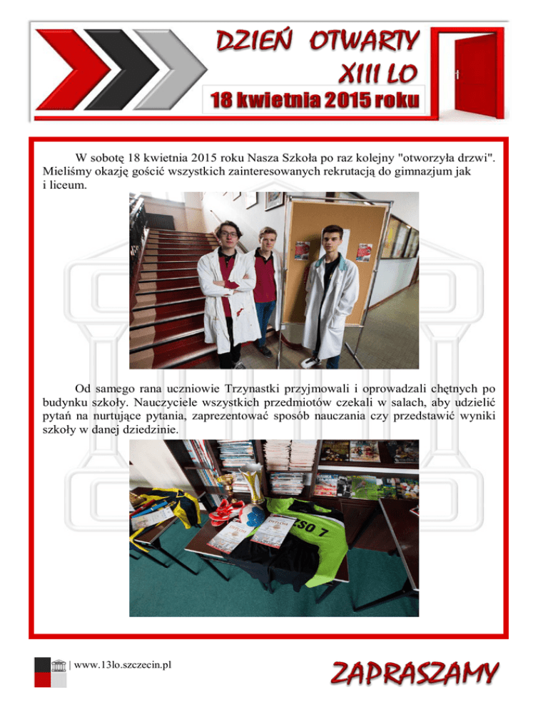 W sobotę 18 kwietnia 2015 roku Nasza Szkoła po raz kolejny "otworzyła drzwi". Mieliśmy okazję gościć wszystkich zainteresowanych rekrutacją do gimnazjum jak i liceum. Od samego rana uczniowie Trzynastki przyjmowali i oprowadzali chętnych po budynku szkoły. Nauczyciele wszystkich przedmiotów czekali w salach, aby udzielić pytań na nurtujące pytania, zaprezentować sposób nauczania czy przedstawić wyniki szkoły w danej dziedzinie. | www.13lo.szczecin.pl Oprócz tego grupa uczniów z kółka chemicznego prezentowała niezwykle ciekawe i widowiskowe eksperymenty, zaś licealiści szczególnie związani z fizyką prowadzili pokazy fizyczne. Pan dyrektor Cezary Urban przyjął wszystkich zainteresowanych na specjalnym spotkaniu by przedstawić sposób funkcjonowania szkoły oraz odpowiedzieć na ewentualne pytania rodziców. Jest nam niezmiernie miło widząc tak duże grono zainteresowanych nauką w Gimnazjum nr 16 czy XIII LO. Do zobaczenia we wrześniu :) | www.13lo.szczecin.pl