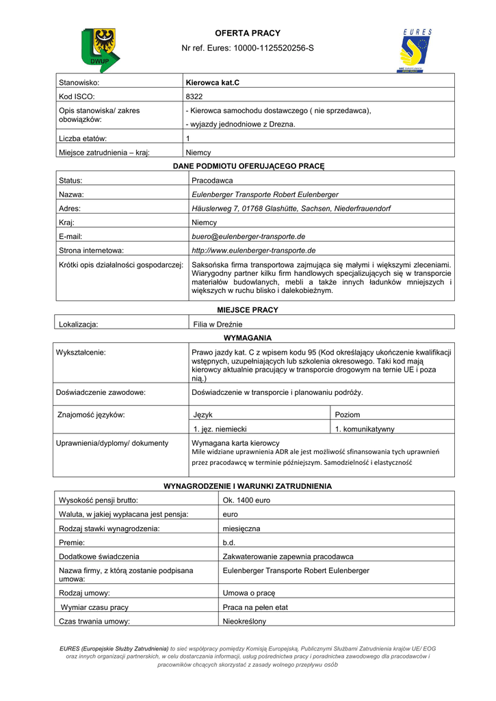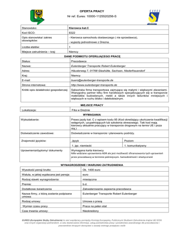 OFERTA PRACY Nr ref. Eures: 10000-1125520256-S Stanowisko: Kierowca kat.C Kod ISCO: 8322 Opis stanowiska/ zakres obowiązków: - Kierowca samochodu dostawczego ( nie sprzedawca), Liczba etatów: 1 Miejsce zatrudnienia – kraj: Niemcy - wyjazdy jednodniowe z Drezna. DANE PODMIOTU OFERUJĄCEGO PRACĘ Status: Pracodawca Nazwa: Eulenberger Transporte Robert Eulenberger Adres: Häuslerweg 7, 01768 Glashütte, Sachsen, Niederfrauendorf Kraj: Niemcy E-mail: [email protected] Strona internetowa: http://www.eulenberger-transporte.de Krótki opis działalności gospodarczej: Saksońska firma transportowa zajmująca się małymi i większymi zleceniami. Wiarygodny partner kilku firm handlowych specjalizujących się w transporcie materiałów budowlanych, mebli a także innych ładunków mniejszych i większych w ruchu blisko i dalekobieżnym. MIEJSCE PRACY Filia w Dreźnie Lokalizacja: WYMAGANIA Wykształcenie: Prawo jazdy kat. C z wpisem kodu 95 (Kod określający ukończenie kwalifikacji wstępnych, uzupełniających lub szkolenia okresowego. Taki kod mają kierowcy aktualnie pracujący w transporcie drogowym na ternie UE i poza nią.) Doświadczenie zawodowe: Doświadczenie w transporcie i planowaniu podróży. Znajomość języków: Język Poziom 1. jęz. niemiecki 1. komunikatywny Uprawnienia/dyplomy/ dokumenty Wymagana karta kierowcy Mile widziane uprawnienia ADR ale jest możliwość sfinansowania tych uprawnień przez pracodawcę w terminie późniejszym. Samodzielność i elastyczność WYNAGRODZENIE I WARUNKI ZATRUDNIENIA Wysokość pensji brutto: Ok. 1400 euro Waluta, w jakiej wypłacana jest pensja: euro Rodzaj stawki wynagrodzenia: miesięczna Premie: b.d. Dodatkowe świadczenia Zakwaterowanie zapewnia pracodawca Nazwa firmy, z którą zostanie podpisana umowa: Eulenberger Transporte Robert Eulenberger Rodzaj umowy: Umowa o pracę Wymiar czasu pracy Praca na pełen etat Czas trwania umowy: Nieokreślony EURES (Europejskie Służby Zatrudnienia) to sieć współpracy pomiędzy Komisją Europejską, Publicznymi Służbami Zatrudnienia krajów UE/ EOG oraz innych organizacji partnerskich, w celu dostarczania informacji, usług pośrednictwa pracy i poradnictwa zawodowego dla pracodawców i pracowników chcących skorzystać z zasady wolnego przepływu osób Liczba godzin tygodniowo: 40 Zmiany i praca w dni wolne: tak Data rozpoczęcia: Od zaraz SPOSÓB SKŁADANIA WNIOSKU Wymagane dokumenty CV, list motywacyjny Język, w którym muszą być sporządzone przedkładane dokumenty: W języku niemieckim Do kogo należy wysłać dokumenty: Do pracodawcy Gdzie należy wysłać dokumenty: W formie elektronicznej: [email protected] Dane teleadresowe doradcy EURES lub przedstawiciela pracodawcy: Eulenberger Transporte Häuslerweg 7 01768 Glashütte, Sachsen Niederfrauendorf Sachsen Deutschland WAŻNOŚĆ Data publikacji: 07.05.2015 Termin przedkładania podań o pracę / zakończenia ważności oferty: Do odwołania Uprzejmie informujemy, że skontaktujemy się wyłącznie z wybranymi kandydatami. UWAGA: 1. Umowa z zagranicznym pracodawcą zostanie zawarta zgodnie z prawem kraju zatrudnienia. Oznacza to, że wszystkie roszczenia odnośnie do warunków, które obejmuje umowa, można kierować wyłącznie do odpowiedniego sądu w kraju zatrudnienia. Publiczne służby zatrudnienia (EURES) nie mogą pośredniczyć ani reprezentować pracownika w sądzie kraju zatrudnienia w przypadku sporu z pracodawcą. 2. Publiczne służby zatrudnienia (EURES) dokładają wszelkich starań, aby zapewnić rzetelność i wiarygodność ofert pracy zgłoszonych w lokalnym urzędzie pracy. Należy wyjaśnić, że oferta pracy została zgłoszona przez stronę trzecią i EURES nie odpowiada za ewentualne rozbieżności między warunkami pracy określonymi w ofercie pracy i warunkami oferowanymi przez potencjalnego pracodawcę. 3. Publiczne służby zatrudnienia (EURES) informują, że będą zbierać, przetwarzać i przekazywać potencjalnym pracodawcom zgodnie z przepisami dotyczącymi ochrony danych osobowych wszystkie dane osobowe dostarczone przez osoby poszukujące pracy. EURES (Europejskie Służby Zatrudnienia) to sieć współpracy pomiędzy Komisją Europejską, Publicznymi Służbami Zatrudnienia krajów UE/ EOG oraz innych organizacji partnerskich, w celu dostarczania informacji, usług pośrednictwa pracy i poradnictwa zawodowego dla pracodawców i pracowników chcących skorzystać z zasady wolnego przepływu osób
