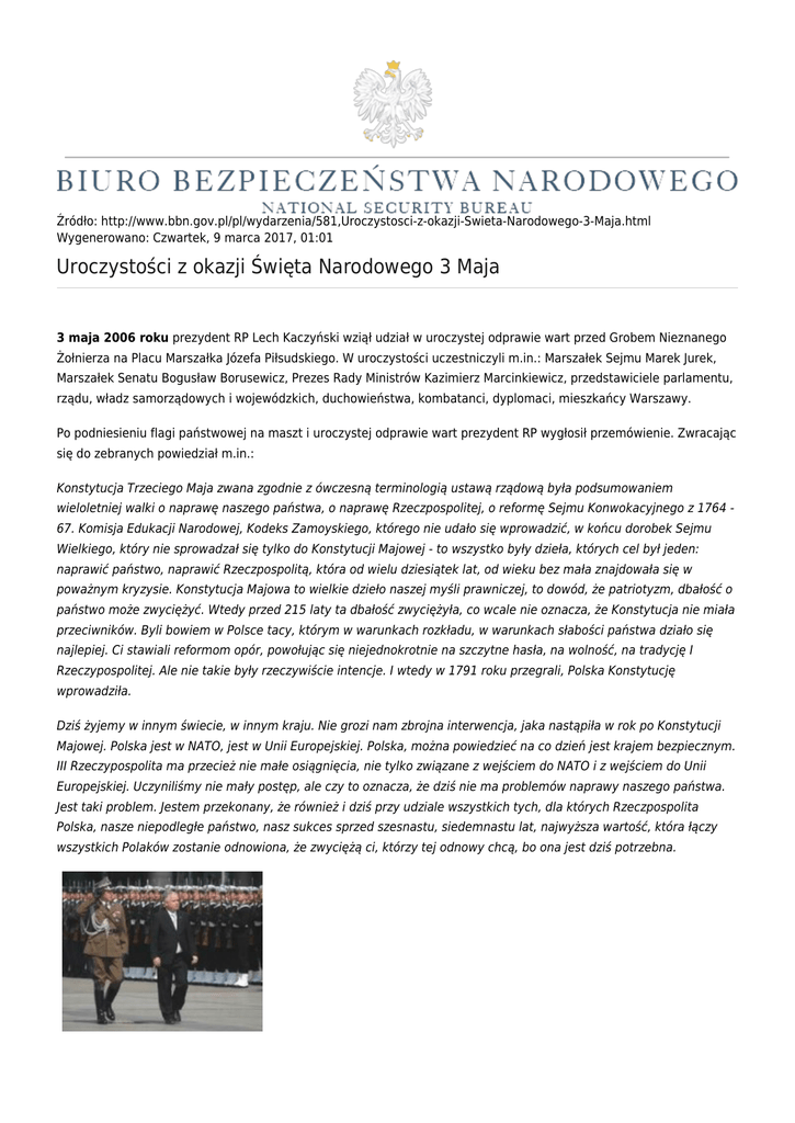 Źródło: http://www.bbn.gov.pl/pl/wydarzenia/581,Uroczystosci-z-okazji-Swieta-Narodowego-3-Maja.html Wygenerowano: Czwartek, 9 marca 2017, 01:01 Uroczystości z okazji Święta Narodowego 3 Maja 3 maja 2006 roku prezydent RP Lech Kaczyński wziął udział w uroczystej odprawie wart przed Grobem Nieznanego Żołnierza na Placu Marszałka Józefa Piłsudskiego. W uroczystości uczestniczyli m.in.: Marszałek Sejmu Marek Jurek, Marszałek Senatu Bogusław Borusewicz, Prezes Rady Ministrów Kazimierz Marcinkiewicz, przedstawiciele parlamentu, rządu, władz samorządowych i wojewódzkich, duchowieństwa, kombatanci, dyplomaci, mieszkańcy Warszawy. Po podniesieniu flagi państwowej na maszt i uroczystej odprawie wart prezydent RP wygłosił przemówienie. Zwracając się do zebranych powiedział m.in.: Konstytucja Trzeciego Maja zwana zgodnie z ówczesną terminologią ustawą rządową była podsumowaniem wieloletniej walki o naprawę naszego państwa, o naprawę Rzeczpospolitej, o reformę Sejmu Konwokacyjnego z 1764 67. Komisja Edukacji Narodowej, Kodeks Zamoyskiego, którego nie udało się wprowadzić, w końcu dorobek Sejmu Wielkiego, który nie sprowadzał się tylko do Konstytucji Majowej - to wszystko były dzieła, których cel był jeden: naprawić państwo, naprawić Rzeczpospolitą, która od wielu dziesiątek lat, od wieku bez mała znajdowała się w poważnym kryzysie. Konstytucja Majowa to wielkie dzieło naszej myśli prawniczej, to dowód, że patriotyzm, dbałość o państwo może zwyciężyć. Wtedy przed 215 laty ta dbałość zwyciężyła, co wcale nie oznacza, że Konstytucja nie miała przeciwników. Byli bowiem w Polsce tacy, którym w warunkach rozkładu, w warunkach słabości państwa działo się najlepiej. Ci stawiali reformom opór, powołując się niejednokrotnie na szczytne hasła, na wolność, na tradycję I Rzeczypospolitej. Ale nie takie były rzeczywiście intencje. I wtedy w 1791 roku przegrali, Polska Konstytucję wprowadziła. Dziś żyjemy w innym świecie, w innym kraju. Nie grozi nam zbrojna interwencja, jaka nastąpiła w rok po Konstytucji Majowej. Polska jest w NATO, jest w Unii Europejskiej. Polska, można powiedzieć na co dzień jest krajem bezpiecznym. III Rzeczypospolita ma przecież nie małe osiągnięcia, nie tylko związane z wejściem do NATO i z wejściem do Unii Europejskiej. Uczyniliśmy nie mały postęp, ale czy to oznacza, że dziś nie ma problemów naprawy naszego państwa. Jest taki problem. Jestem przekonany, że również i dziś przy udziale wszystkich tych, dla których Rzeczpospolita Polska, nasze niepodległe państwo, nasz sukces sprzed szesnastu, siedemnastu lat, najwyższa wartość, która łączy wszystkich Polaków zostanie odnowiona, że zwyciężą ci, którzy tej odnowy chcą, bo ona jest dziś potrzebna. Generuj PDF Drukuj Powiadom znajomego Tweetnij