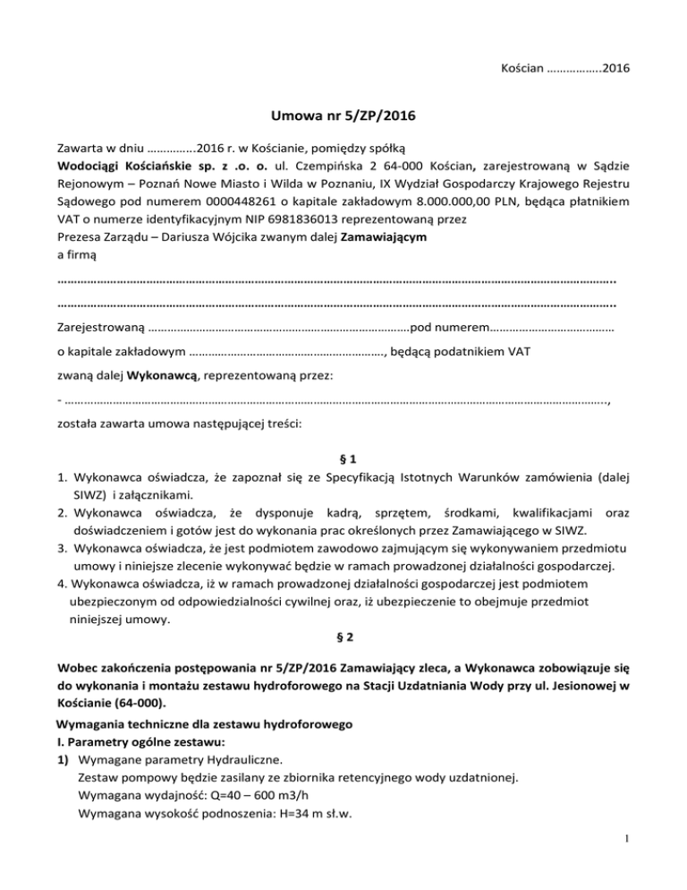 Umowa nr 5/ZP/2016 - Wodociągi Kościańskie