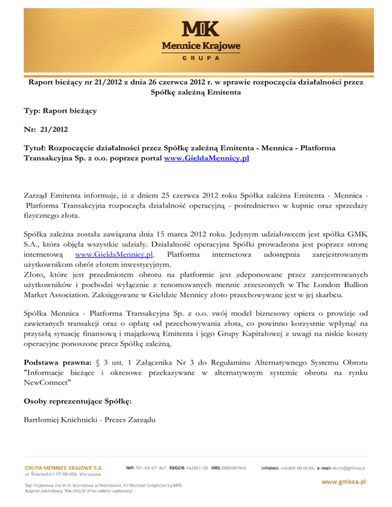 Raport bieżący nr 21/2012 z dnia 26 czerwca 2012 r. w sprawie rozpoczęcia działalności przez Spółkę zależną Emitenta Typ: Raport bieżący Nr: 21/2012 Tytuł: Rozpoczęcie działalności przez Spółkę zależną Emitenta - Mennica - Platforma Transakcyjna Sp. z o.o. poprzez portal www.GieldaMennicy.pl Zarząd Emitenta informuje, iż z dniem 25 czerwca 2012 roku Spółka zależna Emitenta - Mennica Platforma Transakcyjna rozpoczęła działalność operacyjną - pośrednictwo w kupnie oraz sprzedaży fizycznego złota. Spółka zależna została zawiązana dnia 15 marca 2012 roku. Jedynym udziałowcem jest spółka GMK S.A., która objęła wszystkie udziały. Działalność operacyjna Spółki prowadzona jest poprzez stronę internetową www.GieldaMennicy.pl. Platforma internetowa udostępnia zarejestrowanym użytkownikom obrót złotem inwestycyjnym. Złoto, które jest przedmiotem obrotu na platformie jest zdeponowane przez zarejestrowanych użytkowników i pochodzi wyłącznie z renomowanych mennic zrzeszonych w The London Bullion Market Association. Zaksięgowane w Giełdzie Mennicy złoto przechowywane jest w jej skarbcu. Spółka Mennica - Platforma Transakcyjna Sp. z o.o. swój model biznesowy opiera o prowizje od zawieranych transakcji oraz o opłatę od przechowywania złota, co powinno korzystnie wpłynąć na przyszłą sytuację finansową i majątkową Emitenta i jego Grupy Kapitałowej z uwagi na niskie koszty operacyjne ponoszone przez Spółkę zależną. Podstawa prawna: § 3 ust. 1 Załącznika Nr 3 do Regulaminu Alternatywnego Systemu Obrotu "Informacje bieżące i okresowe przekazywane w alternatywnym systemie obrotu na rynku NewConnect" Osoby reprezentujące Spółkę: Bartłomiej Knichnicki - Prezes Zarządu
