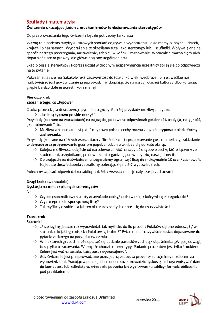 Szuflady i matematyka Ćwiczenie ukazujące jeden z mechanizmów funkcjonowania stereotypów Do przeprowadzenia tego ćwiczenia będzie potrzebny kalkulator. Ważną rolę podczas międzykulturowych spotkań odgrywają wyobrażenia, jakie mamy o innych ludziach, krajach i o nas samych. Wyobrażenia te określamy tutaj jako stereotypy lub... szufladki. Wpływają one na sposób naszego postrzegania, nastawienie, zdanie i w końcu – zachowanie. Wprawdzie można się w nich dopatrzeć ziarnka prawdy, ale głównie są one uogólnieniami. Skąd biorą się stereotypy? Poprzez udział w drobnym eksperymencie uczestnicy zbliżą się do odpowiedzi na to pytanie. Pokazanie, jak siȩ ma (jakakolwiek) rzeczywistość do (czyichkolwiek) wyobrażeń o niej, według nas najłatwiejsze jest gdy ćwiczenie przeprowadzimy skupiając się na naszej własnej kulturze albo kulturze/ grupie bardzo dobrze uczestnikom znanej. Pierwszy krok Zebranie tego, co „typowe” Osoba prowadząca dostosowuje pytanie do grupy. Poniżej przykłady możliwych pytań. „Jakie są typowo polskie cechy?” Przykłady (zebrane na warsztatach) na najczȩciej podawane odpowiedzi: gościnność, tradycja, religijność, „kombinowanie” itd. Możliwa zmiana: zamiast pytać o typowo polskie cechy można zapytać o typowo polskie formy zachowania. Przykłady (zebrane na różnych warsztatach z Nie-Polakami) : proponowanie gościom herbaty, zakładanie w domach oraz proponowanie gościom papci, chodzenie w niedzielę do kościoła itp. Kolejna możliwość: odejście od narodowości. Można zapytać o typowe cechy, które łączymy ze studentami, urzędnikami, pracownikami organizacji, uniwersytetu, naszej firmy itd. Opierając siȩ na doświadczeniu, sugerujemy ograniczyć listę do maksymalnie 10 cech/ zachowań. Najlepsze doświadczenia zebraliśmy opierając się na 5-7 wypowiedziach. Polecamy zapisać odpowiedzi na tablicy, tak żeby wszyscy mieli je cały czas przed oczami. Drugi krok (ewentualnie) Dyskusja na temat spisanych stereotypów Np. Czy po przeanalizowaniu listy zauważacie cechy/ zachowania, z którymi się nie zgadzacie? Czy akceptujecie sporządzoną listę? Tak myślimy o sobie – a jak ten obraz nas samych odnosi się do rzeczywistości?” Trzeci krok Szacunki „Przejrzyjmy jeszcze raz wypowiedzi. Jak myślicie, do ilu procent Polaków się one odnoszą? / w stosunku do jakiego odsetka Polaków są trafne?” Pytanie musi oczywiście zostać dopasowane do pytania zadanego na początku ćwiczenia. W niektórych grupach może opłacać się dodanie paru słów zachęty/ objaśnienia: „Więcej odwagi, to są tylko oszacowania. Wiemy, że chodzi o stereotypy. Podanie procentów jest tylko środkiem. Celem jest ważna zasada, którą zaraz wypracujemy”. Gdy ćwiczenie jest przeprowadzane przez jedną osobę, ta procenty spisuje innym kolorem za wypowiedziami. Pracując w parze, jedna osoba może prowadzić dyskusję, a druga wpisywać dane do komputera lub kalkulatora, wtedy nie potrzeba ich wypisywać na tablicy (formuła obliczenia pod przykładem). Z pozdrowieniami od zespołu Dialogue Unlimited www.du-t.com czerwiec 2011 Czwarty krok Wypracowywanie zasady Główne pytanie brzmi: „Co sądzicie/ jak szacujecie – w stosunku do ilu procent Polaków wszystkie odpowiedzi (cechy, sposoby zachowania… zależnie od pytania zadanego w pierwszym kroku) są trafne?”. Można je uzupełnić np. w taki sposób: „Proszę, wyłączcie myślenie matematyczne i po prostu mówcie spontanicznie, jak uważacie”. Odpowiedź można zapisać pod danymi procentowymi wcześniej zaproponowanymi do poszczególnych stereotypów i wziąć w kółko. Gdy ćwiczenie jest prowadzone przez jedną osobę, to teraz jest czas na wyliczenie wyniku procentowego. W parze, druga osoba zajmuje się tym w trakcie i teraz tylko podaje wynik. Chodzi o to, że szacunki (chyba że mamy w grupie matematyka, wtedy to się nie uda!) są zwykle dużo wyższe, niż wykazuje rachunek matematyczny. Dlaczego? Poniższy przykład złożony z trzech wypowiedzi pokazuje, jak wygląda automatyczny sposób liczenia u „niematematyków”. Przykład a. Polacy chodzą w niedzielę do kościoła. Ta wypowiedź odnosi się według uczestników do 70% Polaków. b. Piją dużo herbaty. Ta wypowiedź odnosi się według uczestników do 60% Polaków. c. Polacy nie sortują śmieci. Ta wypowiedź odnosi się według uczestników do 80% Polaków. „Niematematyk” sumuje 70, 60 i 80 i potem dzieli przez 3. Wynik: wszystkie trzy wypowiedzi odnoszą się do 70% Polaków => 70% Polaków chodzi do kościola, pije herbatȩ i nie sortuje śmieci. To równanie jest jednak nieprawidłowe. W powyższym przypadku używa się rachunku prawdopodobieństwa. Prawidłowy wzór obliczenia, to nie (70% + 60% + 80%) ÷ 3, tylko 80% × 60% × 80%! W związku z tym wystukujemy na kalkulatorze: 0,7 × 0,6 × 0,8. Wynik: 0,37. Czyli, wracając do naszego ćwiczenie, można powiedzieć, że wszystkie te trzy wypowiedzi jednocześnie są trafne w stosunku do 37% Polaków, a nie do 70%, jak podpowiada nam brzuch. To oznacza, że przy 10 albo więcej wypowiedziach, patrząc statystycznie, może nie istnieć ani jeden człowiek, który reprezentowałby sobą wszystkie podane cechy, sposoby zachowania itp. Uwaga, mamy pełną świadomość, że dane procentowe 70%, 60% i 80% są wyssane z palca albo raczej – wyciągnięte z szufladki w głowie uczestników ćwiczenia. Nie o prawdziwość tych danych chodzi, ale o mechanizm dodawania, który się włącza. Piąty krok Omówienie Co mówi nam to ćwiczenie o naszych wyobrażeniach? Co z tym zrobić? Jaki czerpiemy z tego wniosek? Możliwe podsumowanie Stereotypy jako uogólnienia mówią, jeśli w ogóle, tylko coś na temat jakieś kultury jako całości, nie na temat poszczególnych osób: OK, o Polakach jako grupie być może można powiedzieć, że chodzą w niedzielę do kościoła oraz że piją dużo herbaty, co nie oznacza, 