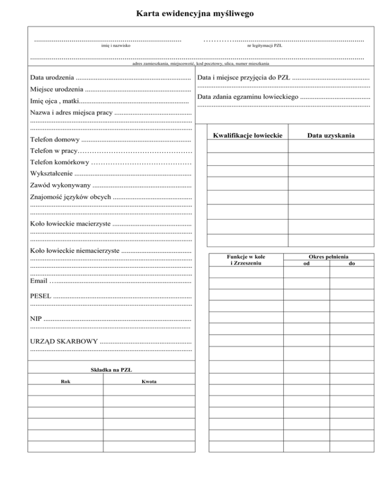 Karta ewidencyjna myśliwego ........................................................................... imię i nazwisko ………….................................................................. nr legitymacji PZŁ .......................................................................................................................................................................... adres zamieszkania, miejscowość, kod pocztowy, ulica, numer mieszkania Data urodzenia ................................................................ Data i miejsce przyjęcia do PZŁ ........................................... ................................................................................................ Miejsce urodzenia ........................................................... Data zdania egzaminu łowieckiego ....................................... Imię ojca , matki............................................................. ................................................................................................ Nazwa i adres miejsca pracy ........................................... .......................................................................................... .......................................................................................... Kwalifikacje łowieckie Data uzyskania Telefon domowy ............................................................. Telefon w pracy………………………………………… Telefon komórkowy …………………………………… Wykształcenie ................................................................. Zawód wykonywany ....................................................... Znajomość języków obcych ............................................ .......................................................................................... .......................................................................................... Koło łowieckie macierzyste ............................................ .......................................................................................... .......................................................................................... Koło łowieckie niemacierzyste ....................................... .......................................................................................... .......................................................................................... .......................................................................................... Email …........................................................................... PESEL ............................................................................. .......................................................................................... NIP .................................................................................. ......................................................................................... URZĄD SKARBOWY ................................................... .......................................................................................... Składka na PZŁ Rok Kwota Funkcje w kole i Zrzeszeniu Okres pełnienia od do Odznaczenia łowieckie Rodzaj odznaczenia Data nadania Pies myśliwski Nr w księdze rodowodowej Ptak łowczy Uwagi Uwagi Broń myśliwska Broń myśliwska Nr pozwolenia .............................................. Przez kogo wydane ....................................................................... rodzaj nr broni kaliber marka rok produkcji Medalowe trofea łowieckie Rodzaj trofeum Ilość punktów Miejsce wyceny Data pozyskania Obwód łowiecki pozyskania, nadleśnictwo Nr katalogowy Inne informacje: OSWIADCZENIE O WYRAśENIU ZGODY NA PRZETWARZANIE DANYCH OSOBOWYCH Oświadczam, Ŝe wyraŜam zgodę na przetwarzanie moich danych osobowych zgodnie z ustawą z dnia 29 sierpnia 1997r. o ochronie danych osobowych ( t. j. Dz. U. Nr 101 z 2002r., poz. 926 z późniejszymi zmianami ) do celów statutowych Polskiego Związku Łowieckiego. ________________________________________ DATA I PODPIS