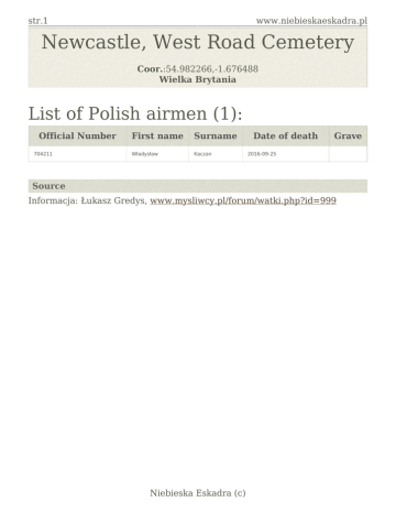 str.1 www.niebieskaeskadra.pl Newcastle, West Road Cemetery Coor.:54.982266,-1.676488 Wielka Brytania List of Polish airmen (1): Official Number 704211 First name Surname Władysław Kaczan Date of death Grave 2016-09-25 Source Informacja: Łukasz Gredys, www.mysliwcy.pl/forum/watki.php?id=999 Niebieska Eskadra (c)