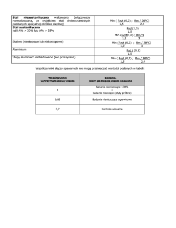 Stal nieaustenityczna walcowana (włączywszy normalizowaną, za wyjątkiem stali drobnoziarnistych poddanych specjalnej obróbce cieplnej) Stal austenityczna jeśli A% > 30% lub A% > 35% Staliwo (niestopowe lub niskostopowe) Min ( Re/t (0,2) ; Rm / 20ºC) 1,5 2,4 Re/t(1,0) 1,5 Min (Re/t(1,0) ; Rm/t) 1,2 3 Min (Re/t (0,2) ; Rm / 20ºC) 1,9 3 Aluminium Re/ t (0,1) 1,5 Stopy aluminium niehartowane (nie przesycane) Min ( Re/t (0,2) ; Rm / 20ºC) 1,5 2,4 Współczynniki złączy spawanych nie mogą przekraczać wartości podanych w tabeli: Współczynnik wytrzymałościowy złącza Badania, jakim podlegają złącza spawane 1 Badania nieniszczące 100% + badania niszczące (płyty próbne) 0,85 Badania nieniszczące wyrywkowe 0,7 Kontrola wizualna