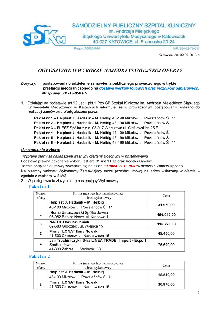 Katowice, dn. 02.07.2013 r. OGŁOSZENIE O WYBORZE NAJKORZYSTNIEJSZEJ OFERTY postępowania o udzielenie zamówienia publicznego prowadzonego w trybie przetargu nieograniczonego na dostawę worków foliowych oraz ręczników papierowych. Nr sprawy: ZP -13-056 BN. Dotyczy: 1. Działając na podstawie art.92 ust.1 pkt.1 Pzp SP Szpital Kliniczny im. Andrzeja Mielęckiego Śląskiego Uniwersytetu Medycznego w Katowicach informuje, że w prowadzonym postępowaniu wybrano do realizacji zamówienia ofertę złożoną przez: Pakiet nr 1 – Helplast J. Hadasik – M. Helbig 43-190 Mikołów ul. Powstańców Śl. 11 Pakiet nr 2 – Helplast J. Hadasik – M. Helbig 43-190 Mikołów ul. Powstańców Śl. 11 Pakiet nr 3 – FLESZ Spółka z o.o. 03-017 Warszawa ul. Cieślewskich 25 F Pakiet nr 4 – Helplast J. Hadasik – M. Helbig 43-190 Mikołów ul. Powstańców Śl. 11 Pakiet nr 5 – Helplast J. Hadasik – M. Helbig 43-190 Mikołów ul. Powstańców Śl. 11 Pakiet nr 6 – Helplast J. Hadasik – M. Helbig 43-190 Mikołów ul. Powstańców Śl. 11 Uzasadnienie wyboru: Wybrane oferty są najtańszymi ważnymi ofertami złożonymi w postępowaniu. Podstawą prawną dokonania wyboru jest art. 91 ust.1 Pzp oraz Kodeks Cywilny. Termin podpisania umowy wyznacza się na dzień 09 lipca 2013 roku w siedzibie Zamawiającego. Na pisemny wniosek Wykonawcy Zamawiający może przesłać umowę na adres wskazany w ofercie – zgodnie z zapisami w SIWZ. 2. W postępowaniu złożyli ofertę następujący Wykonawcy: Pakiet nr 1 Numer oferty 1 2 3 8 9 Firma (nazwa) lub nazwisko oraz adres wykonawcy Helplast J. Hadasik – M. Helbig 43-190 Mikołów ul. Powstańców Śl. 11 iHome Ustaszewski Spółka Jawna 05-082 Babice Nowe, ul. Kresowa 1 NAFOL Dariusz Janiak 62-580 Grodziec , ul. Wiejska 15 Firma „LONA” Ilona Nowak 41-503 Chorzów, ul. Narutowicza 15 Jan Trochimczyk i S-ka LINEA TRADE Import - Export Spółka Jawna 41-800 Zabrze, ul. Wolności 68 Cena 81.960,00 150.040,00 116.720,00 68.400,00 75.600,00 Pakiet nr 2 Numer oferty 1 8 Firma (nazwa) lub nazwisko oraz adres wykonawcy Helplast J. Hadasik – M. Helbig 43-190 Mikołów ul. Powstańców Śl. 11 Firma „LONA” Ilona Nowak 41-503 Chorzów, ul. Narutowicza 15 Cena 18.540,00 20.970,00 1 Pakiet nr 3 Numer oferty 4 5 6 7 8 9 Firma (nazwa) lub nazwisko oraz adres wykonawcy MERIDA Spółka z o.o. 53-015 Wrocław, ul. Karkonoska 59 Oddział Katowice Al. Roździeńskiego 170 DABEX Kołodziej i Jęczmionka Spółka z o.o. 41-709 Ruda Śląska, ul. Żelazna 4 FLESZ Spółka z o.o. 03-017 Warszawa, ul. Cieślewskich 25 F ADATEX Grabarczyk Robert 26-600 Radom ul. Szklana 20 m. 3 Firma „LONA” Ilona Nowak 41-503 Chorzów, ul. Narutowicza 15 Jan Trochimczyk i S-ka LINEA TRADE Import - Export Spółka Jawna 41-800 Zabrze, ul. Wolności 68 Cena 289.458,00 81.570,00 69.486,00 86.046,00 89.280,00 92.820,00 Pakiet nr 4 Numer oferty 1 8 9 Firma (nazwa) lub nazwisko oraz adres wykonawcy Helplast J. Hadasik – M. Helbig 43-190 Mikołów ul. Powstańców Śl. 11 Firma „LONA” Ilona Nowak 41-503 Chorzów, ul. Narutowicza 15 Jan Trochimczyk i S-ka LINEA TRADE Import - Export Spółka Jawna. 41-800 Zabrze, ul. Wolności 68 Cena 4.232,00 4.240,00 4.580,00 Pakiet nr 5 Numer oferty 1 Firma (nazwa) lub nazwisko oraz adres wykonawcy Helplast J. Hadasik – M. Helbig 43-190 Mikołów ul. Powstańców Śl. 11 Cena 600,00 Pakiet nr 6 Numer oferty 1 Firma (nazwa) lub nazwisko oraz adres wykonawcy Helplast J. Hadasik – M. Helbig 43-190 Mikołów ul. Powstańców Śl. 11 Cena 9.950,00 3. Działając na podstawie art.92 ust.1 pkt.2 Pzp Zamawiający informuje, że w prowadzonym postępowaniu odrzucono ofertę: a) NAFOL Dariusz Janiak 62-580 Grodziec , ul. Wiejska 15 w zakresie Pakietu nr 1: oferowany przez Wykonawcę przedmiot zamówienia nie spełniał wymogów określonych w SIWZ - podstawa prawna odrzucenia art. 89 ust.1 pkt.2. b) DABEX Kołodziej i Jęczmionka Spółka z o.o. 41-709 Ruda Śląska, ul. Żelazna 4 w zakresie Pakietu nr 3: oferowany przez Wykonawcę przedmiot zamówienia nie spełniał wymogów określonych w SIWZ - podstawa prawna odrzucenia art. 89 ust.1 pkt.2. c) Firma „LONA” Ilona Nowak 41-503 Chorzów, ul. Narutowicza 15 w zakresie Pakietów nr 1 i 3: oferowany przez Wykonawcę przedmiot zamówienia nie spełniał wymogów określonych w SIWZ podstawa prawna odrzucenia art. 89 ust.1 pkt.2. d) Jan Trochimczyk i S-ka LINEA TRADE Import-Export Spółka jawna. 41-800 Zabrze ul. Wolności 68 w zakresie Pakietu nr 1: oferowany przez Wykonawcę przedmiot zamówienia nie spełniał wymogów określonych w SIWZ - podstawa prawna odrzucenia art. 89 ust.1 pkt.2. 4. Działając na podstawie art. 92 ust. 1 pkt.3 Pzp Zamawiający informuje, że w prowadzonym postępowaniu wykluczono niżej wymienionych Wykonawców: 2 a) iHome Ustaszewski Spółka jawna 05-082 Babice Nowe, ul. Kresowa 1 - Wykonawca nie wykazał spełnienia warunków udziału w postępowaniu – podstawa prawna art. 24 ust.2 pkt. 4 ustawy Pzp. b) MERIDA Spółka z o.o. 53-015 Wrocław, ul. Karkonoska 59 Oddział Katowice Al. Roździeńskiego 170 - Wykonawca nie wykazał spełnienia warunków udziału w postępowaniu – podstawa prawna art. 24 ust.2 pkt. 4 ustawy Pzp. 5. Środki ochrony prawnej: Od decyzji niniejszej przysługują Wykonawcy środki ochrony prawnej określone w ustawie Prawo zamówień publicznych – dział VI „ Środki ochrony prawnej”. Ogłoszenie podpisał w dnia 02.07.2013 r. Z upoważnienia Dyrektora SPSKM Z-ca Dyr. Ds. Ekonomicznych - Główny Księgowy mgr Ewa Mołek 3