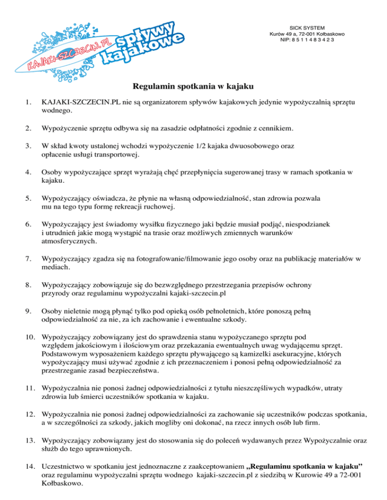 SICK SYSTEM Kurów 49 a, 72-001 Kołbaskowo NIP: 8 5 1 1 4 8 3 4 2 3 Regulamin spotkania w kajaku 1. KAJAKI-SZCZECIN.PL nie są organizatorem spływów kajakowych jedynie wypożyczalnią sprzętu wodnego. 2. Wypożyczenie sprzętu odbywa się na zasadzie odpłatności zgodnie z cennikiem. 3. W skład kwoty ustalonej wchodzi wypożyczenie 1/2 kajaka dwuosobowego oraz opłacenie usługi transportowej. 4. Osoby wypożyczające sprzęt wyrażają chęć przepłynięcia sugerowanej trasy w ramach spotkania w kajaku. 5. Wypożyczający oświadcza, że płynie na własną odpowiedzialność, stan zdrowia pozwala mu na tego typu formę rekreacji ruchowej. 6. Wypożyczający jest świadomy wysiłku fizycznego jaki będzie musiał podjąć, niespodzianek i utrudnień jakie mogą wystąpić na trasie oraz możliwych zmiennych warunków atmosferycznych. 7. Wypożyczający zgadza się na fotografowanie/filmowanie jego osoby oraz na publikację materiałów w mediach. 8. Wypożyczający zobowiązuje się do bezwzględnego przestrzegania przepisów ochrony przyrody oraz regulaminu wypożyczalni kajaki-szczecin.pl 9. Osoby nieletnie mogą płynąć tylko pod opieką osób pełnoletnich, które ponoszą pełną odpowiedzialność za nie, za ich zachowanie i ewentualne szkody. 10. Wypożyczający zobowiązany jest do sprawdzenia stanu wypożyczanego sprzętu pod względem jakościowym i ilościowym oraz przekazania ewentualnych uwag wydającemu sprzęt. Podstawowym wyposażeniem każdego sprzętu pływającego są kamizelki asekuracyjne, których wypożyczający musi używać zgodnie z ich przeznaczeniem i ponosi pełną odpowiedzialność za przestrzeganie zasad bezpieczeństwa. 11. Wypożyczalnia nie ponosi żadnej odpowiedzialności z tytułu nieszczęśliwych wypadków, utraty zdrowia lub śmierci uczestników spotkania w kajaku. 12. Wypożyczalnia nie ponosi żadnej odpowiedzialności za zachowanie się uczestników podczas spotkania, a w szczególności za szkody, jakich mogliby oni dokonać, na rzecz innych osób lub firm. 13. Wypożyczający zobowiązany jest do stosowania się do poleceń wydawanych przez Wypożyczalnie oraz służb do tego uprawnionych. 14. Uczestnictwo w spotkaniu jest jednoznaczne z zaakceptowaniem „Regulaminu spotkania w kajaku” oraz regulaminu wypożyczalni sprzętu wodnego kajaki-szczecin.pl z siedzibą w Kurowie 49 a 72-001 Kołbaskowo.