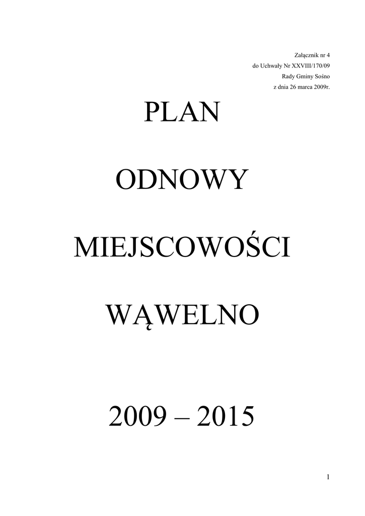 Załącznik nr 4 do Uchwały Nr XXVIII/170/09 Rady Gminy Sośno z dnia 26 marca 2009r. PLAN ODNOWY MIEJSCOWOŚCI WĄWELNO 2009 – 2015 1 PLAN ODNOWY MIEJSCOWOŚCI WĄWELNO 2009 – 2015 I. Charakterystyka wsi Wąwelno 1. Położenie. Wąwelno to wieś położona w południowej części gminy Sośno w powiecie sępoleńskim, w województwie kujawsko-pomorskim. Oddalone jest 30 km od Sępólna Krajeńskiego, 15 km od Więcborka oraz 40 km od Bydgoszczy. Wąwelno jest sołectwem o tej samie nazwie. Rzeźba terenu Wąwelna jest urozmaicona. Występuje powierzchnia pagórkowata. Na terenie Wąwelna występują w większości gleby bielicowe, pochodzenia polodowcowego. Przeważają gleby w klasach III a i III b oraz IV a i IV b. Warunki klimatyczne są dla Wąwelna korzystne. Obszar wsi Wąwelno jak i całej Gminy Sośno należy do dzielnicy klimatycznej zwanej pomorską (wg R. Gumińskiego). Na skutek wpływu mieszaniny klimatu morskiego i kontynentalnego występuje tu duża zmienność pogody – szczególnie w okresie wiosny i jesieni. Wieś jest w 100 % zwodociągowana, przez teren wsi przebiega kolektor odbierający ścieki komunalne z przeważającej większości domów mieszkalnych. W Wąwelnie mieści się Gminna Oczyszczalnia Ścieków. Na terenie wsi uporządkowana jest również gospodarka odpadami. Mieszkańcy mogą podpisać umowy na wywóz śmieci z Zakładem Gospodarki Komunalnej lub korzystać z Gminnego Wysypiska Śmieci w niedalekim Skoraczewie. Każde gospodarstwo domowe może bezproblemowo posiadać telefon, dostęp do internetu lub skorzystać z dowolnego operatora sieci komórkowej. W Wąwelnie funkcjonuje Szkoła Podstawowa oraz Gimnazjum, Muzeum archeologicznoetnograficzne przy Gimnazjum, filia Gminnej Biblioteki Publicznej w Sośnie, Ośrodek Zdrowia, Punkt Apteczny, Kościół Parafialny, remiza wraz ze świetlicą wiejską, 2 sklepy ogólnospożywcze, sklep odzieżowy, stacja paliw, Urząd Pocztowy, punkt sprzedaży środków ochrony roślin i nawozów firmy „Chemirol”, Zakład Produkcji Kartonów oraz parę firm remontowo- budowlanych. 2 2. Historia Pierwsze ślady bytności człowieka na terenie dzisiejszego Wąwelna sięgają młodszej epoki kamienia w szeroko pojętym przedziale czasowym mezolit – neolit. Świadczą o tym znalezione narzędzia krzemienne odkryte podczas badań powierzchniowych. Wieś Wąwelno leży na terenach historycznej Krajny. W 1113 Krajna została włączona do Polski. Nazwa ta dotyczy obszarów wcielonych przez Bolesława Krzywoustego do Wielkopolski. Wówczas to Wielkopolanie rozpoczęli nową fazę osadnictwa. Pierwsza wzmianka o Wąwelnie (wówczas znanym jako Vanvelno) pochodzi z 1290 roku, kiedy arcybiskup gnieźnieński Jakub II przekazał dziesięciny stołowe z Wąwelna klasztorowi Cystersów z Byszewa. W 1359 r właścicielem wsi był Jancz (lub Łaszcz) z Wawelna, w 1377 roku dobra odziedziczył Jaśko z Izdebna pod Rogowem. Kiedy w 1374 roku mieszkańcy ówczesnego Wąwelna odmówili oddawania dziesięcin arcybiskup Jarosław rzuca klątwę na niepłacących dziesięcin na rzecz OO Cystersów w Byszewie. W 1383 r wymieniony był Przecław z Wąwelna Wąwelski poseł do Elżbiety Węgierskiej (w okresie walk bratobójczych m.in. Grzymalitów z Nałęczami) „Gdy tenże z niczem powrócił i gdy rycerstwo zebrane w Sączu uradziło po raz ostatni zwrócić się z prośbą do węgierskiego dworu, zaprotestował Przecław z Wąwelna przypominając, że raz już dano sobie słowo nie wysyłać nikogo do Węgier, skoroby jaka legacja skutku nie odniosła. Robicie mnie i siebie kłamcami - rzekł i tyle sprawił, że całą uchwałę i poselstwo odwołano, a co więcej zakazano komukolwiek na dwór Elżbiety się udawać” Wystąpienie Przecława z Wąwelna Wąwelskiego jest pierwszym przykładem osławionego liberum veto, jakie w dziejach polski się napotyka. (Szujski – Dzieje Polski). W 1578 r było 6 właścicieli Wąwelna: Ślesiński, Korytowski, Spławski, Kostka, Sucharski, Zebrzydowski. W 1620 roku jest już tylko 3 właścicieli: Korytowski, Sucharski i Kapituła Gnieźnieńska. W 1652-53 miejscowość posiadali starosta pokrzywiński Działyński oraz spadkobiercy kasztelana kaliskiego Kaspra Zebrzydowskiego. W 1695 roku właścicielem Wąwelna był kasztelan Nakielski A. Chrząstowski. Od 1758 roku Wąwelno posiadał Stanisław ze Słup Wałdowski skarbnik wschowski, właściciel klucza dóbr z Toninkiem, Wałdówkiem i Przepałkowem. 3 Stanisław ze Słup Wałdowski ufundował obecny kościół parafialny w Wąwelnie. Od 1767 majątek należał do Franciszka Wałdowskiego – burgrabiego nakielskiego. Przed 1772 właścicielem został Piotr Goetzendorf-Grabowski W 1772 roku Fryderyk II manifestem z 13-09-1772 wezwał wszystkie stany z ziem wcielonych do Prus do przysięgi wiernopoddańczej. Ze szlachty krajeńskiej osobiście hołdowało tylko 7, w ich liczbie do Malborka stawił się Piotr Grabowski z Wąwelna. Kolejnymi właścicielami majątku Wąwelno byli: - 1850 Józef Grabowski. Do czasu uwolnienia chłopów z powinności odrabiania pańszczyzny majątek należał do hrabiego Grabowskiego. Chłopi mieszkali we wiosce. Poza tym był tam też kościół katolicki, szpital, kuźnia i kołodziej. Miejscowi chłopi w ilości 16-18 byli częściowo Polakami, częściowo niemieckimi imigrantami z Pomorza. Pracowali od 4 do 5 dni w tygodniu z własnymi zaprzęgami dla właściciela majątku i jednocześnie otrzymywali z majątku tyle ziemi do uprawy, aby mogli wyżywić swoje rodziny. Otrzymali oni taką ilość pola dla własnej uprawy „ile każdy jednym zaprzęgiem wołów obrobić mógł”. Te nadania dla chłopów rząd pruski rekompensował właścicielom ziemskim, ale każdy chłop musiał państwu płacić rocznie 12 talarów. - 1868 Dr Boethel Henry Strousberg - „król kolei żelaznej” Nabył ten majątek w takim momencie, kiedy jego kariera jako magnata finansowego sięgnęła zenitu niczym kometa