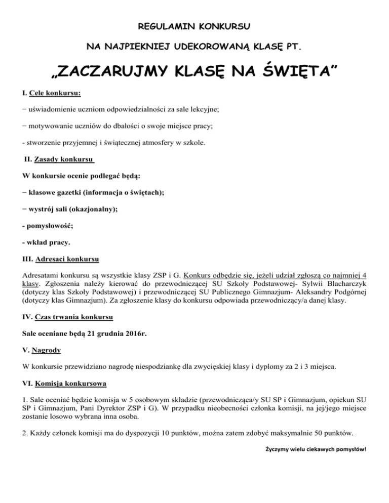 REGULAMIN KONKURSU NA NAJPIEKNIEJ UDEKOROWANĄ KLASĘ PT. „ZACZARUJMY KLASĘ NA ŚWIĘTA” I. Cele konkursu: − uświadomienie uczniom odpowiedzialności za sale lekcyjne; − motywowanie uczniów do dbałości o swoje miejsce pracy; - stworzenie przyjemnej i świątecznej atmosfery w szkole. II. Zasady konkursu W konkursie ocenie podlegać będą: − klasowe gazetki (informacja o świętach); − wystrój sali (okazjonalny); - pomysłowość; - wkład pracy. III. Adresaci konkursu Adresatami konkursu są wszystkie klasy ZSP i G. Konkurs odbędzie się, jeżeli udział zgłoszą co najmniej 4 klasy. Zgłoszenia należy kierować do przewodniczącej SU Szkoły Podstawowej- Sylwii Blacharczyk (dotyczy klas Szkoły Podstawowej) i przewodniczącej SU Publicznego Gimnazjum- Aleksandry Podgórnej (dotyczy klas Gimnazjum). Za zgłoszenie klasy do konkursu odpowiada przewodniczący/a danej klasy. IV. Czas trwania konkursu Sale oceniane będą 21 grudnia 2016r. V. Nagrody W konkursie przewidziano nagrodę niespodziankę dla zwycięskiej klasy i dyplomy za 2 i 3 miejsca. VI. Komisja konkursowa 1. Sale oceniać będzie komisja w 5 osobowym składzie (przewodnicząca/y SU SP i Gimnazjum, opiekun SU SP i Gimnazjum, Pani Dyrektor ZSP i G). W przypadku nieobecności członka komisji, na jej/jego miejsce zostanie losowo wybrana inna osoba. 2. Każdy członek komisji ma do dyspozycji 10 punktów, można zatem zdobyć maksymalnie 50 punktów. Życzymy wielu ciekawych pomysłów!