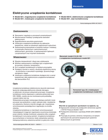 Akcesoria Elektryczne urządzenia kontaktowe ■■ Model 821, magnetyczne urządzenie kontaktowe ■■ Model 831, indukcyjne urządzenie kontaktowe ■■ Model 830 E, elektroniczne urządzenie kontaktowe ■■ Model 851, styk kontaktronowy Karta katalogowa WIKA AC 08.01 Zastosowania ■■ Sterowanie i regulacja w procesach przemysłowych ■■ Monitorowanie instalacji i przełączanie obwodów elektrycznych ■■ Sygnalizowanie warunków granicznych ■■ Indukcyjne urządzenia kontaktowe są całkowicie bezpieczne, nawet na obszarach zagrożonych wybuchem ■■ Zastosowania przemysłowe w budowie maszyn i instalacji, w przemyśle chemicznym i petrochemicznym, elektrowniach, górnictwie, w zastosowaniach lądowych i przybrzeżnych oraz inżynierii środowiska Właściwości Manometr model 212.20.100 z urządzeniem kontaktowym model 821 ■■ Wysoka niezawodność i długi czas użytkowania ■■ Możliwe zastosowanie w każdego typu urządzeniach do pomiaru ciśnienia i temperatury ■■ Do 4 urządzeń kontaktowych w każdym przyrządzie ■■ Dostępny również w wersji z obudową wypełnioną cieczą - do pomiarów w warunkach wysokiego, dynamicznego obciążenia i drgań ■■ Indukcyjne urządzenie kontaktowe dostępne też w wersji bezpiecznej i jako elektroniczne urządzenie kontaktowe dla sterowników PLC Opis Urządzenia kontaktowe (elektroniczne styczniki alarmowe) łączą lub rozłączają elektryczne obwody sterujące, w zależności od pozycji wskazówki przyrządu. Urządzenia kontaktowe można regulować w zakresie pełnej skali (por. DIN 16085), zwykle są one montowane pod podziałką, czasami także nad nią. Wskazówka przyrządu (wskazująca bieżącą wartość) może poruszać się swobodnie w całym zakresie skali, niezależnie od ustawienia. Zarówno mierniki okrągłe, jak i kwadratowe wmontowywane posiadają klucz regulacyjny na środku okienka. Urządzenia kontaktowe w miernikach wmontowywanych niewystających mogą być regulowane za pomocą śrubokręta przez okienko. Istnieje możliwość ustawienia kilku urządzeń kontaktowych na tę samą wartość. Urządzenia kontaktowe są uruchamiane w momencie, kiedy wskazówka wartości bieżącej przekroczy ustawioną wartość (w górę lub w dół). Karta katalogowa WIKA AC 08.01 ∙ 09/2011 Karty katalogowa podobnych produktów Przetworniki łączone z manometrami – patrz karta katalogowa AC 08.02 Termometr typu 55 z indukcyjnym urządzeniem kontaktowym model 831 Opcje Mierniki ze specjalnymi aprobatami na żądanie, np. ■■Ograniczniki ciśnienia lub przełączniki ciśnieniowe zgodne z VdTÜV Pressure Bulletin 100/1 ■■Przełączniki ciśnieniowe z aprobatą DVGW (DIN 3398/EN 1854) ■■Przyrządy do pomiaru ciśnienia i temperatury ze stykami alarmowymi dla samoistnie bezpiecznych systemów elektrycznych (w górnictwie) Strona 1 z 24 Model 821 magnetyczne urządzenie kontaktowe 1) Zastosowanie To urządzenie może być używane w różnorodnych warunkach roboczych, również w przyrządach wypełnionych cieczą. Urządzenie jest „zatrzaskowe” dzięki wbudowanemu magnesowi stałemu, co wzmacnia siłę styku. Dzięki tej “zatrzaskowości”, urządzenia są dodatkowo chronione przed szkodliwym wpływem łuku elektrycznego, jednak powoduje ona wzrost histerezy z 2% do 5% zakresu pomiarowego. Histereza jest to różnica pomiędzy wartością zmierzoną wskazywaną przy przemieszczaniu wskazówki w dół i w górę skali, przy niezmienionym punkcie przełączania. Sygnał jest emitowany przed połączeniem lub po nim, w zależności od kierunku ruchu wskazówki przyrządu. 1) W przypadku pomiaru temperatury za pomocą bimetalowych systemów pomiarowych z bardzo niską mocą wzbudzania i w warunkach braku drgań należy posłużyć się przesuwnymi urządzeniami kontaktowymi (model 811). Tego rodzaju urządzenia kontaktowe nie nadają się do stosowania w przyrządach wypełnionych cieczą. Tabela specyfikacji i wartości znamionowych urządzeń kontaktowych Uwzględnienie podanych danych zapewni wieloletnie bezawaryjne działanie urządzeń kontaktowych. W wyższych obciążeniach (maks. 1840 VA) oraz w przyrządach wypełnionych cieczą zalecamy przekaźniki ochronne typu 905.1X (str. 9). Zgodnie z DIN 16085, wymagania dotyczące przyrządów do pomiaru ciśnienia z urządzeniami kontaktowymi przeznaczonymi dla napięć poniżej 24 V muszą być dokładnie uzgodnione między użytkownikiem a producentem. Uwaga! W przypadku niskich wartości znamionowych urządzenia kontaktowe mogą pracować właściwie wyłącznie dla prądów przełączania powyżej 20 mA. Aby zapewnić większą niezawodność przełączania, biorąc również pod uwagę długoterminowe oddziaływanie na środowisko, napięcie przełączania nie powinno być niższe niż 24 V. W przypadku przełączania obciążeń indukcyjnych lub pojemnościowych, należy przedsięwziąć standardowe środki dla ochrony urządzeń kontaktowych przed wypaleniem. Dla sterowników PLC zalecamy elektroniczne urządzenia kontaktowe 830 E (por. strona 14 i dalej). Dane techniczne Maks. wartość znamionowa Magnetyczne urządzenie kontaktowe, model 821 Przesuwne urządzenie rezystancyjnym Urządzenia bez wypełnienia Wypełnione cieczą Urządzenia bez wypełnienia Maksymalne napięcie (MSR) Ueff 250 V 250 V 250 V - Łączenia 1,0 A 1,0 A 0,7 A - Obciążenie stałe 0,6 A 0,6 A 0,6 A przełączania z obciążeniem Prąd znamionowy: 1) - Rozłączania 1,0 A Obciążenie maksymalne 0,7 A 20 W / 20 VA Stop srebra i niklu (80 % Ag / 20 % Ni / 10 μm warstwa pozłacana) Temperatura robocza otoczenia Maks. liczba urządzeń kontaktowych 1) 1,0 A 30 W / 50 VA Materiał styków kontaktowe, model 811 10 W / 18 VA -20 ... +70 °C 4 Wartość dla prądów znamionowych stosuje się dla wersji przyrządów z łącznikami w wersji S. Dla wersji L wartości należy podzielić na dwa. (odpowiednie wersje opisane są w tabeli na stronie 3) Zalecane wa