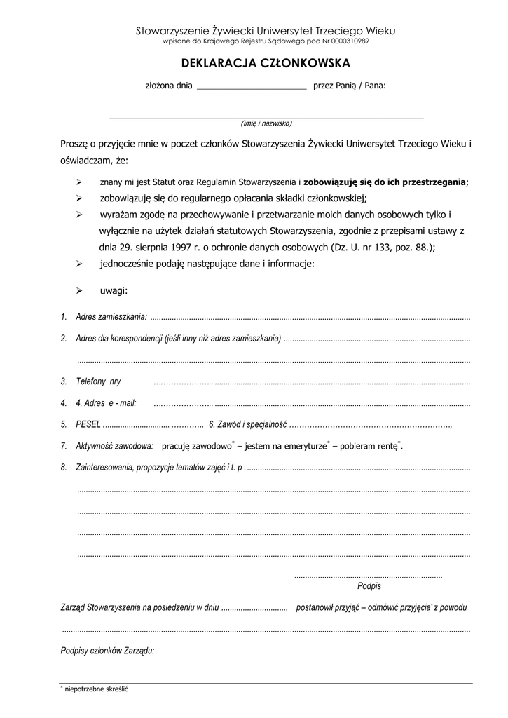 Stowarzyszenie Żywiecki Uniwersytet Trzeciego Wieku wpisane do Krajowego Rejestru Sądowego pod Nr 0000310989 DEKLARACJA CZŁONKOWSKA złożona dnia _____________________________ przez Panią / Pana: ___________________________________________________________________________________ (imię i nazwisko) Proszę o przyjęcie mnie w poczet członków Stowarzyszenia Żywiecki Uniwersytet Trzeciego Wieku i oświadczam, że: znany mi jest Statut oraz Regulamin Stowarzyszenia i zobowiązuję się do ich przestrzegania; zobowiązuję się do regularnego opłacania składki członkowskiej; wyrażam zgodę na przechowywanie i przetwarzanie moich danych osobowych tylko i wyłącznie na użytek działań statutowych Stowarzyszenia, zgodnie z przepisami ustawy z dnia 29. sierpnia 1997 r. o ochronie danych osobowych (Dz. U. nr 133, poz. 88.); jednocześnie podaję następujące dane i informacje: uwagi: 1. Adres zamieszkania: ..................................................................................................................................................... 2. Adres dla korespondencji (jeśli inny niż adres zamieszkania) ....................................................................................... ....................................................................................................................................................................................... 3. Telefony nry ….……………….. ....................................................................................................................... 4. 4. Adres e - mail: ….……………….. ....................................................................................................................... 5. PESEL . .............................. …………. 6. Zawód i specjalność ………………………………………………………, 7. Aktywność zawodowa: pracuję zawodowo* – jestem na emeryturze* – pobieram rentę*. 8. Zainteresowania, propozycje tematów zajęć i t. p . ........................................................................................................ ....................................................................................................................................................................................... ....................................................................................................................................................................................... ....................................................................................................................................................................................... ....................................................................................................................................................................................... ..................................................................... Podpis Zarząd Stowarzyszenia na posiedzeniu w dniu ............................... postanowił przyjąć – odmówić przyjęcia* z powodu .............................................................................................................................................................................................. Podpisy członków Zarządu: * niepotrzebne skreślić