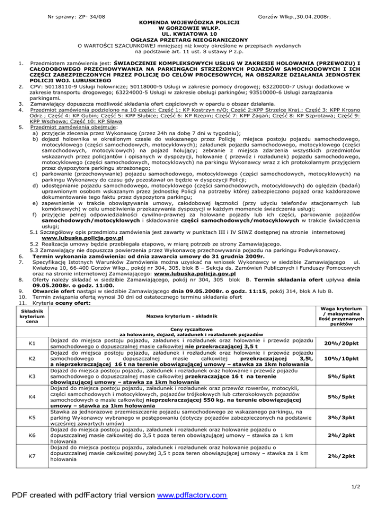 Nr sprawy: ZP- 34/08 Gorzów Wlkp.,30.04.2008r. KOMENDA WOJEWÓDZKA POLICJI W GORZOWIE WLKP. UL. KWIATOWA 10 OGŁASZA PRZETARG NIEOGRANICZONY O WARTOŚCI SZACUNKOWEJ mniejszej niż kwoty określone w przepisach wydanych na podstawie art. 11 ust. 8 ustawy P z.p. 1. Przedmiotem zamówienia jest: ŚWIADCZENIE KOMPLEKSOWYCH USŁUG W ZAKRESIE HOLOWANIA (PRZEWOZU) I CAŁODOBOWEGO PRZECHOWYWANIA NA PARKINGACH STRZEŻONYCH POJAZDÓW SAMOCHODOWYCH I ICH CZĘŚCI ZABEZPIECZONYCH PRZEZ POLICJĘ DO CELÓW PROCESOWYCH, NA OBSZARZE DZIAŁANIA JEDNOSTEK POLICJI WOJ. LUBUSKIEGO 2. CPV: 50118110-9 Usługi holownicze; 50118000-5 Usługi w zakresie pomocy drogowej; 63220000-7 Usługi dodatkowe w zakresie transportu drogowego; 63224000-5 Usługi w zakresie obsługi parkingów; 93510000-6 Usługi zarządzania parkingami. 3. Zamawiający dopuszcza możliwość składania ofert częściowych w oparciu o obszar działania. 4. Przedmiot zamówienia podzielono na 10 części: Część 1: KP Kostrzyn n/O; Część 2:KPP Strzelce Kraj.; Część 3: KPP Krosno Odrz.; Część 4: KP Gubin; Część 5: KPP Słubice; Część 6: KP Rzepin; Część 7: KPP Żagań; Część 8: KP Szprotawa; Część 9: KPP Wschowa; Część 10: KP Sława 5. Przedmiot zamówienia obejmuje: a) przyjęcie zlecenia przez Wykonawcę (przez 24h na dobę 7 dni w tygodniu); b) dojazd holownika w określonym czasie do wskazanego przez Policję miejsca postoju pojazdu samochodowego, motocyklowego (części samochodowych, motocyklowych); załadunek pojazdu samochodowego, motocyklowego (części samochodowych, motocyklowych) na pojazd holujący; zebranie z miejsca zdarzenia wszystkich przedmiotów wskazanych przez policjantów i opisanych w dyspozycji, holowanie ( przewóz i rozładunek) pojazdu samochodowego, motocyklowego (części samochodowych, motocyklowych) na parkingu Wykonawcy wraz z ich protokolarnym przyjęciem przez dyspozytora parkingu strzeżonego; c) parkowanie (przechowywanie) pojazdu samochodowego, motocyklowego (części samochodowych, motocyklowych) na parkingu Wykonawcy do czasu gdy pozostawał on będzie w dyspozycji Policji; d) udostępnianie pojazdu samochodowego, motocyklowego (części samochodowych, motocyklowych) do oględzin (badań) uprawnionym osobom wskazanym przez jednostkę Policji na potrzeby której zabezpieczono pojazd oraz każdorazowe dokumentowanie tego faktu przez dyspozytora parkingu; e) zapewnienie w trakcie obowiązywania umowy, całodobowej łączności (przy użyciu telefonów stacjonarnych lub komórkowych) w celu umożliwienia przekazywania dyspozycji w każdym momencie świadczenia usługi; f) przyjęcie pełnej odpowiedzialności cywilno-prawnej za holowane pojazdy lub ich części, parkowanie pojazdów samochodowych/motocyklowych i składowanie części samochodowych/motocyklowych w trakcie świadczenia usługi; 5.1 Szczegółowy opis przedmiotu zamówienia jest zawarty w punktach III i IV SIWZ dostępnej na stronie internetowej www.lubuska.policja.gov.pl 5.2 Realizacja umowy będzie przebiegała etapowo, w miarę potrzeb ze strony Zamawiającego. 5.3 Zamawiający nie dopuszcza powierzenia przez Wykonawcę przechowywania pojazdu na parkingu Podwykonawcy. 6. Termin wykonania zamówienia: od dnia zawarcia umowy do 31 grudnia 2009r. 7. Specyfikację Istotnych Warunków Zamówienia można uzyskać na wniosek Wykonawcy w siedzibie Zamawiającego ul. Kwiatowa 10, 66-400 Gorzów Wlkp., pokój nr 304, 305, blok B – Sekcja ds. Zamówień Publicznych i Funduszy Pomocowych oraz na stronie internetowej Zamawiającego: www.lubuska.policja.gov.pl 8. Oferty należy składać w siedzibie Zamawiającego, pokój nr 304, 305 blok B. Termin składania ofert upływa dnia 09.05.2008r. o godz. 11:00. 9. Otwarcie ofert nastąpi w siedzibie Zamawiającego dnia 09.05.2008r. o godz. 11:15, pokój 314, blok A lub B. 10. Termin związania ofertą wynosi 30 dni od ostatecznego terminu składania ofert 11. Kryteria oceny ofert: Składnik kryterium cena Nazwa kryterium - składnik Waga kryterium / maksymalna ilość przyznanych punktów Ceny ryczałtowe za holowanie, dojazd, załadunek i rozładunek pojazdów K1 K2 K3 K4 K5 K6 K7 Dojazd do miejsca postoju pojazdu, załadunek i rozładunek oraz holowanie i przewóz pojazdu samochodowego o dopuszczalnej masie całkowitej nie przekraczającej 3,5 t Dojazd do miejsca postoju pojazdu, załadunek i rozładunek oraz holowanie i przewóz pojazdu samochodowego o dopuszczalnej masie całkowitej przekraczającej 3,5t, a nieprzekraczającej 16 t na terenie obowiązującej umowy – stawka za 1km holowania Dojazd do miejsca postoju pojazdu, załadunek i rozładunek oraz holowanie i przewóz pojazdu samochodowego o dopuszczalnej masie całkowitej przekraczające 16 t na terenie obowiązującej umowy – stawka za 1km holowania Dojazd do miejsca postoju pojazdu, załadunek i rozładunek oraz przewóz rowerów, motocykli, części samochodowych i motocyklowych, pojazdów trójkołowych lub czterokołowych pojazdów samochodowych o masie całkowitej nieprzekraczającej 550 kg. na terenie obowiązującej umowy – stawka za 1km holowania Stawka za jednorazowe przemieszczenie pojazdu samochodowego ze wskazanego parkingu, na parking Wykonawcy wybranego w postępowaniu (dotyczy pojazdów zabezpieczonych na podstawie wcześniej zawartych umów) Dojazd do miejsca postoju pojazdu, załadunek i rozładunek oraz holowanie pojazdu o dopuszczalnej masie całkowitej do 3,5 t poza teren obowiązującej umowy – stawka za 1 km holowania Dojazd do miejsca postoju pojazdu, załadunek i rozładunek oraz holowanie pojazdu o dopuszczalnej masie całkowitej powyżej 3,5 t poza teren obowiązującej umowy – stawka za 1 km holowania 20%/20pkt 10%/10pkt 5%/5pkt 5%/5pkt 3%/3pkt 2%/2pkt 2%/2pkt 1/2 PDF created with pdfFactory trial version www.pdffactory.com Ceny ryczałtowe za parkowanie pojazdu na parkingu depozytowym za każdą rozpoczętą dobę (po upływie terminu bezpłatnego parkowania) K8 Parkowanie pojazdu s