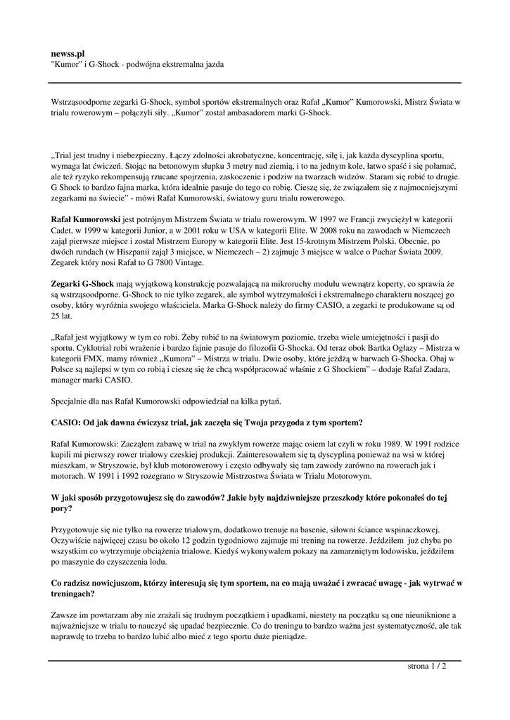 newss.pl "Kumor" i G-Shock - podwójna ekstremalna jazda Wstrząsoodporne zegarki G-Shock, symbol sportów ekstremalnych oraz Rafał „Kumor” Kumorowski, Mistrz Świata w trialu rowerowym – połączyli siły. „Kumor” został ambasadorem marki G-Shock. „Trial jest trudny i niebezpieczny. Łączy zdolności akrobatyczne, koncentrację, siłę i, jak każda dyscyplina sportu, wymaga lat ćwiczeń. Stojąc na betonowym słupku 3 metry nad ziemią, i to na jednym kole, łatwo spaść i się połamać, ale też ryzyko rekompensują rzucane spojrzenia, zaskoczenie i podziw na twarzach widzów. Staram się robić to drugie. G Shock to bardzo fajna marka, która idealnie pasuje do tego co robię. Cieszę się, że związałem się z najmocniejszymi zegarkami na świecie” - mówi Rafał Kumorowski, światowy guru trialu rowerowego. Rafał Kumorowski jest potrójnym Mistrzem Świata w trialu rowerowym. W 1997 we Francji zwyciężył w kategorii Cadet, w 1999 w kategorii Junior, a w 2001 roku w USA w kategorii Elite. W 2008 roku na zawodach w Niemczech zajął pierwsze miejsce i został Mistrzem Europy w kategorii Elite. Jest 15-krotnym Mistrzem Polski. Obecnie, po dwóch rundach (w Hiszpanii zajął 3 miejsce, w Niemczech – 2) zajmuje 3 miejsce w walce o Puchar Świata 2009. Zegarek który nosi Rafał to G 7800 Vintage. Zegarki G-Shock mają wyjątkową konstrukcję pozwalającą na mikroruchy modułu wewnątrz koperty, co sprawia że są wstrząsoodporne. G-Shock to nie tylko zegarek, ale symbol wytrzymałości i ekstremalnego charakteru noszącej go osoby, który wyróżnia swojego właściciela. Marka G-Shock należy do firmy CASIO, a zegarki te produkowane są od 25 lat. „Rafał jest wyjątkowy w tym co robi. Żeby robić to na światowym poziomie, trzeba wiele umiejętności i pasji do sportu. Cyklotrial robi wrażenie i bardzo fajnie pasuje do filozofii G-Shocka. Od teraz obok Bartka Ogłazy – Mistrza w kategorii FMX, mamy również „Kumora” – Mistrza w trialu. Dwie osoby, które jeżdżą w barwach G-Shocka. Obaj w Polsce są najlepsi w tym co robią i cieszę się że chcą współpracować właśnie z G Shockiem” – dodaje Rafał Zadara, manager marki CASIO. Specjalnie dla nas Rafał Kumorowski odpowiedział na kilka pytań. CASIO: Od jak dawna ćwiczysz trial, jak zaczęła się Twoja przygoda z tym sportem? Rafał Kumorowski: Zacząłem zabawę w trial na zwykłym rowerze mając osiem lat czyli w roku 1989. W 1991 rodzice kupili mi pierwszy rower trialowy czeskiej produkcji. Zainteresowałem się tą dyscypliną ponieważ na wsi w której mieszkam, w Stryszowie, był klub motorowerowy i często odbywały się tam zawody zarówno na rowerach jak i motorach. W 1991 i 1992 rozegrano w Stryszowie Mistrzostwa Świata w Trialu Motorowym. W jaki sposób przygotowujesz się do zawodów? Jakie były najdziwniejsze przeszkody które pokonałeś do tej pory? Przygotowuje się nie tylko na rowerze trialowym, dodatkowo trenuje na basenie, siłowni ściance wspinaczkowej. Oczywiście najwięcej czasu bo około 12 godzin tygodniowo zajmuje mi trening na rowerze. Jeździłem już chyba po wszystkim co wytrzymuje obciążenia trialowe. Kiedyś wykonywałem pokazy na zamarzniętym lodowisku, jeździłem po maszynie do czyszczenia lodu. Co radzisz nowicjuszom, którzy interesują się tym sportem, na co mają uważać i zwracać uwagę - jak wytrwać w treningach? Zawsze im powtarzam aby nie zrażali się trudnym początkiem i upadkami, niestety na początku są one nieuniknione a najważniejsze w trialu to nauczyć się upadać bezpiecznie. Co do treningu to bardzo ważna jest systematyczność, ale tak naprawdę to trzeba to bardzo lubić albo mieć z tego sportu duże pieniądze. strona 1 / 2 newss.pl "Kumor" i G-Shock - podwójna ekstremalna jazda Co myślisz o zegarkach G-Shock? Czy pasują do charakteru sportu który uprawiasz? Co do zegarków G-Shock to zawsze je uważałem za najlepsze na świecie. Myślę, że bardzo pasują do tego sportu ponieważ mają wiele wspólnych cech z zawodnikiem trialowym jak np. wytrzymałość i odporność na uderzenia. Czy masz jakieś wspomnienia z tą marką? Czy pomoże Ci ona w rozwijaniu Twoich umiejętności? Tak oczywiście, wspomnień mam sporo. Pierwszego G-Shocka kupiłem 10 lat temu w strefie wolnocłowej w Andorze i wciąż działa bez zarzutu. G-Shock już pomógł mi rozwinąć moje umiejętności sponsorując mnie, a dodatkowo zegarki G-Shocka pomagają mi na treningach i zawodach. Szczególnie przydatne dla mnie są stoper, timer i wysokościomierz. Gdzie będziesz startował w najbliższym czasie? Z takich ważniejszych imprez to Puchar Świata w Belgi w Knokke-Heist 1 i 2 sierpnia, Mistrzostwa Świata Australia i Puchar Świata Nowa Zelandia - ale to dopiero na początku września. W międzyczasie na pewno wystartuje treningowo w zawodach na Słowacji i Czechach. Optimum PR strona 2 / 2