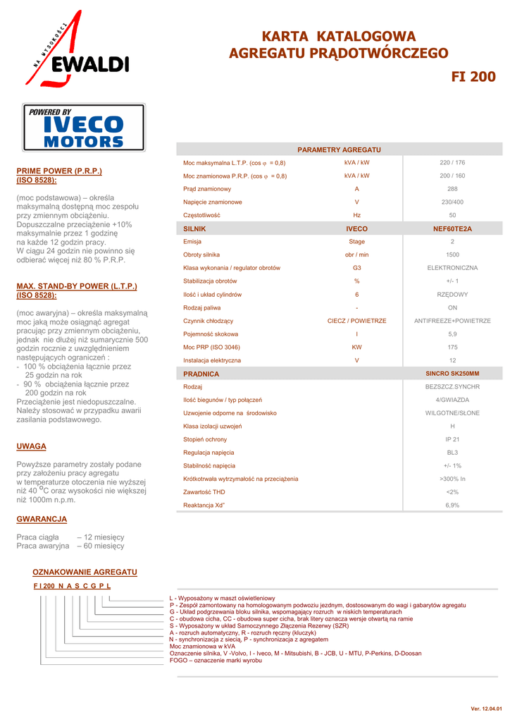 FI 200 KARTA KATALOGOWA AGREGATU PRĄDOTWÓRCZEGO