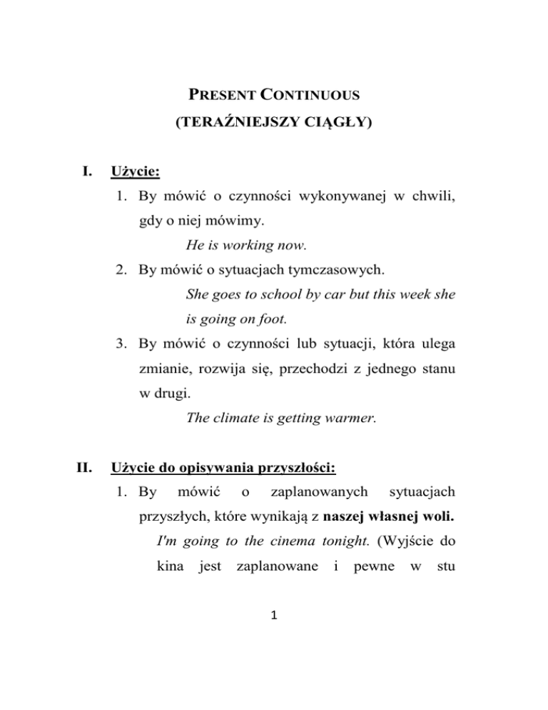 PRESENT CONTINUOUS (TERAŹNIEJSZY CIĄGŁY) I. Użycie: 1. By mówić o czynności wykonywanej w chwili, gdy o niej mówimy. He is working now. 2. By mówić o sytuacjach tymczasowych. She goes to school by car but this week she is going on foot. 3. By mówić o czynności lub sytuacji, która ulega zmianie, rozwija się, przechodzi z jednego stanu w drugi. The climate is getting warmer. II. Użycie do opisywania przyszłości: 1. By mówić o zaplanowanych sytuacjach przyszłych, które wynikają z naszej własnej woli. I'm going to the cinema tonight. (Wyjście do kina jest zaplanowane i 1 pewne w stu procentach, jestem do niego przygotowana np. już kupiłam bilet) III. Budowa gramatyczna: Do tworzenia zdań w czasie Present Continuous potrzeba odpowiedniej dla osoby formy czasownika być (am/is/are) czasownika oraz głównego z końcówką -ing. Należy pamiętać o tym, że: Czasowniki kończące się na literę "e" tracą tą literę przed dodaniem końcówki (np. write writing, make - making, come - coming). Czasowniki zakończone spółgłoską, przed którą występuje jedna samogłoska, podwajają ostatnią literę (np. get - getting, swim swimming, run - running). Czasowniki zakończone na -w i -x nie podlegają tej zasadzie (np. know - knowing, fix - fixing). Czasowniki zakończone na "-ie" zmieniają końcówkę na "-y", a dopiero potem dodaje się do nich końcówkę "-ing" (lie - lying, die dying) 2 Czasowniki zakończone na spółgłoskę -l podwajają ją, jeżeli poprzedzona jest samogłoską (np. travel - travelling). UWAGA! Czasowniki wyrażające stany emocjonalne (np. love, hate, like), osąd (np. think, suppose), przekonanie (np. believe), posiadanie (np. have) lub percepcję (np. hear, see) zazwyczaj nie wystepują w czasach Continuous UWAGA! W czasie Present Continuous czasownik be nie ma znaczenia "być" i występuje jedynie w charakterze czasownika posiłkowego (nieprzetłumaczalnej cząstki, która jest informacją gramatyczną o zastosowanym czasie). 1. Zdania oznajmujące tworzy się, umieszczając po podmiocie jedną z form czasownika "być" (am, is lub are), a następnie czasownik z końcówką -ing. 3 SCHEMAT ZDANIA OZNAJMUJĄCEGO am Podmiot + is czasownik + główny z -ing are We are + dopełnienie watching określenie + czasu TV now. 2. Zdania pytające tworzy się przy użyciu inwersji - czyli wysunięciu czasownika pomocniczego am, is lub are przed podmiot (osobę). W zdaniach pytających czasowniki zachowują końcówkę -ing. SCHEMAT ZDANIA PYTAJĄCEGO Am Is + podmiot Are Are you + czasownik + główny z -ing dopełnienie watching + TV określenie czasu now? 3. Zdania przeczące: Zdania przeczące tworzy się poprzez dodanie partykuły "not" po czasowniku pomocniczym am, is lub are, a przed czasownikiem głównym. Można posłużyć sie skrótami (are not = aren't; is not = isn't), 4 należy jednak pamiętać o tym, że forma am not nie ma skrótu. W zdaniach przeczących czasowniki zachowują końcówkę -ing. SCHEMAT ZDANIA PRZECZĄCEGO am is Podmiot + + are am not not czasownik + główny z - + dopełnienie + określenie ing isn't czasu aren't We aren't IV. watching TV Określenia czasu: W zależności od tego, w jakim celu stosujemy Present Continuous, możemy z tym czasem używać różnych określeń czasu, np: Sytuacje obecne - określenia czasu umieszcza się na końcu zdania, rzadziej na początku zdania: o at present - obecnie o at the moment - w tej chwili 5 now. o now - teraz Sytuacje przyszłe - określenia czasu umieszcza się na końcu zdania, rzadziej na początku zdania: o today - dzisiaj o tomorrow - jutro o this month - w tym miesiącu 6