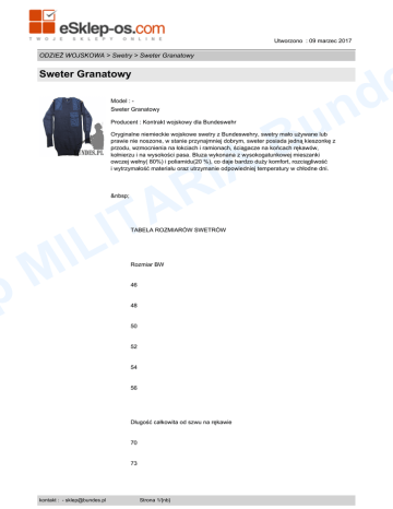 p Utworzono : 09 marzec 2017 ODZIEŻ WOJSKOWA > Swetry > Sweter Granatowy e d Sweter Granatowy n u B A Model : Sweter Granatowy Producent : Kontrakt wojskowy dla Bundeswehr Oryginalne niemieckie wojskowe swetry z Bundeswehry, swetry mało używane lub prawie nie noszone, w stanie przynajmniej dobrym, sweter posiada jedną kieszonkę z przodu, wzmocnienia na łokciach i ramionach, ściągacze na końcach rękawów, kołnierzu i na wysokości pasa. Bluza wykonana z wysokogatunkowej mieszanki owczej wełny( 80%) i poliamidu(20 %), co daje bardzo duży komfort, rozciągliwość i wytrzymałość materiału oraz utrzymanie odpowiedniej temperatury w chłodne dni. I R A T I L I M TABELA ROZMIARÓW SWETRÓW Rozmiar BW 46 48 50 52 54 56 Długość całkowita od szwu na rękawie 70 73 kontakt : - [email protected] Strona 1/{nb} p Utworzono : 09 marzec 2017 ODZIEŻ WOJSKOWA > Swetry > Sweter Granatowy e d Sweter Granatowy n u B A 74 78 80 I R A T I L 82 Długość rękawa mierzona od pachy I M 50 52 53 54 56 58 Szerokość w klatce piersiowej 96 100 106 112 118 kontakt : - [email protected] Strona 2/{nb} p Utworzono : 09 marzec 2017 ODZIEŻ WOJSKOWA > Swetry > Sweter Granatowy e d Sweter Granatowy n u B A 130 Wszystkie rozmiary mierzone na płasko I R A T I L Cena : 80,00 zł Brutto ( 65,04 zł Netto) Dostępne opcje Sweter Granatowy : Rozmiar I M 46, 48, 50, 52 (+ 40,33 zł), 54 (+ 40,33 zł), 56 (+ 40,33 zł). Dostępność: Produkt dostępny w naszym sklepie od 02 sierpień 2010 kontakt : - [email protected] Strona 3/{nb}