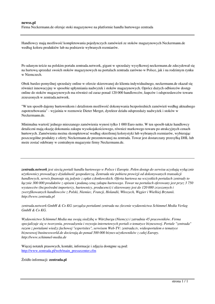 newss.pl Firma Neckermann.de oferuje stoki magazynowe na platformie handlu hurtowego zentrada Handlowcy mają możliwość kompletowania pojedynczych zamówień ze stoków magazynowych Neckermann.de według koloru produktów lub na podstawie wybranych rozmiarów. Po udanym teście na polskim portalu zentrada.network, gigant w sprzedaży wysyłkowej neckermann.de zdecydował się na hurtową sprzedaż swoich stoków magazynowych na portalach zentrada zarówno w Polsce, jak i na rodzimym rynku w Niemczech. Obok bardzo pomyślnej sprzedaży online w ofercie skierowanej do klienta indywidualnego, neckermann.de okazał się również innowacyjny w sposobie upłynniania nadwyżek i stoków magazynowych. Oprócz dużych odbiorców dostęp online do stoków magazynowych ma również od zaraz ponad 120 000 handlowców, kupców i odsprzedawców towaru zrzeszonych w zentrada.network. "W ten sposób dajemy hurtownikom i detalistom możliwość dokonywania bezpośrednich zamówień według aktualnego zapotrzebowania" - wyjaśnia w rozmowie Dieter Merget, dyrektor działu odsprzedaży nadwyżek i stoków w Neckermann.de. Minimalna wartość jednego mieszanego zamówienia wynosi tylko 1 000 Euro netto. W ten sposób także handlowcy detaliczni mają okazję dokonania zakupu wysokojakościowego, również markowego towaru po atrakcyjnych cenach hurtowych. Zamówienia można skompletować według określonej kolorystyki lub wybranych rozmiarów, wybierając poszczególne produkty z oferty Neckermann.de prezentowanej na zentrada. Towar jest dostarczany przesyłką DHL lub może zostać odebrany w centralnym magazynie firmy Neckermann.de. zentrada.network jest siecią portali handlu hurtowego w Polsce i Europie. Pełen dostęp do serwisu uzyskują wyłącznie użytkownicy prowadzący działalność gospodarczą. Zentrada nie pobiera prowizji od dokonywanych transakcji handlowych, serwis finansuje się jedynie z opłat członkowskich. Oferta hurtowa na wszystkich portalach zentrady to łącznie 300 000 produktów z opisem i podaną ceną zakupu hurtowego. Towar na portalach oferowany jest przez 3 750 wystawców (bezpośredni importerzy, hurtownicy, producenci) i skierowany jest do 120 000 zrzeszonych i zweryfikowanych handlowców z Polski, Niemiec, Francji, Holandii, Włoszech, Węgier i Wielkiej Brytanii. http://www.zentrada.pl zentrada.network GmbH & Co KG zarządza portalami zentrada na zlecenie wydawnictwa Schimmel Media Verlag GmbH & Co KG. Wydawnictwo Schimmel Media ma swoją siedzibę w Würzburgu (Niemcy) i zatrudnia 45 pracowników. Firma specjalizuje się w tworzeniu, prowadzeniu i rozwoju internetowych portali o tematyce biznesowej. Portale "zentrada" razem z portalami wiedzy fachowej "expertsites", serwisem Web-TV: zentrada.tv, wideoportalem o tematyce biznesowej businessworld.de docierają do ponad 500 000 biznes-użytkowników z całej Europy. http://www.schimmel-media.de Więcej notatek prasowych, kontakt, informacje i zdjęcia dostępne są pod: http://www.zentrada.pl/web/main_pressecenter.cfm Źródło informacji: zentrada.pl strona 1 / 1