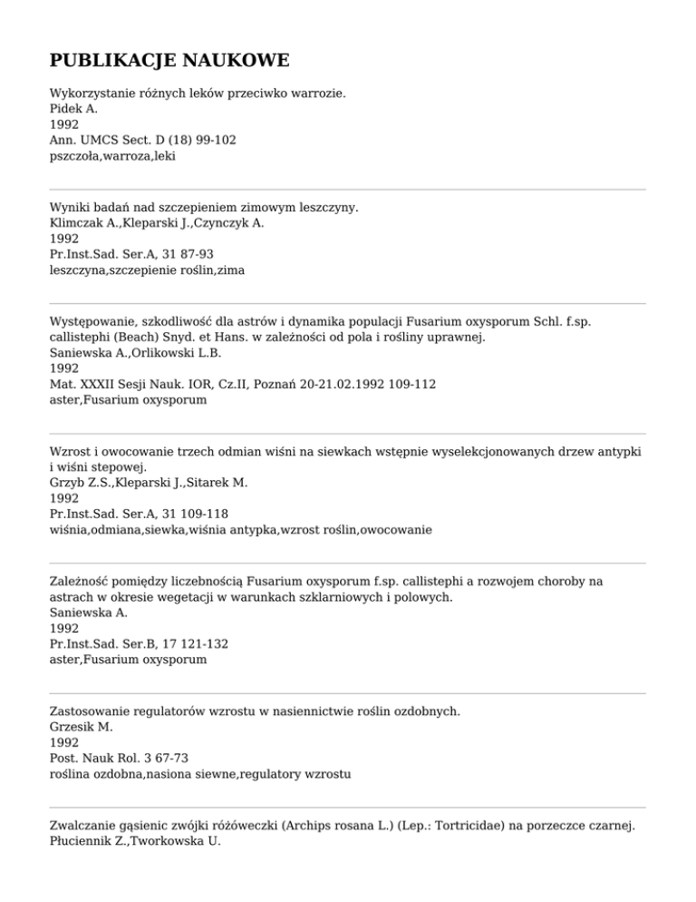 PUBLIKACJE NAUKOWE Wykorzystanie różnych leków przeciwko warrozie. Pidek A. 1992 Ann. UMCS Sect. D (18) 99-102 pszczoła,warroza,leki Wyniki badań nad szczepieniem zimowym leszczyny. Klimczak A.,Kleparski J.,Czynczyk A. 1992 Pr.Inst.Sad. Ser.A, 31 87-93 leszczyna,szczepienie roślin,zima Występowanie, szkodliwość dla astrów i dynamika populacji Fusarium oxysporum Schl. f.sp. callistephi (Beach) Snyd. et Hans. w zależności od pola i rośliny uprawnej. Saniewska A.,Orlikowski L.B. 1992 Mat. XXXII Sesji Nauk. IOR, Cz.II, Poznań 20-21.02.1992 109-112 aster,Fusarium oxysporum Wzrost i owocowanie trzech odmian wiśni na siewkach wstępnie wyselekcjonowanych drzew antypki i wiśni stepowej. Grzyb Z.S.,Kleparski J.,Sitarek M. 1992 Pr.Inst.Sad. Ser.A, 31 109-118 wiśnia,odmiana,siewka,wiśnia antypka,wzrost roślin,owocowanie Zależność pomiędzy liczebnością Fusarium oxysporum f.sp. callistephi a rozwojem choroby na astrach w okresie wegetacji w warunkach szklarniowych i polowych. Saniewska A. 1992 Pr.Inst.Sad. Ser.B, 17 121-132 aster,Fusarium oxysporum Zastosowanie regulatorów wzrostu w nasiennictwie roślin ozdobnych. Grzesik M. 1992 Post. Nauk Rol. 3 67-73 roślina ozdobna,nasiona siewne,regulatory wzrostu Zwalczanie gąsienic zwójki różóweczki (Archips rosana L.) (Lep.: Tortricidae) na porzeczce czarnej. Płuciennik Z.,Tworkowska U. 1992 Pr.Inst.Sad. Ser.A, 31 155-160 porzeczka czarna,szkodnik rośliny,zwójka,ochrona roślin Zwalczanie roztocza narcyzowca - Steneotarsonemus laticeps (Halb.) na hipeastrum. Łabanowski G.S.,Jaworski A. 1992 Pr.Inst.Sad. Ser.B, 17 179-188 zwartnica,roztocze,ochrona roślin A decrease of Venturia inaequalis (Cke) Aderh. sensitivity to fenarimol. Nowacka H. 1991 Fruit Sci.Rep. 18 (3) 139-142 jabłoń,choroba grzybowa roślin,Venturia,fungicydy,ochrona roślin Antimicrobial activity of propolis as affected by the conditions of its collection. Rybak-Chmielewska H.,Muszyńska J.,Konopacka Z. 1991 Pszczel.Zesz.Nauk. 35(1) 47-53 kit pszczeli