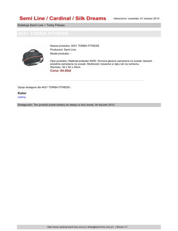 Semi Line / Cardinal / Silk Dreams Utworzono: czwartek, 01 marzec 2012 Kolekcja Semi Line > Torby Fitness 4031 TORBA FITNESS Nazwa produktu: 4031 TORBA FITNESS Producent: Semi Line Model produktu: Opis produktu: Materiał-poliester 600D. Komora głowna zamykana na suwak; kieszeń przednia zamykana na suwak. Możliwość noszenia w ręku lub na ramieniu. Wymiary: 30 x 52 x 25cm Cena: 64.00zł Opcje dostępne dla 4031 TORBA FITNESS : Kolor czarny. Dostępność: Ten produkt został dodany do sklepu w dniu środa, 04 styczeń 2012 http://www.cardinal.semi-line.com.pl | [email protected] | | Strona 1/1