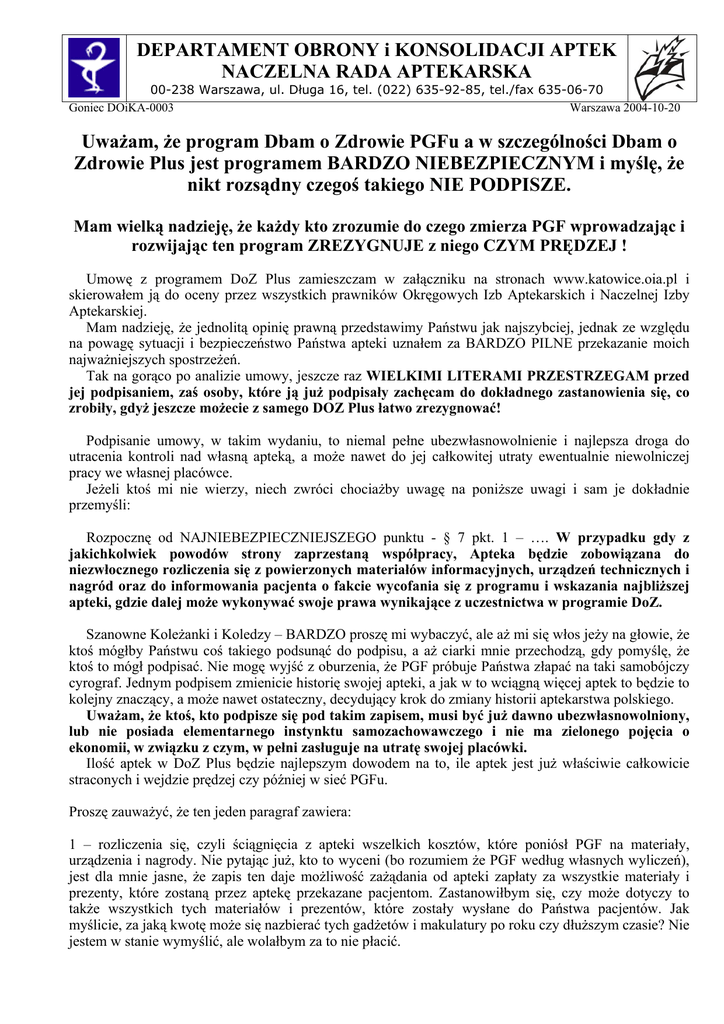 DEPARTAMENT OBRONY i KONSOLIDACJI APTEK NACZELNA RADA APTEKARSKA 00-238 Warszawa, ul. Długa 16, tel. (022) 635-92-85, tel./fax 635-06-70 Goniec DOiKA-0003 Warszawa 2004-10-20 Uważam, że program Dbam o Zdrowie PGFu a w szczególności Dbam o Zdrowie Plus jest programem BARDZO NIEBEZPIECZNYM i myślę, że nikt rozsądny czegoś takiego NIE PODPISZE. Mam wielką nadzieję, że każdy kto zrozumie do czego zmierza PGF wprowadzając i rozwijając ten program ZREZYGNUJE z niego CZYM PRĘDZEJ ! Umowę z programem DoZ Plus zamieszczam w załączniku na stronach www.katowice.oia.pl i skierowałem ją do oceny przez wszystkich prawników Okręgowych Izb Aptekarskich i Naczelnej Izby Aptekarskiej. Mam nadzieję, że jednolitą opinię prawną przedstawimy Państwu jak najszybciej, jednak ze względu na powagę sytuacji i bezpieczeństwo Państwa apteki uznałem za BARDZO PILNE przekazanie moich najważniejszych spostrzeżeń. Tak na gorąco po analizie umowy, jeszcze raz WIELKIMI LITERAMI PRZESTRZEGAM przed jej podpisaniem, zaś osoby, które ją już podpisały zachęcam do dokładnego zastanowienia się, co zrobiły, gdyż jeszcze możecie z samego DOZ Plus łatwo zrezygnować! Podpisanie umowy, w takim wydaniu, to niemal pełne ubezwłasnowolnienie i najlepsza droga do utracenia kontroli nad własną apteką, a może nawet do jej całkowitej utraty ewentualnie niewolniczej pracy we własnej placówce. Jeżeli ktoś mi nie wierzy, niech zwróci chociażby uwagę na poniższe uwagi i sam je dokładnie przemyśli: Rozpocznę od NAJNIEBEZPIECZNIEJSZEGO punktu - § 7 pkt. 1 – …. W przypadku gdy z jakichkolwiek powodów strony zaprzestaną współpracy, Apteka będzie zobowiązana do niezwłocznego rozliczenia się z powierzonych materiałów informacyjnych, urządzeń technicznych i nagród oraz do informowania pacjenta o fakcie wycofania się z programu i wskazania najbliższej apteki, gdzie dalej może wykonywać swoje prawa wynikające z uczestnictwa w programie DoZ. Szanowne Koleżanki i Koledzy – BARDZO proszę mi wybaczyć, ale aż mi się włos jeży na głowie, że ktoś mógłby Państwu coś takiego podsunąć do podpisu, a aż ciarki mnie przechodzą, gdy pomyślę, że ktoś to mógł podpisać. Nie mogę wyjść z oburzenia, że PGF próbuje Państwa złapać na taki samobójczy cyrograf. Jednym podpisem zmienicie historię swojej apteki, a jak w to wciągną więcej aptek to będzie to kolejny znaczący, a może nawet ostateczny, decydujący krok do zmiany historii aptekarstwa polskiego. Uważam, że ktoś, kto podpisze się pod takim zapisem, musi być już dawno ubezwłasnowolniony, lub nie posiada elementarnego instynktu samozachowawczego i nie ma zielonego pojęcia o ekonomii, w związku z czym, w pełni zasługuje na utratę swojej placówki. Ilość aptek w DoZ Plus będzie najlepszym dowodem na to, ile aptek jest już właściwie całkowicie straconych i wejdzie prędzej czy później w sieć PGFu. Proszę zauważyć, że ten jeden paragraf zawiera: 1 – rozliczenia się, czyli ściągnięcia z apteki wszelkich kosztów, które poniósł PGF na materiały, urządzenia i nagrody. Nie pytając już, kto to wyceni (bo rozumiem że PGF według własnych wyliczeń), jest dla mnie jasne, że zapis ten daje możliwość zażądania od apteki zapłaty za wszystkie materiały i prezenty, które zostaną przez aptekę przekazane pacjentom. Zastanowiłbym się, czy może dotyczy to także wszystkich tych materiałów i prezentów, które zostały wysłane do Państwa pacjentów. Jak myślicie, za jaką kwotę może się nazbierać tych gadżetów i makulatury po roku czy dłuższym czasie? Nie jestem w stanie wymyślić, ale wolałbym za to nie płacić. 2 – a na dodatek wszelkiego zła będziecie musieli informować swoich pacjentów, by poszli sobie do innej apteki. Nie mogę wyjść z oburzenia, że ktoś podsuwa Państwu coś takiego do podpisu. Może się ktoś na mnie obrazić, ale moje zdanie jest jednoznaczne – pod tym zapisem może się podpisać tylko desperat, bankrut lub ekonomiczny analfabeta. Jeżeli ja byłbym już na tyle nierozsądny i otumaniony, by wejść w program DoZ, to zrobiłbym wszystko, by powstał aneks do tej i poprzedniej umowy, usuwający takie zapisy jak powyższe i wprowadzający zapis: W przypadku, gdy z jakichkolwiek powodów strony zaprzestaną współpracy, dane osobowe pacjentów zebrane i przekazane przez aptekę zostaną usunięte z bazy PGF oraz nie będą miały miejsca żadne działania mogące kierować tych pacjentów do innej apteki. Walczcie o swoich pacjentów! Sprzedaliście ich za srebrniki, ale razem macie szansę ich odzyskać! O tej umowie i o bezpieczeństwie swojej apteki w programie DoZ porozmawiajcie z PGFem jak najszybciej, gdyż nadarza się na to wspaniała okazja. Wszyscy nieszczęśnicy złapani na ten szatański program i wybierający się do Pragi na dalsze uroczystości związane z propozycją jeszcze głębszego brnięcia w swoje nieszczęście, będą mieli dobrą okazję by o tym podyskutować i może zmienić. Podobno PGF chce kształtować ten program według życzeń aptekarzy – sprawdźcie to. Po tym, jaką postawę przyjmie PGF do Waszych postulatów zmiany umów, będziecie mogli się zorientować, w jakiej jesteście sytuacji i jak znaczący błąd popełniliście wchodząc w DoZ. Zastanówcie się także nad kilkoma innymi zapisami: § 5 punkt 2 – punkt chyba jest jasny dla wszystkich ale podejmując to zobowiązanie apteka staje się właśnie w 80% apteką PGFu , czyli jedną z aptek sieciowych (typu „Żabka” czy „McDonald”) złapanych przez PGF na lep DoZ. UWAGA – NIE ZNAJDUJĘ tu nigdzie żadnego zapewnienia o utrzymaniu wysokości rabatów, które apteka otrzymuje za zamawianie towaru czy o terminach płatności. Czy nie mogłoby się zdarzyć tak, że PGF wypowie aptece dotychczasowy rabat i skróci terminy płatności a Państwo i tak będziecie musieli zamawiać 80% towaru w cena