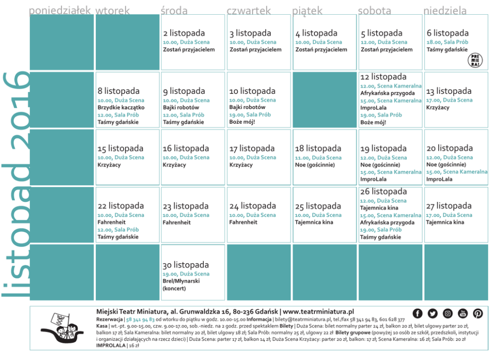 2016 poniedzia³ek wtorek œroda czwartek pi¹tek sobota niedziela 2 listopada 3 listopada 4 listopada 5 listopada 6 listopada 10.00, Du¿a Scena Zostañ przyjacielem 10.00, Du¿a Scena Zostañ przyjacielem 10.00, Du¿a Scena Zostañ przyjacielem 12.00, Du¿a Scena Zostañ przyjacielem 18.00, Sala Prób Taœmy gdañskie 12 listopada 12.00, Scena Kameralna 13 listopada Afrykañska przygoda 15.00, Scena Kameralna 17.00, Du¿a Scena Krzy¿acy ImproLala 19.00, Sala Prób Bo¿e mój! 8 listopada 9 listopada 10 listopada 10.00, Du¿a Scena Brzydkie kacz¹tko 12.00, Sala Prób Taœmy gdañskie 10.00, Du¿a Scena Bajki robotów 12.00, Sala Prób Taœmy gdañskie 10.00, Du¿a Scena Bajki robotów 19.00, Sala Prób Bo¿e mój! 15 listopada 16 listopada 17 listopada 18 listopada 19 listopada 20 listopada 10.00, Du¿a Scena Krzy¿acy 10.00, Du¿a Scena Krzy¿acy 10.00, Du¿a Scena Krzy¿acy 11.00, Du¿a Scena Noe (goœcinnie) 12.00, Du¿a Scena Noe (goœcinnie) 15.00, Scena Kameralna ImproLala 12.00, Du¿a Scena Noe (goœcinnie) 15.00, Scena Kameralna ImproLala 26 listopada 22 listopada 23 listopada 24 listopada 25 listopada 10.00, Du¿a Scena Fahrenheit 12.00, Sala Prób Taœmy gdañskie 10.00, Du¿a Scena Fahrenheit 10.00, Du¿a Scena Fahrenheit 10.00, Du¿a Scena Tajemnica kina 12.00, Du¿a Scena 27 listopada Tajemnica kina 15.00, Scena Kameralna 17.00, Du¿a Scena Tajemnica kina Afrykañska przygoda 19.00, Sala Prób Taœmy gdañskie 30 listopada 19.00, Du¿a Scena Brel/M³ynarski (koncert) Miejski Teatr Miniatura, al. Grunwaldzka 16, 80-236 Gdañsk | www.teatrminiatura.pl Rezerwacja | 58 341 94 83 od wtorku do pi¹tku w godz. 10.00-15.00 Informacja | [email protected], tel./fax 58 341 94 83, 601 628 377 Kasa | wt.-pt. 9.00-15.00, czw. 9.00-17.00, sob.-niedz. na 2 godz. przed spektaklem Bilety | Du¿a Scena: bilet normalny parter 24 z³, balkon 20 z³, bilet ulgowy parter 20 z³, balkon 17 z³; Sala Kameralna: bilet normalny 20 z³, bilet ulgowy 18 z³; Sala Prób: normalny 25 z³, ulgowy 22 z³ Bilety grupowe (powy¿ej 10 osób ze szkó³, przedszkoli, instytucji i organizacji dzia³aj¹cych na rzecz dzieci) | Du¿a Scena: parter 17 z³, balkon 14 z³; Du¿a Scena Krzy¿acy: parter 20 z³, balkon: 17 z³; Scena Kameralna: 16 z³; Sala Prób: 20 z³ IMPROLALA | 16 z³