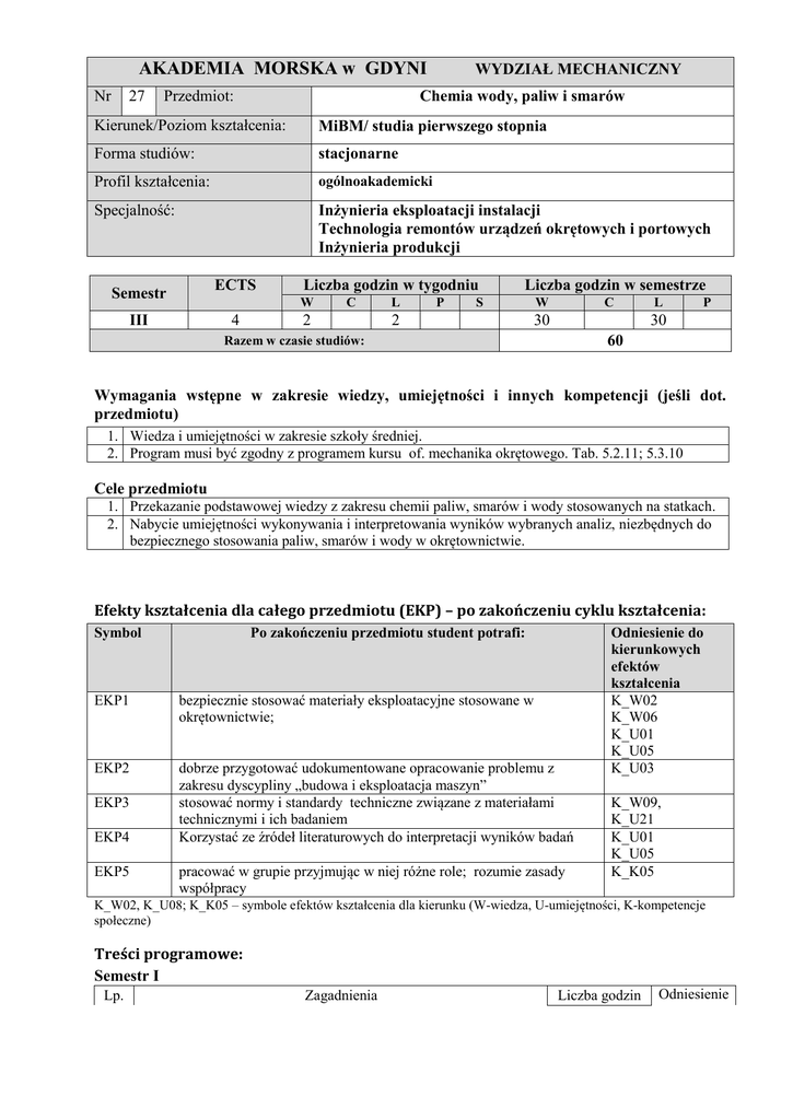 WYDZIAŁ MECHANICZNY AKADEMIA MORSKA w GDYNI Nr 27 Chemia wody, paliw i smarów Przedmiot: Kierunek/Poziom kształcenia: MiBM/ studia pierwszego stopnia Forma studiów: stacjonarne Profil kształcenia: ogólnoakademicki Specjalność: Inżynieria eksploatacji instalacji Technologia remontów urządzeń okrętowych i portowych Inżynieria produkcji ECTS Semestr Liczba godzin w tygodniu W 4 III C 2 L P Liczba godzin w semestrze S 2 W C 30 L P 30 Razem w czasie studiów: 60 Wymagania wstępne w zakresie wiedzy, umiejętności i innych kompetencji (jeśli dot. przedmiotu) 1. Wiedza i umiejętności w zakresie szkoły średniej. 2. Program musi być zgodny z programem kursu of. mechanika okrętowego. Tab. 5.2.11; 5.3.10 Cele przedmiotu 1. Przekazanie podstawowej wiedzy z zakresu chemii paliw, smarów i wody stosowanych na statkach. 2. Nabycie umiejętności wykonywania i interpretowania wyników wybranych analiz, niezbędnych do bezpiecznego stosowania paliw, smarów i wody w okrętownictwie. Efekty kształcenia dla całego przedmiotu (EKP) – po zakończeniu cyklu kształcenia: Po zakończeniu przedmiotu student potrafi: Symbol EKP1 bezpiecznie stosować materiały eksploatacyjne stosowane w okrętownictwie; EKP2 dobrze przygotować udokumentowane opracowanie problemu z zakresu dyscypliny „budowa i eksploatacja maszyn” stosować normy i standardy techniczne związane z materiałami technicznymi i ich badaniem Korzystać ze źródeł literaturowych do interpretacji wyników badań EKP3 EKP4 EKP5 pracować w grupie przyjmując w niej różne role; rozumie zasady współpracy Odniesienie do kierunkowych efektów kształcenia K_W02 K_W06 K_U01 K_U05 K_U03 K_W09, K_U21 K_U01 K_U05 K_K05 K_W02, K_U08; K_K05 – symbole efektów kształcenia dla kierunku (W-wiedza, U-umiejętności, K-kompetencje społeczne) Treści programowe: Semestr I Lp. Zagadnienia Liczba godzin Odniesienie W 1. 2. 3. 4. 5. 6. Rodzaje i właściwości paliw okrętowych: (5.3.10. p.1) a) gęstość, b) lepkość, c) temperatura zapłonu i samozapłonu, d) zanieczyszczenia paliw, e) klasyfikacja paliw. Rodzaje i właściwości olejów smarowych: a) gęstość, b) lepkość, c) temperatura zapłonu i samozapłonu, d) zanieczyszczenia olejów, e) klasyfikacja i zastosowanie olejów. Smary - klasyfikacja i zastosowanie. Bezpieczeństwo pracy z produktami ropopochodnymi. Właściwości wody używanej na statku: a) woda morska, b) woda sanitarna, c) woda pitna, d woda techniczna. Wody naturalne: podział, zanieczyszczenia, wskaźniki jakości wody, metody analizy, sposoby uzdatniania. Woda spożywcza i sanitarna na statkach. (5.2.11. p.7) 7. Wody przemysłowe: rodzaje, zanieczyszczenia oraz wymagania dla wody kotłowej’ i zasilającej kotły oraz dla wody chłodzącej’. 8. Podstawowe parametry i wielkości fizykochemiczne wody technicznej stosowanej na statkach, charakterystyka jej jakości: a) cel, b) metodyka, c) chemiczne oznaczania, d) znaczenie eksploatacyjne: - gęstość wody, - przewodnictwo właściwe, - wykładnik stężenia jonów wodorowych - pH, - alkaliczność i twardość wody, - zawartość tlenu i amoniaku, - zawartość agresywnego dwutlenku węgla, jonów chlorkowych, fosforanów, siarczanów, azotanów i hydrazyny, - zawartość chromu, żelaza ogólnego, krzemionki, - utlenialność wody. Woda techniczna na statku - słodka i morska: (5.2.11. p.8) - wymagania dla poszczególnych rodzajów wody, - sposoby uzdatniania wody w instalacjach chłodzenia. Wpływ zanieczyszczeń wody na pracę urządzeń kotłowych oraz na stan układu chłodzenia silników okrętowych: a) osady i kamień kotłowy - przyczyny powstawania, rodzaje, właściwości, szkodliwość i metody usuwania, b) preparaty zmiękczające stosowane do wewnątrzkotłowego uzdatniania wody, c) korozja urządzeń kotłowych, procesy korozyjne i kawitacja układów chłodzenia silników okrętowych, d) rodzaje korozji, mechanizm jej przebiegu oraz zapobieganie, e) preparaty zmiękczające oraz inhibitory korozji stosowane do układów chłodzenia silników okrętowych. 9. C L/P do EK dla przedmiotu EKP1 EKP4 EKP5 1 2 1 2 EKP2 EKP4 EKP5 1 1 EKP1 EKP1 EKP1 2 EKP1 EKP4 EKP5 EKP1 EKP4 EKP5 EKP1 EKP3 EKP4 EKP5 1 1 2 1 2 1 1 EKP1 EKP2 EKP5 10. 11. 12. 13. 14. 15. 16. 17. Rodzaje wody na statkach - właściwości i wymagania: woda morska, woda kotłowa i zasilająca kotły, woda chłodząca silniki okrętowe, woda konsumpcyjna i sanitarna, woda zęzowa i balastowa, ścieki sanitarno-bytowe. Pienienie się wody w kotle: przyczyny, szkodliwość oraz środki zapobiegawcze. 1 0,5 Badania testowe wody na statkach: testowanie podstawowych 1,5 parametrów fizykochemicznych wody kotłowej i chłodzącej silniki okrętowe za pomocą przenośnych zestawów laboratoryjnych. Ropa naftowa: a) pochodzenie, skład, przerób zachowawczy i destrukcyjny, b) otrzymywanie paliw płynnych i produktów smarowych z ropy naftowej oraz na drodze syntez chemicznych, c) wpływ metody przerobu ropy naftowej oraz sposobu otrzymywania paliw na ich właściwości użytkowe. Charakterystyka i klasyfikacja paliw płynnych: 1 a) własności fizykochemiczne benzyn, olejów napędowych i olejów opałowych oraz wskaźniki ich jakości (LO, LC, wartość opałowa), b) paliwa stosowane w silnikach okrętowych: rodzaje i właściwości fizykochemiczne paliw, zawartość metali, właściwości korozyjne produktów spalania paliw i zdolność do tworzenia nagarów. Klasyfikacja i specyfikacja paliw żeglugowych: 3 a) typy i rodzaje paliw żeglugowych oraz ich symbole klasyfikacyjne, klasyfikacja paliw destylacyjnych i pozostałościowych, b) wpływ dodatków do paliw na ich właściwości użytkowe, c) badania testowe podstawowych parametrów fizykochemicznych i użytkowych paliw na statkach za pomocą przenośnych zestawów laboratoryjnych. Charakterystyka i klasyfikacja olejów smarowych: 1 a) właściwości fizykochemiczne i rodzaje olejów smarowych według ich zastosowania w okrętownictw