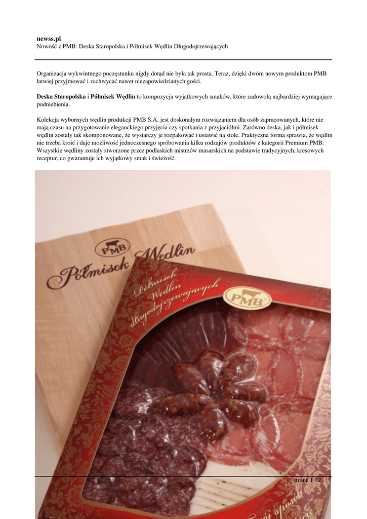 newss.pl Nowość z PMB: Deska Staropolska i Półmisek Wędlin Długodojrzewających Organizacja wykwintnego poczęstunku nigdy dotąd nie była tak prosta. Teraz, dzięki dwóm nowym produktom PMB łatwiej przyjmować i zachwycać nawet niezapowiedzianych gości. Deska Staropolska i Półmisek Wędlin to kompozycja wyjątkowych smaków, które zadowolą najbardziej wymagające podniebienia. Kolekcja wybornych wędlin produkcji PMB S.A. jest doskonałym rozwiązaniem dla osób zapracowanych, które nie mają czasu na przygotowanie eleganckiego przyjęcia czy spotkania z przyjaciółmi. Zarówno deska, jak i półmisek wędlin zostały tak skomponowane, że wystarczy je rozpakować i ustawić na stole. Praktyczna forma sprawia, że wędlin nie trzeba kroić i daje możliwość jednoczesnego spróbowania kilku rodzajów produktów z kategorii Premium PMB. Wszystkie wędliny zostały stworzone przez podlaskich mistrzów masarskich na podstawie tradycyjnych, kresowych receptur, co gwarantuje ich wyjątkowy smak i świeżość. strona 1 / 2 newss.pl Nowość z PMB: Deska Staropolska i Półmisek Wędlin Długodojrzewających Deska Staropolska to zestaw 11 wędlin. W jego skład wchodzi: Carpaccio wołowe długodojrzewające, Kumpiak, Kindziuk tradycyjny, Kindziuk koktajlowy, Kindziuk z papryką, Salami wiejskie, Salami cygańskie, Karczek długodojrzewający, Boczek długodojrzewający i Słonina białowieska. Deska kosztuje ok. 30 zł. Półmisek Wędlin Długodojrzewających jest nieco mniejszą wersją Deski Staropolskiej. Składa się on z produktów: Kindziuka tradycyjnego, Słoniny białowieskiej, Kindziuka koktajlowego, Salami wiejskiego i Carpaccio wołowego. Cena netto zestawu to około 17 zł. Zarówno Deska Staropolska, jak i Półmisek Wędlin Długodojrzewających PMB pozwalają poznać całą paletę smaków przy zakupie zaledwie jednego zestawu. Oba produkty świetnie przechowują się w lodówce i są doskonałym rozwiązaniem na wypadek wizyty niezapowiedzianych gości. Deskę Staropolską i Półmisek Wędlin Długodojrzewających PMB można kupić w sieci Delikatesów „U Rzeźnika” i w każdym dobrym sklepie spożywczym na terenie całego kraju. CUMULUS strona 2 / 2
