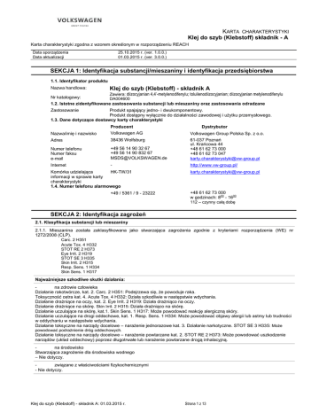 KARTA CHARAKTERYSTYKI Klej do szyb (Klebstoff) składnik - A Karta charakterystyki zgodna z wzorem określonym w rozporządzeniu REACH Data sporządzenia Data aktualizacji 25.10.2015 r. (ver. 1.0.0.) 01.03.2015 r. (ver. 3.0.0.) SEKCJA 1: Identyfikacja substancji/mieszaniny i identyfikacja przedsiębiorstwa 1.1. Identyfikator produktu Nazwa handlowa: Klej do szyb (Klebstoff) - składnik A Zawiera: diizocyjanian 4,4’-metylenodifenylu; toluilenodiizocyjanian; diizocyjanian metylenodifenylu Nr katalogowy: DA004600 1.2. Istotne zidentyfikowane zastosowania substancji lub mieszaniny oraz zastosowania odradzane Produkt spajający jedno- i dwukomponentowy. Produkt dostępny wyłącznie do działalności zawodowej i użytku przemysłowego. 1.3. Dane dotyczące dostawcy karty charakterystyki Zastosowanie Producent Dystrybutor Nazwa/imię i nazwisko Volkswagen AG Volkswagen Group Polska Sp. z o.o. Adres 38436 Wolfsburg Numer telefonu Numer faksu e-mail +49 56 14 90 32 67 +49 56 14 90 832 67 [email protected] 61-037 Poznań ul. Krańcowa 44 +48 61 62 73 000 +48 61 62 73 047 [email protected] Internet - http://www.vw-group.pl/ Komórka udzielająca HK-TW/31 informacji w sprawie karty charakterystyki 1.4. Numer telefonu alarmowego +49 / 5361 / 9 - 23222 [email protected] +48 61 62 73 000 w godzinach: 800 - 1600 112 – czynny całą dobę SEKCJA 2: Identyfikacja zagrożeń 2.1. Klasyfikacja substancji lub mieszaniny 2.1.1. Mieszanina została zaklasyfikowana jako stwarzająca zagrożenia zgodnie z kryteriami rozporządzenia (WE) nr 1272/2008 (CLP). Carc. 2 H351 Acute Tox. 4 H332 STOT RE 2 H373 Eye Irrit. 2 H319 STOT SE 3 H335 Skin Irrit. 2 H315 Resp. Sens. 1 H334 Skin Sens. 1 H317 Najważniejsze szkodliwe skutki działania: na zdrowie człowieka Działanie rakotwórcze, kat. 2. Carc. 2 H351: Podejrzewa się, że powoduje raka. Toksyczność ostra kat. 4. Acute Tox. 4 H332: Działa szkodliwie w następstwie wdychania. Działanie drażniące na oczy, kat. 2. Eye Irrit. 2 H319: Działa drażniąco na oczy. Działanie drażniące na skórę. Skin Irrit. 2 H315: Działa drażniąco na skórę. Działanie uczulające na skórę, kat.1. Skin Sens. 1 H317: Może powodować reakcję alergiczną skóry. Działanie uczulające na drogi oddechowe, kat. 1. Resp. Sens. 1 H334: Może powodować objawy alergii lub astmy lub trudności w oddychaniu w następstwie wdychania. Działanie toksyczne na narządy docelowe – narażenie jednorazowe kat. 3. Działanie narkotyczne. STOT SE 3 H335: Może powodować podrażnienie dróg oddechowych. Działanie toksyczne na narządy docelowe – narażenie powtarzane kat. 2. STOT RE 2 H373: Może powodować uszkodzenie narządów (układ oddechowy) poprzez długotrwałe lub narażenie powtarzane drogą inhalacyjną. na środowisko Stwarzająca zagrożenie dla środowiska wodnego – Nie dotyczy. związane z właściwościami fizykochemicznymi - Nie dotyczy. Klej do szyb (Klebstoff) - składnik A: 01.03.2015 r. Strona 1 z 13 KARTA CHARAKTERYSTYKI Klej do szyb (Klebstoff) składnik - A SEKCJA 2: Identyfikacja zagrożeń 2.1.2. Mieszanina została zaklasyfikowana jako niebezpieczna zgodnie z kryteriami dyrektywy 1999/45/WE. Rakotwórcza kat. 3 Carc. Cat. 3; R40 Szkodliwa Xn; R48/20 Uczulająca R42/43 Drażniąca Xi; R36/37/38 2.2. Elementy oznakowania Oznakowanie zgodnie z rozporządzeniem (WE) nr 1272/2008 (CLP): Piktogramy określające rodzaj zagrożenia: GHS08 GHS07 Hasło ostrzegawcze: Niebezpieczeństwo. Zwroty wskazujące rodzaj zagrożenia: H332: Działa szkodliwie w następstwie wdychania. H319: Działa drażniąco na oczy. H315: Działa drażniąco na skórę. H317: Może powodować reakcję alergiczną skóry. H334: Może powodować objawy alergii lub astmy lub trudności w oddychaniu w następstwie wdychania. H335: Może powodować podrażnienie dróg oddechowych. H373: Może powodować uszkodzenie narządów (układ oddechowy) poprzez długotrwałe lub narażenie powtarzane drogą inhalacyjną. Zwroty wskazujące środki ostrożności: P261: Unikać wdychania par. P280: Stosować rękawice ochronne/odzież ochronną/ochronę oczu. P285: W przypadku niedostatecznej wentylacji stosować indywidualne środki ochrony dróg oddechowych. P304+P341: W PRZYPADKU DOSTANIA SIĘ DO DRÓG ODDECHOWYCH: W przypadku trudności z oddychaniem, wyprowadzić lub wynieść poszkodowanego na świeże powietrze i zapewnić warunki do odpoczynku w pozycji umożliwiającej swobodne oddychanie. P342 + P311: W przypadku wystąpienia objawów ze strony układu oddechowego: Skontaktować się z OŚRODKIEM ZATRUĆ lub lekarzem. P501: Zawartość/pojemnik usuwać na składowiska odpadów niebezpiecznych, zgodnie z przepisami miejscowymi/regionalnymi/narodowymi/międzynarodowymi. Informacje uzupełniające o zagrożeniach: Zawiera izocyjaniany. Może powodować wystąpienie reakcji alergicznej. Produkt przeznaczony wyłącznie do użytku zawodowego. W celu powszechnej sprzedaży, oznakowanie opakowania powinno być opatrzone widocznym, czytelnym i nieusuwalnym napisem o treści: „Stosowanie tego produktu może wywoływać reakcje alergiczne u osób uczulonych na diizocyjaniany. — Osoby cierpiące na astmę, egzemę lub dolegliwości skórne powinny unikać kontaktu, w tym kontaktu skórnego, z tym produktem. — Ten produkt nie powinien być stosowany przy słabej wentylacji, chyba że stosowana jest maska ochronna z odpowiednim filtrem przeciwgazowym (np. typu A1 zgodnie z normą EN 14387).” Podczas pracy z mieszaniną nie zbliżać twarzy ani nie wdychać par znad otwartego opakowania. Etykieta powinna zawierać identyfikator produktu, o którym mowa w art. 18 rozp. CLP oraz nazwę, adres i telefon dostawcy danej mieszaniny. Dane identyfikujące wszystkie substancje w mieszaninie , które decydują o jej zaklasyfikowaniu zgodnie z Art. 18 pkt. 3b. Zawiera: diizocyjanian 4,4’-metylenodifenylu; toluilenodiizocyjanian; diizocyjanian metylenodifenylu 2.3. Inne zagrożenia 2.3.1 Ocena PBT lub v