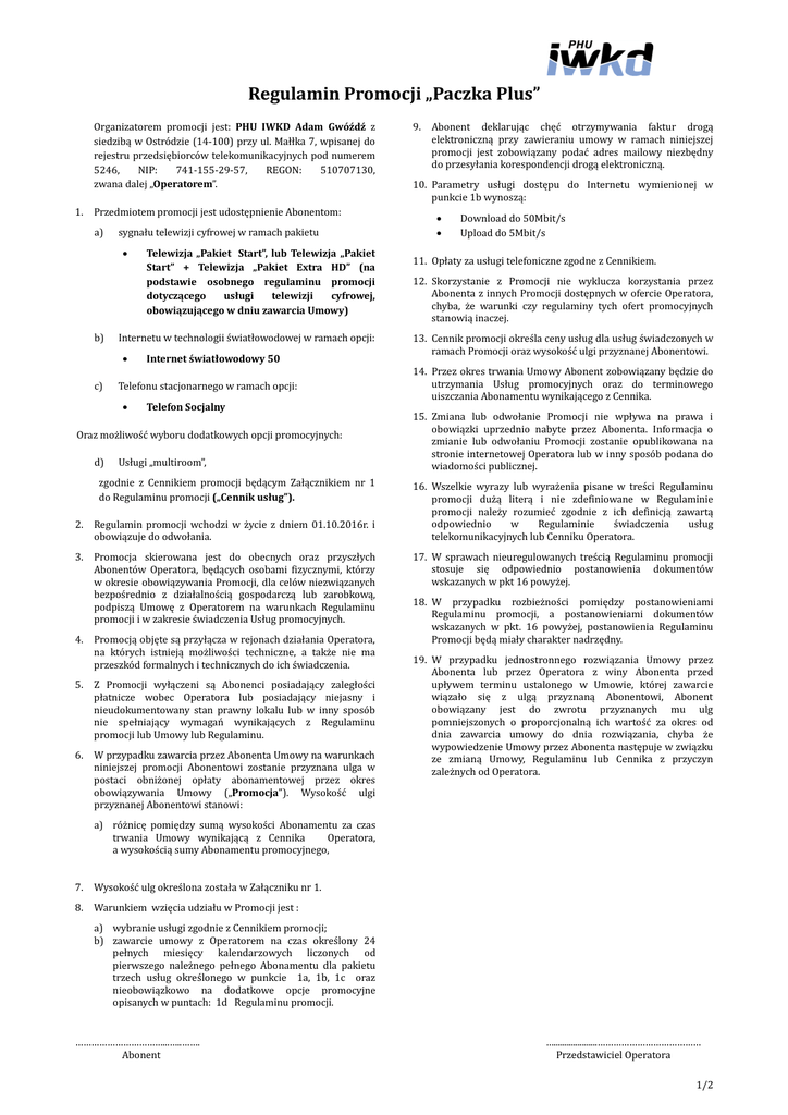 Regulamin Promocji „Paczka Plus” Organizatorem promocji jest: PHU IWKD Adam Gwóźdź z siedzibą w Ostródzie (14-100) przy ul. Małłka 7, wpisanej do rejestru przedsiębiorców telekomunikacyjnych pod numerem 5246, NIP: 741-155-29-57, REGON: 510707130, zwana dalej „Operatorem”. 1. Przedmiotem promocji jest udostępnienie Abonentom: a) sygnału telewizji cyfrowej w ramach pakietu • b) Internetu w technologii światłowodowej w ramach opcji: • c) Telewizja „Pakiet Start”, lub Telewizja „Pakiet Start” + Telewizja „Pakiet Extra HD” (na podstawie osobnego regulaminu promocji dotyczącego usługi telewizji cyfrowej, obowiązującego w dniu zawarcia Umowy) Internet światłowodowy 50 Telefonu stacjonarnego w ramach opcji: • Telefon Socjalny Oraz możliwość wyboru dodatkowych opcji promocyjnych: d) Usługi „multiroom”, zgodnie z Cennikiem promocji będącym Załącznikiem nr 1 do Regulaminu promocji („Cennik usług”). 2. Regulamin promocji wchodzi w życie z dniem 01.10.2016r. i obowiązuje do odwołania. 3. Promocja skierowana jest do obecnych oraz przyszłych Abonentów Operatora, będących osobami fizycznymi, którzy w okresie obowiązywania Promocji, dla celów niezwiązanych bezpośrednio z działalnością gospodarczą lub zarobkową, podpiszą Umowę z Operatorem na warunkach Regulaminu promocji i w zakresie świadczenia Usług promocyjnych. 4. Promocją objęte są przyłącza w rejonach działania Operatora, na których istnieją możliwości techniczne, a także nie ma przeszkód formalnych i technicznych do ich świadczenia. 5. Z Promocji wyłączeni są Abonenci posiadający zaległości płatnicze wobec Operatora lub posiadający niejasny i nieudokumentowany stan prawny lokalu lub w inny sposób nie spełniający wymagań wynikających z Regulaminu promocji lub Umowy lub Regulaminu. 6. W przypadku zawarcia przez Abonenta Umowy na warunkach niniejszej promocji Abonentowi zostanie przyznana ulga w postaci obniżonej opłaty abonamentowej przez okres obowiązywania Umowy („Promocja”). Wysokość ulgi przyznanej Abonentowi stanowi: 9. Abonent deklarując chęć otrzymywania faktur drogą elektroniczną przy zawieraniu umowy w ramach niniejszej promocji jest zobowiązany podać adres mailowy niezbędny do przesyłania korespondencji drogą elektroniczną. 10. Parametry usługi dostępu do Internetu wymienionej w punkcie 1b wynoszą: • • Download do 50Mbit/s Upload do 5Mbit/s 11. Opłaty za usługi telefoniczne zgodne z Cennikiem. 12. Skorzystanie z Promocji nie wyklucza korzystania przez Abonenta z innych Promocji dostępnych w ofercie Operatora, chyba, że warunki czy regulaminy tych ofert promocyjnych stanowią inaczej. 13. Cennik promocji określa ceny usług dla usług świadczonych w ramach Promocji oraz wysokość ulgi przyznanej Abonentowi. 14. Przez okres trwania Umowy Abonent zobowiązany będzie do utrzymania Usług promocyjnych oraz do terminowego uiszczania Abonamentu wynikającego z Cennika. 15. Zmiana lub odwołanie Promocji nie wpływa na prawa i obowiązki uprzednio nabyte przez Abonenta. Informacja o zmianie lub odwołaniu Promocji zostanie opublikowana na stronie internetowej Operatora lub w inny sposób podana do wiadomości publicznej. 16. Wszelkie wyrazy lub wyrażenia pisane w treści Regulaminu promocji dużą literą i nie zdefiniowane w Regulaminie promocji należy rozumieć zgodnie z ich definicją zawartą odpowiednio w Regulaminie świadczenia usług telekomunikacyjnych lub Cenniku Operatora. 17. W sprawach nieuregulowanych treścią Regulaminu promocji stosuje się odpowiednio postanowienia dokumentów wskazanych w pkt 16 powyżej. 18. W przypadku rozbieżności pomiędzy postanowieniami Regulaminu promocji, a postanowieniami dokumentów wskazanych w pkt. 16 powyżej, postanowienia Regulaminu Promocji będą miały charakter nadrzędny. 19. W przypadku jednostronnego rozwiązania Umowy przez Abonenta lub przez Operatora z winy Abonenta przed upływem terminu ustalonego w Umowie, której zawarcie wiązało się z ulgą przyznaną Abonentowi, Abonent obowiązany jest do zwrotu przyznanych mu ulg pomniejszonych o proporcjonalną ich wartość za okres od dnia zawarcia umowy do dnia rozwiązania, chyba że wypowiedzenie Umowy przez Abonenta następuje w związku ze zmianą Umowy, Regulaminu lub Cennika z przyczyn zależnych od Operatora. a) różnicę pomiędzy sumą wysokości Abonamentu za czas trwania Umowy wynikającą z Cennika Operatora, a wysokością sumy Abonamentu promocyjnego, 7. Wysokość ulg określona została w Załączniku nr 1. 8. Warunkiem wzięcia udziału w Promocji jest : a) wybranie usługi zgodnie z Cennikiem promocji; b) zawarcie umowy z Operatorem na czas określony 24 pełnych miesięcy kalendarzowych liczonych od pierwszego należnego pełnego Abonamentu dla pakietu trzech usług określonego w punkcie 1a, 1b, 1c oraz nieobowiązkowo na dodatkowe opcje promocyjne opisanych w puntach: 1d Regulaminu promocji. ……………………………...…..……. Abonent …....................………………………………… Przedstawiciel Operatora 1/2 Załącznik nr 1 do Regulaminu Promocji „Paczka Plus” Cennik promocji „Paczka Plus” 1. Miesięczne opłaty abonamentowe dla paczki z Telewizją Start: lp. Pakiet Abonament standardowy Abonament promocyjny Ulga miesięczna Suma przyznanych ulg 1. Internet Światłowodowy 50 99,00 zł 14,90 zł 84,10 zł 2018,40 zł 2. Telefon Socjalny 30,00 zł 0,00 zł 30,00 zł 720,00 zł 49,20 zł 14,99 zł 34,21 zł 821,04 zł 3. Usługa Multiroom (za każdy dodatkowy dekoder) 2. Miesięczne opłaty abonamentowe dla Paczki z Telewizją Start+Extra HD: lp. Pakiet Abonament standardowy Abonament promocyjny Ulga miesięczna Suma przyznanych ulg 1. Internet Światłowodowy 50 99,00 zł 5,00 zł 94,00 zł 2256,00 zł 2. Telefon Socjalny 30,00 zł 0,00 zł 30,00 zł 720,00 zł 49,20 zł 14,99 zł 34,21 zł 821,04 zł 3. Usługa Multiroom (za każdy do