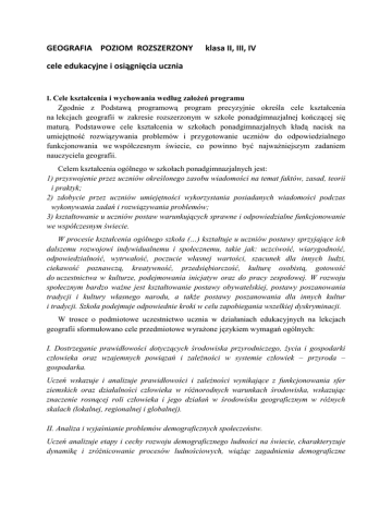 GEOGRAFIA POZIOM ROZSZERZONY klasa II, III, IV cele edukacyjne i osiągnięcia ucznia I. Cele kształcenia i wychowania według załoŜeń programu Zgodnie z Podstawą programową program precyzyjnie określa cele kształcenia na lekcjach geografii w zakresie rozszerzonym w szkole ponadgimnazjalnej kończącej się maturą. Podstawowe cele kształcenia w szkołach ponadgimnazjalnych kładą nacisk na umiejętność rozwiązywania problemów i przygotowanie uczniów do odpowiedzialnego funkcjonowania we współczesnym świecie, co powinno być najwaŜniejszym zadaniem nauczyciela geografii. Celem kształcenia ogólnego w szkołach ponadgimnazjalnych jest: 1) przyswojenie przez uczniów określonego zasobu wiadomości na temat faktów, zasad, teorii i praktyk; 2) zdobycie przez uczniów umiejętności wykorzystania posiadanych wiadomości podczas wykonywania zadań i rozwiązywania problemów; 3) kształtowanie u uczniów postaw warunkujących sprawne i odpowiedzialne funkcjonowanie we współczesnym świecie. W procesie kształcenia ogólnego szkoła (…) kształtuje u uczniów postawy sprzyjające ich dalszemu rozwojowi indywidualnemu i społecznemu, takie jak: uczciwość, wiarygodność, odpowiedzialność, wytrwałość, poczucie własnej wartości, szacunek dla innych ludzi, ciekawość poznawczą, kreatywność, przedsiębiorczość, kulturę osobistą, gotowość do uczestnictwa w kulturze, podejmowania inicjatyw oraz do pracy zespołowej. W rozwoju społecznym bardzo waŜne jest kształtowanie postawy obywatelskiej, postawy poszanowania tradycji i kultury własnego narodu, a takŜe postawy poszanowania dla innych kultur i tradycji. Szkoła podejmuje odpowiednie kroki w celu zapobiegania wszelkiej dyskryminacji. W trosce o podmiotowe uczestnictwo ucznia w działaniach edukacyjnych na lekcjach geografii sformułowano cele przedmiotowe wyraŜone językiem wymagań ogólnych: I. Dostrzeganie prawidłowości dotyczących środowiska przyrodniczego, Ŝycia i gospodarki człowieka oraz wzajemnych powiązań i zaleŜności w systemie człowiek – przyroda – gospodarka. Uczeń wskazuje i analizuje prawidłowości i zaleŜności wynikające z funkcjonowania sfer ziemskich oraz działalności człowieka w róŜnorodnych warunkach środowiska, wskazując znaczenie rosnącej roli człowieka i jego działań w środowisku geograficznym w róŜnych skalach (lokalnej, regionalnej i globalnej). II. Analiza i wyjaśnianie problemów demograficznych społeczeństw. Uczeń analizuje etapy i cechy rozwoju demograficznego ludności na świecie, charakteryzuje dynamikę i zróŜnicowanie procesów ludnościowych, wiąŜąc zagadnienia demograficzne z czynnikami przyrodniczymi i rozwojem cywilizacyjnym; wykorzystuje do analiz informacje o aktualnych wydarzeniach na świecie. III. Proponowanie rozwiązań problemów występujących w środowisku geograficznym, zgodnie z koncepcją zrównowaŜonego rozwoju i zasadami współpracy, w tym międzynarodowej. Uczeń wskazuje propozycje rozwiązań lokalnych, regionalnych i globalnych problemów środowiskowych, demograficznych i gospodarczych zgodnych z koncepcją zrównowaŜonego rozwoju oraz opartych na równoprawnych zasadach współpracy między regionami i państwami. IV. Pozyskiwanie, przetwarzanie oraz prezentowanie informacji na podstawie róŜnych źródeł informacji geograficznej, w tym równieŜ technologii informacyjno-komunikacyjnych oraz Geograficznych Systemów Informacyjnych (GIS). Uczeń zdobywa informacje oraz rozwija i doskonali umiejętności geograficzne, wykorzystując wszystkie dostępne (w tym najnowsze) źródła informacji, pomiary i obserwacje bezpośrednie; potrafi selekcjonować i przetwarzać informacje do prezentacji wybranych zagadnień. W koncepcji programu przyjęto, Ŝe edukacja geograficzna w zakresie rozszerzonym w liceum ogólnokształcącym i technikum, wspomagając rozwój ucznia jako osoby i wprowadzając go w Ŝycie społeczne, ma na celu przede wszystkim: W sferze wiedzy i rozumienia: 1. utrwalenie podstawowych terminów geograficznych, umoŜliwiających zrozumienie omawianych zagadnień; 2. poznanie podstawowych metod badań geograficznych, a takŜe interpretacji oraz prezentacji uzyskanych wyników; 3. poznanie i zrozumienie współzaleŜności między elementami środowiska przyrodniczego w skali lokalnej, regionalnej oraz globalnej; 4. poznanie i opisywanie zjawisk oraz procesów zachodzących w środowisku przyrodniczym Polski w róŜnych skalach przestrzennych i czasowych; 5. poznanie miejsc i obszarów, w których obrębie zachodzą róŜnorodne procesy przyrodnicze i społeczno-ekonomiczne w skali lokalnej, regionalnej, globalnej oraz czasowej; 6. poznanie przyczyn warunkujących róŜne sposoby gospodarowania w środowisku geograficznym; 7. poznanie i zrozumienie wybranych problemów społeczno-gospodarczych w skali lokalnej, regionalnej i globalnej; 8. poznanie procesów społecznych i gospodarczych zachodzących współcześnie w Polsce; 9. poznanie dziedzictwa kultury regionalnej i narodowej oraz postrzeganie go w perspektywie kultury europejskiej oraz światowej; 10. poznanie trwałych i zmiennych preferencji wyborczych w Polsce oraz zrozumienie przyczyn ich przestrzennego zróŜnicowania; 2 11. poznanie zasad rozwoju osobowego i Ŝycia społecznego; 12. zrozumienie i opisywanie zjawisk oraz procesów zachodzących w środowisku geograficznym w skali lokalnej, regionalnej i globalnej; 13. zrozumienie interakcji zachodzących w układzie człowiek – środowisko geograficzne w skali lokalnej, regionalnej oraz globalnej; 14. zrozumienie złoŜoności świata, współzaleŜności jego poszczególnych elementów i gotowość do udziału w jego przekształcaniu zgodnie z zasadą zrównowaŜonego rozwoju; 15. dostrzeganie róŜnego rodzaju związków i zaleŜności (przyczynowo-skutkowych, funkcjonalnych, czasowych i przestrzennych); 16. rozszerzenie i ugruntowanie wiedzy niezbędnej do zrozumienia istoty 